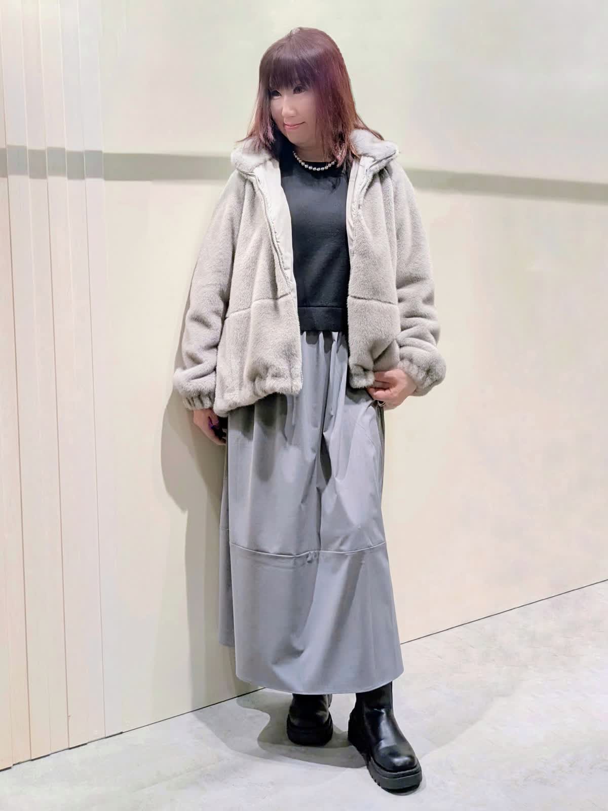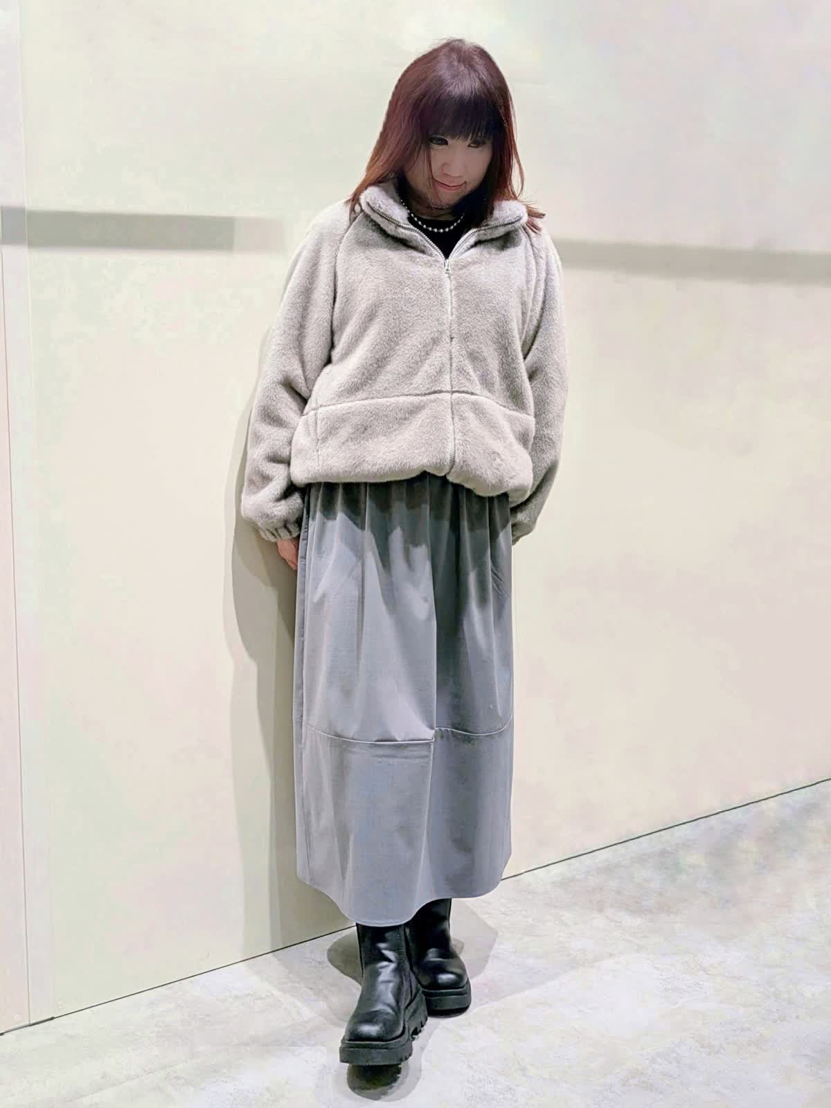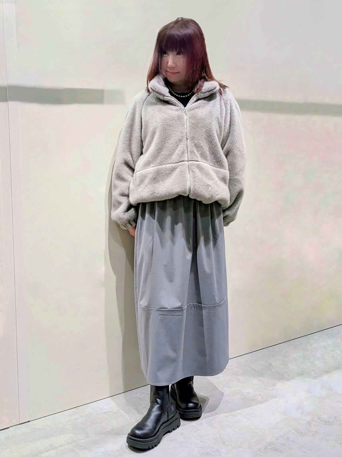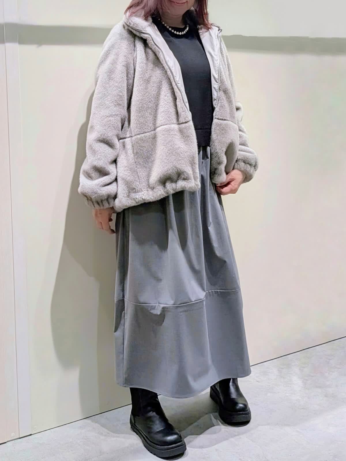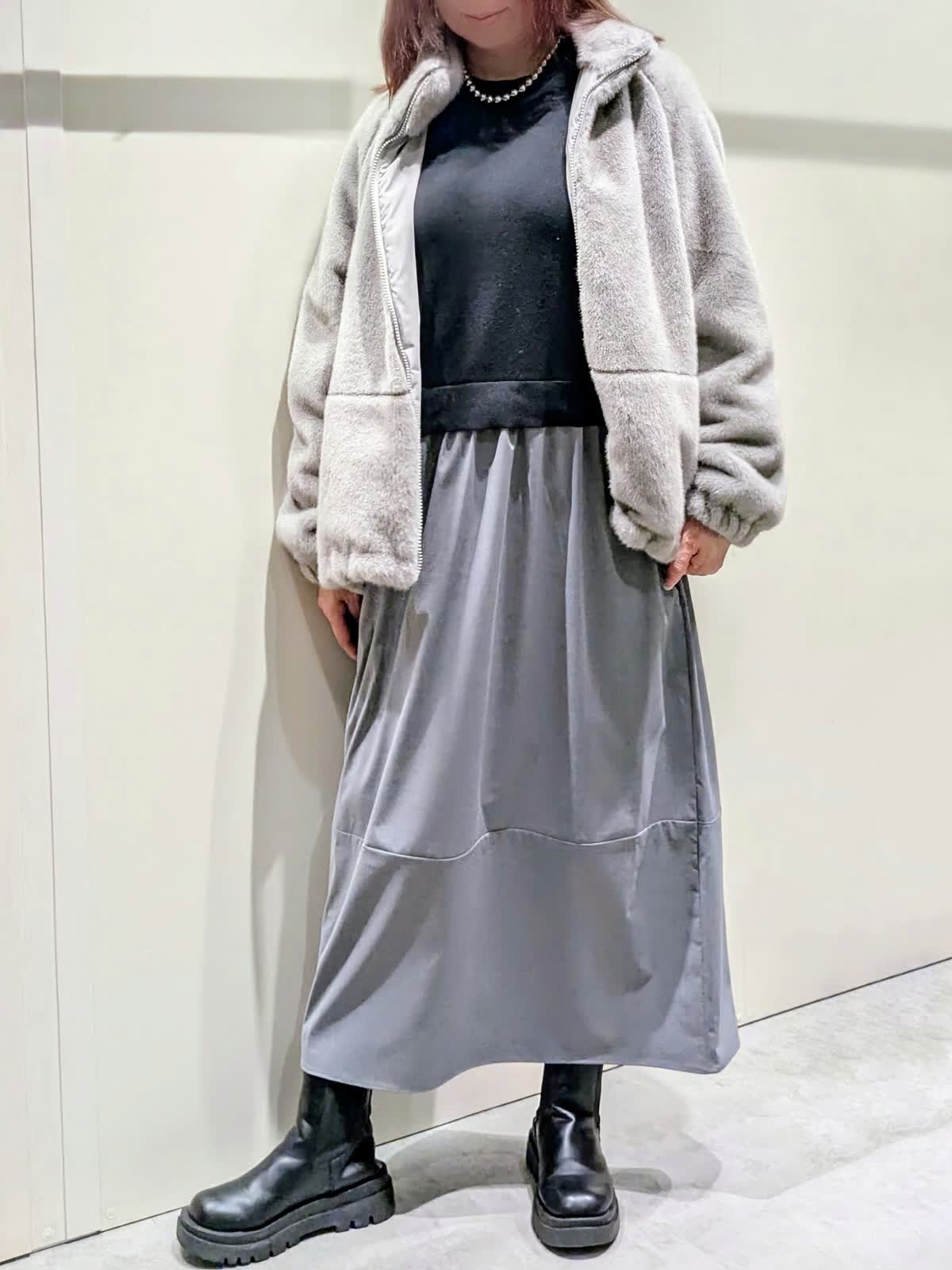【着用サイズ】フェイクファーブルゾン:フリーサイズ ワンピース:9号【着用カラー】フェイクファーブルゾン、ワンピース:グレー 冬の楽ちんコーディネート 程良くゆとりのあるスタンドカラーのフェイクファーブルゾンは、裾のドロスト仕様でシルエットの変化を楽しんで頂けます。袖口はゴムギャザー仕様でボリューム感が可愛いぃです。ボトムを選ばず着映えするアイテムです。異素材のコンビネーションワンピースは、ふんわりと立体感のあるコクーンシルエットで、ストレスフリーな着心地です。