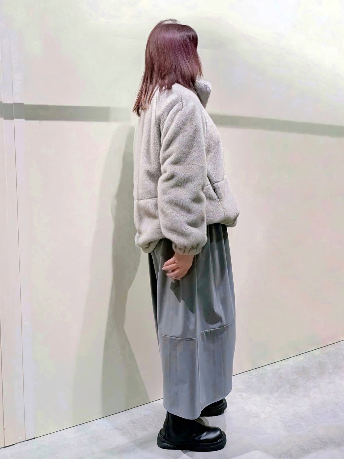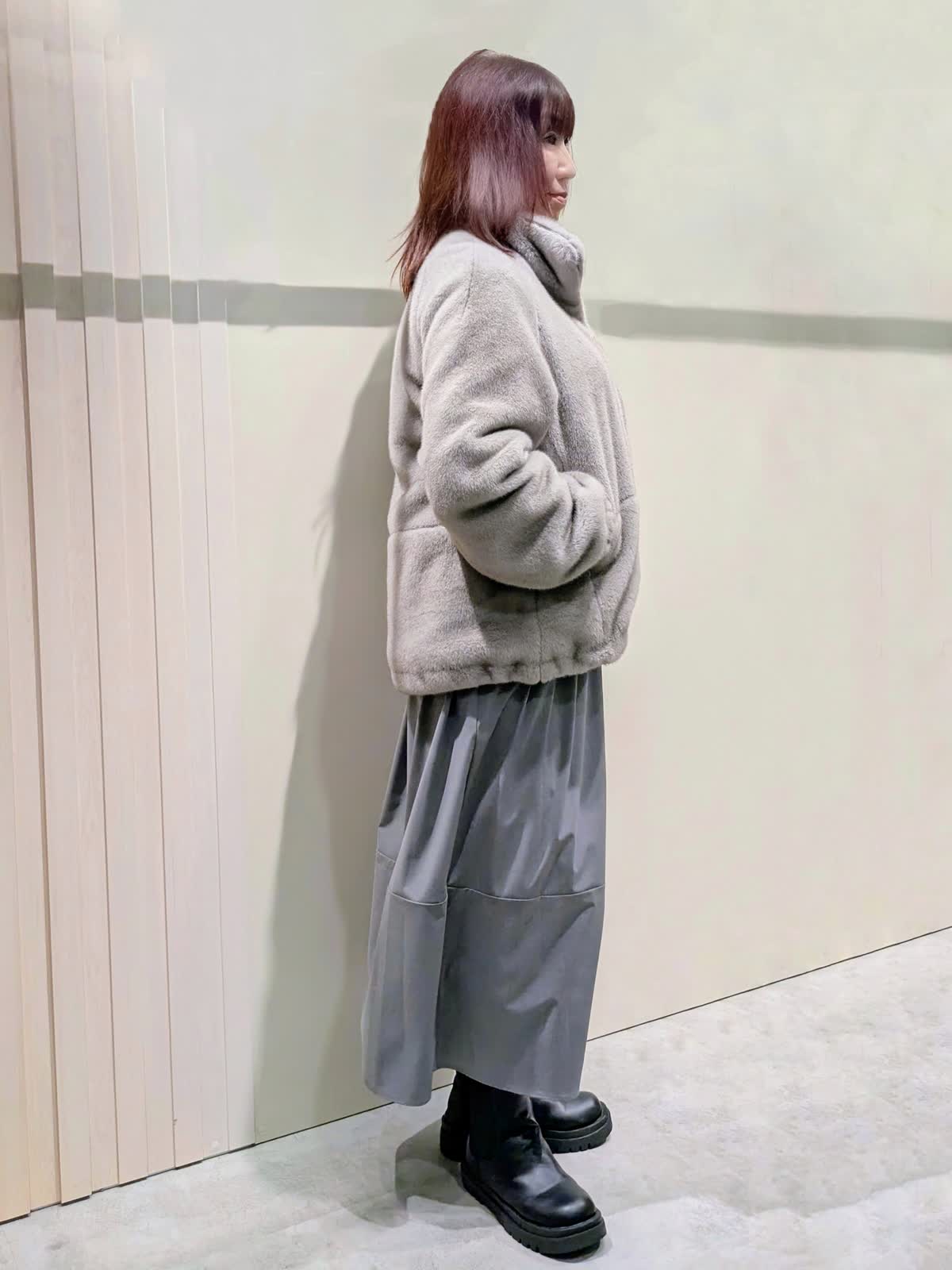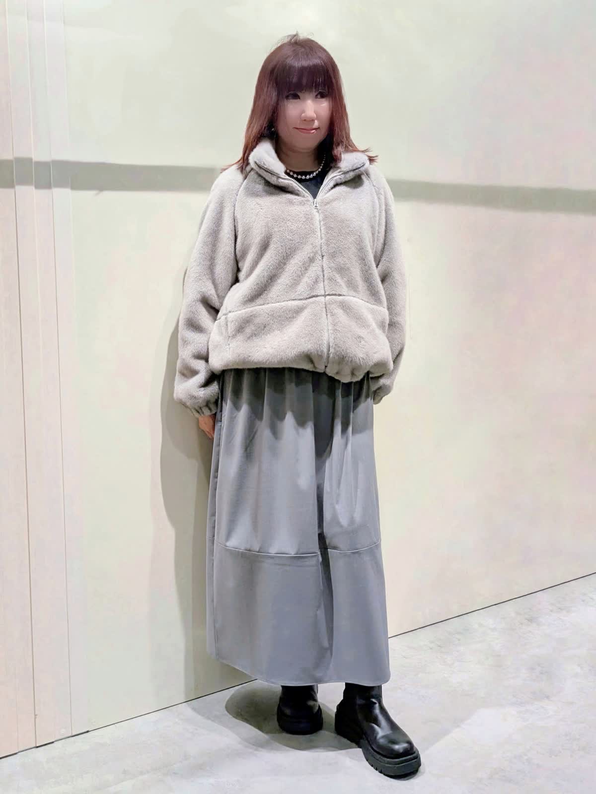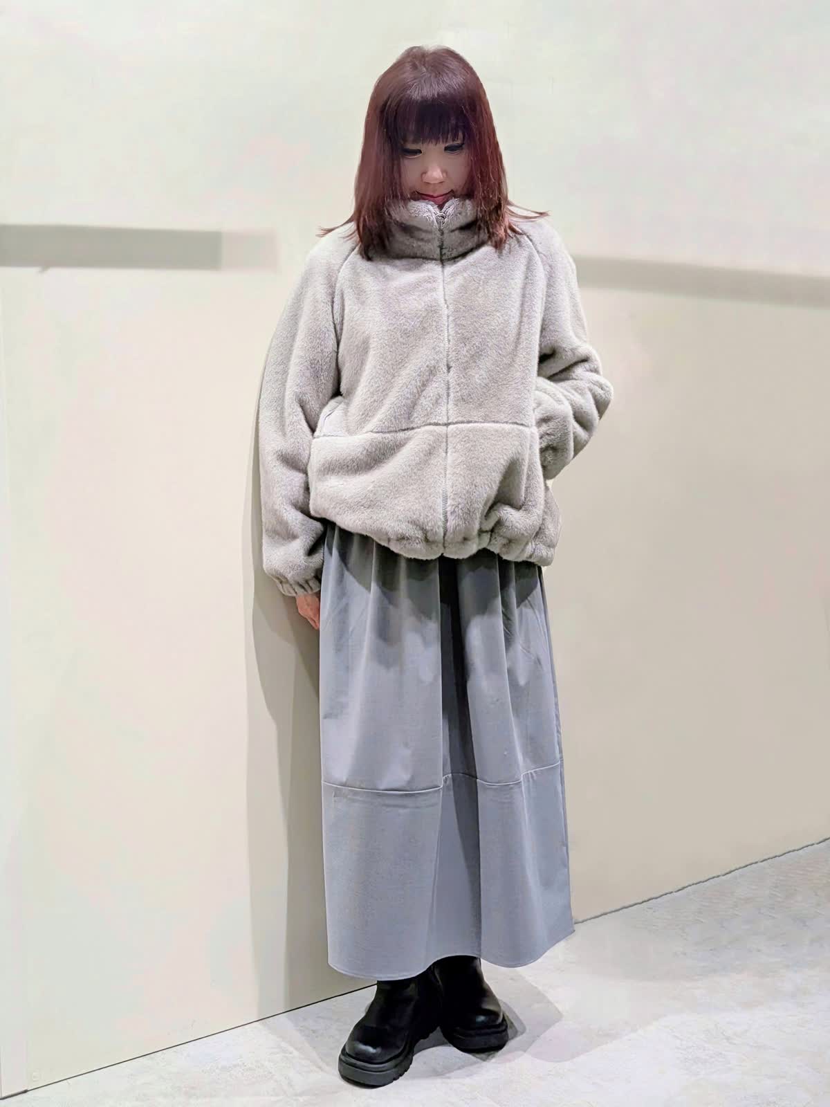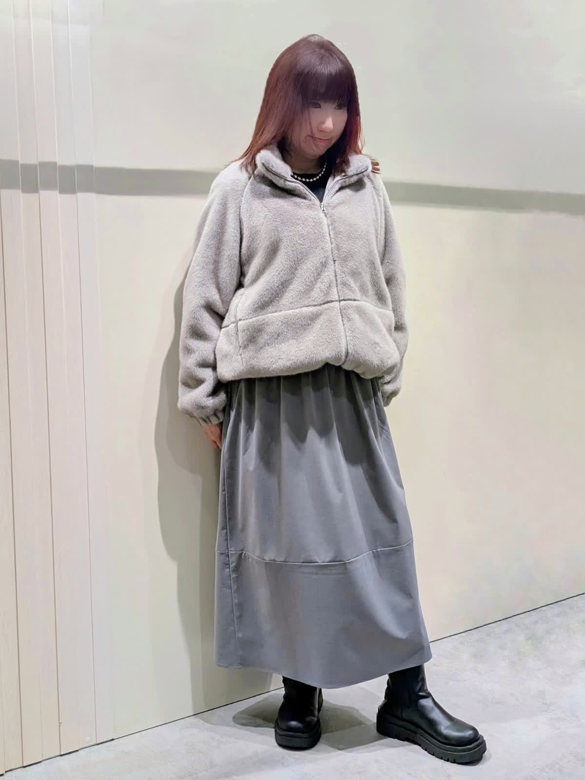 【着用サイズ】フェイクファーブルゾン:フリーサイズ ワンピース:9号【着用カラー】フェイクファーブルゾン、ワンピース:グレー 冬の楽ちんコーディネート 程良くゆとりのあるスタンドカラーのフェイクファーブルゾンは、裾のドロスト仕様でシルエットの変化を楽しんで頂けます。袖口はゴムギャザー仕様でボリューム感が可愛いぃです。ボトムを選ばず着映えするアイテムです。異素材のコンビネーションワンピースは、ふんわりと立体感のあるコクーンシルエットで、ストレスフリーな着心地です。