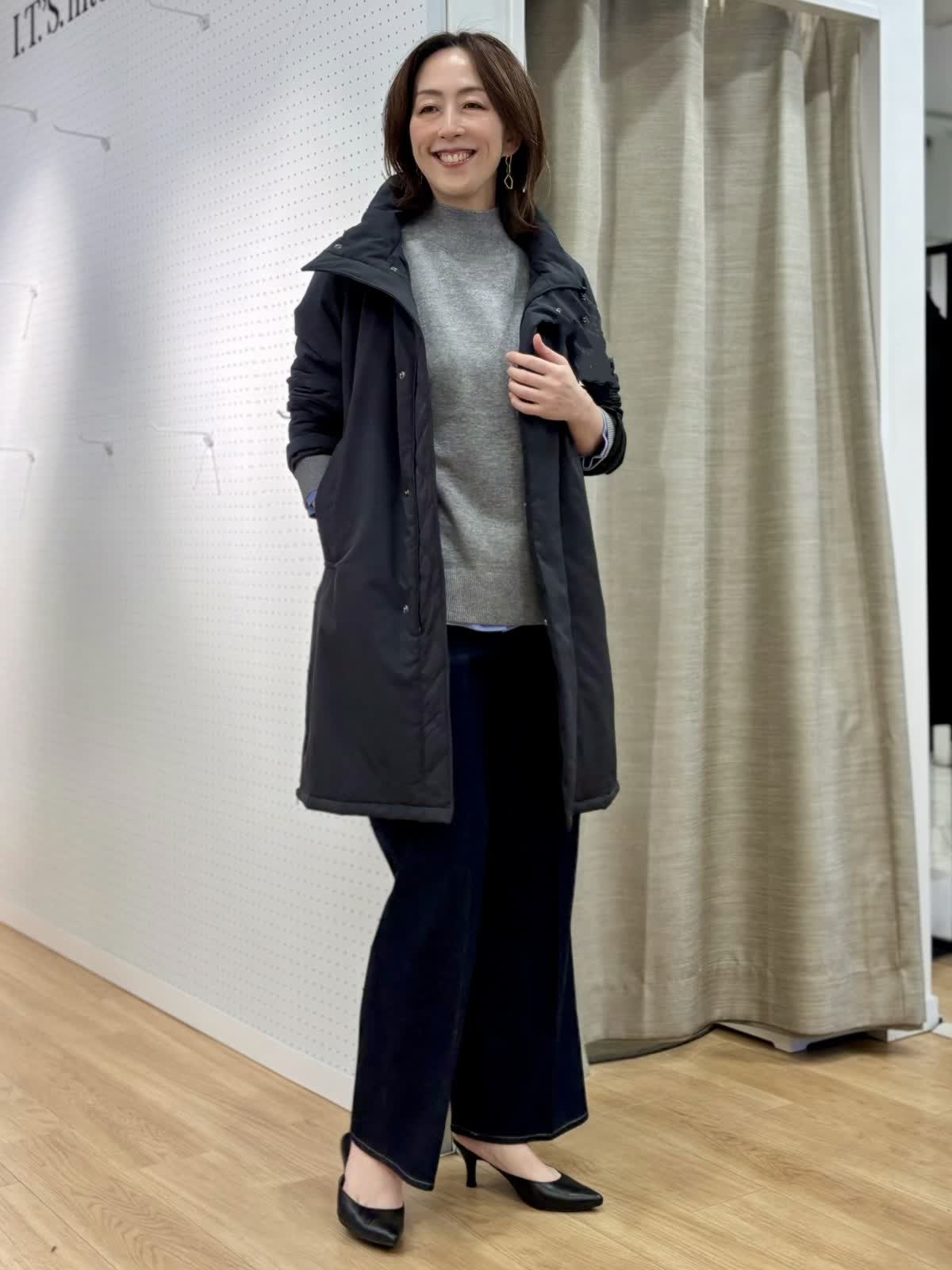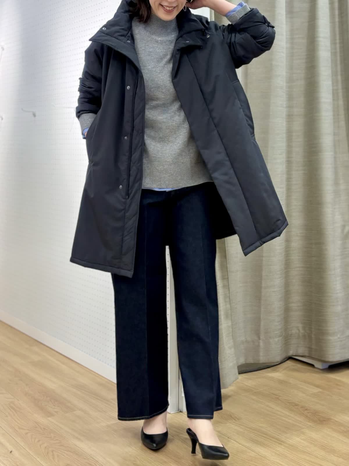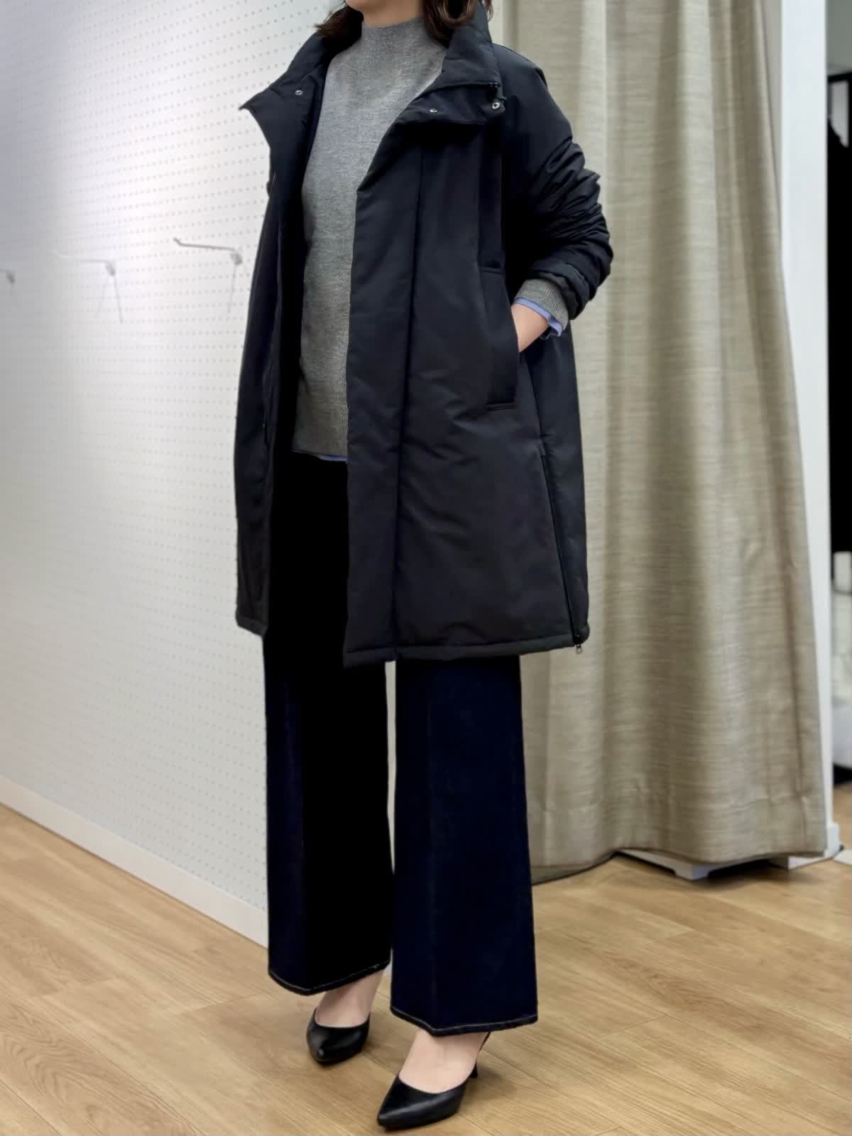 【着用カラー/サイズ】 コート:ブラック/フリー ニット:グレー/フリー ブラウス:オックス/フリー パンツ:インディゴ/11号 冬のレイヤードコーデ。カシミア混のニットは厚手過ぎず軽くて暖かくシャツとのレイヤードスタイルが今年らしいです。中綿のコートはボトムを選ばない着丈感でスタンドカラーは首元まで暖かく裾サイドにジップのスリットもあってアレンジできます。