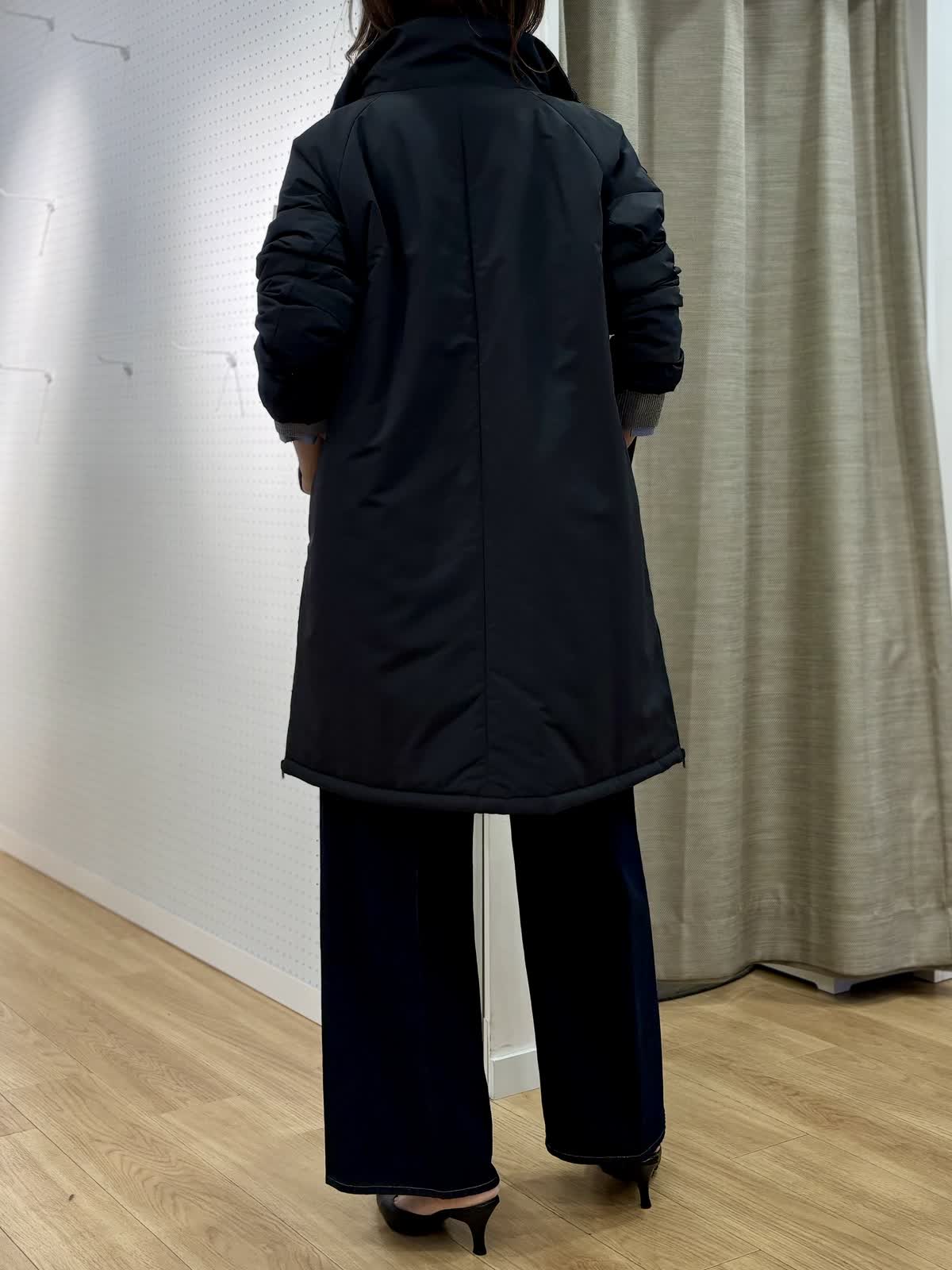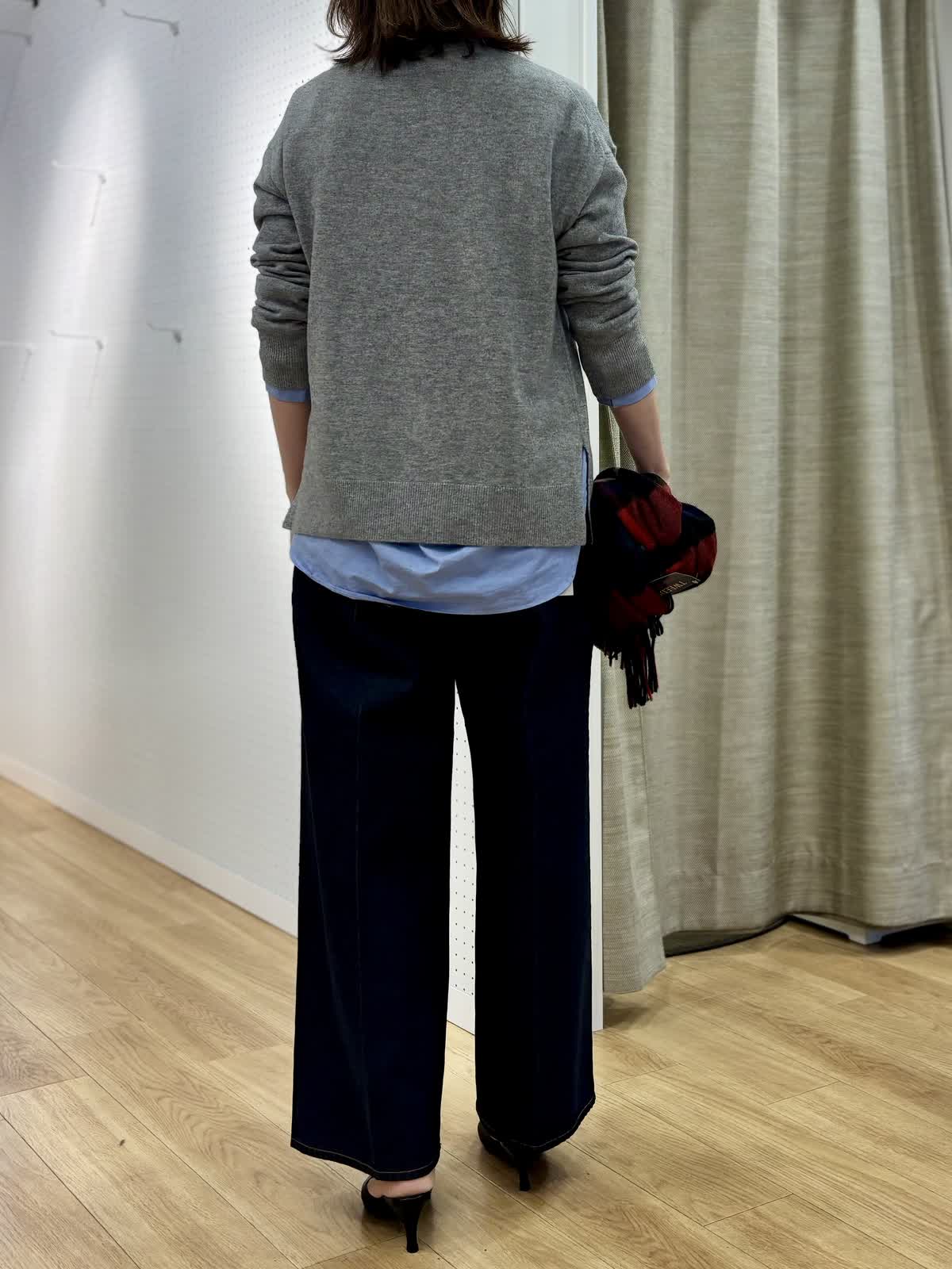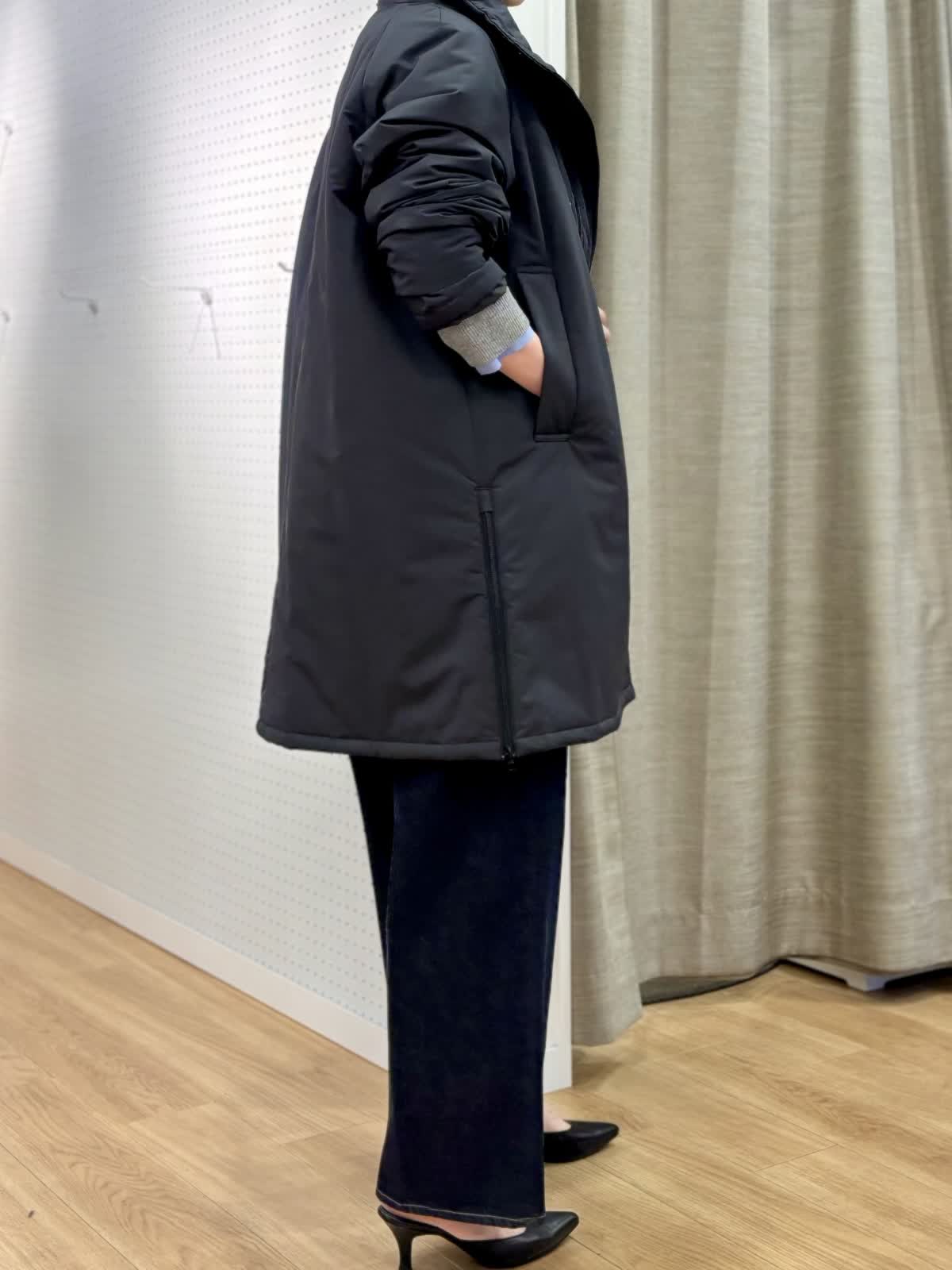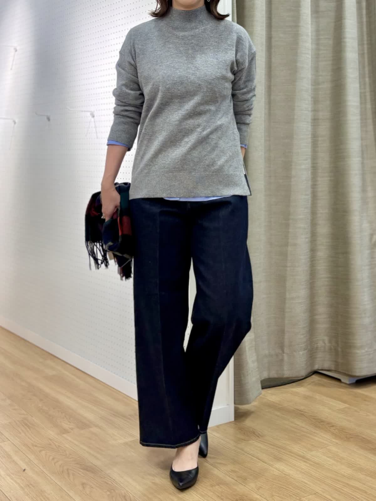 【着用カラー/サイズ】 コート:ブラック/フリー ニット:グレー/フリー ブラウス:オックス/フリー パンツ:インディゴ/11号 冬のレイヤードコーデ。カシミア混のニットは厚手過ぎず軽くて暖かくシャツとのレイヤードスタイルが今年らしいです。中綿のコートはボトムを選ばない着丈感でスタンドカラーは首元まで暖かく裾サイドにジップのスリットもあってアレンジできます。