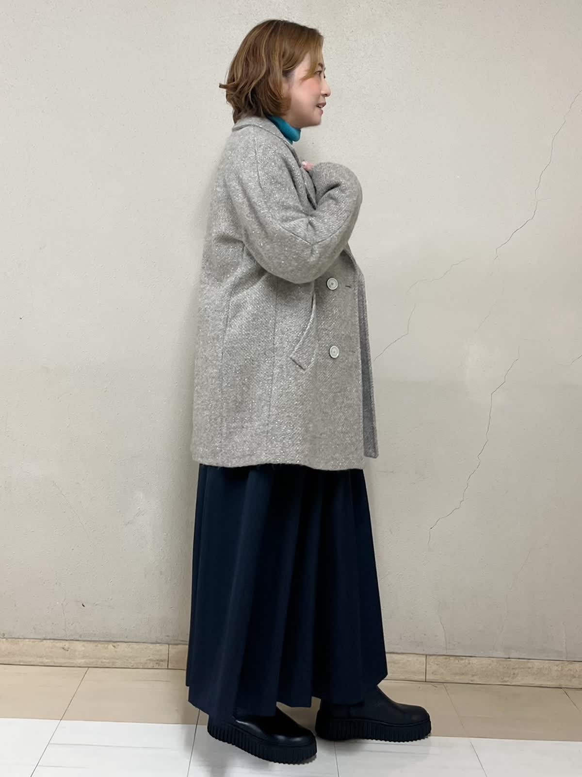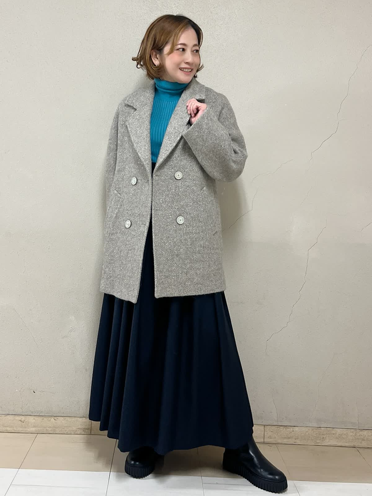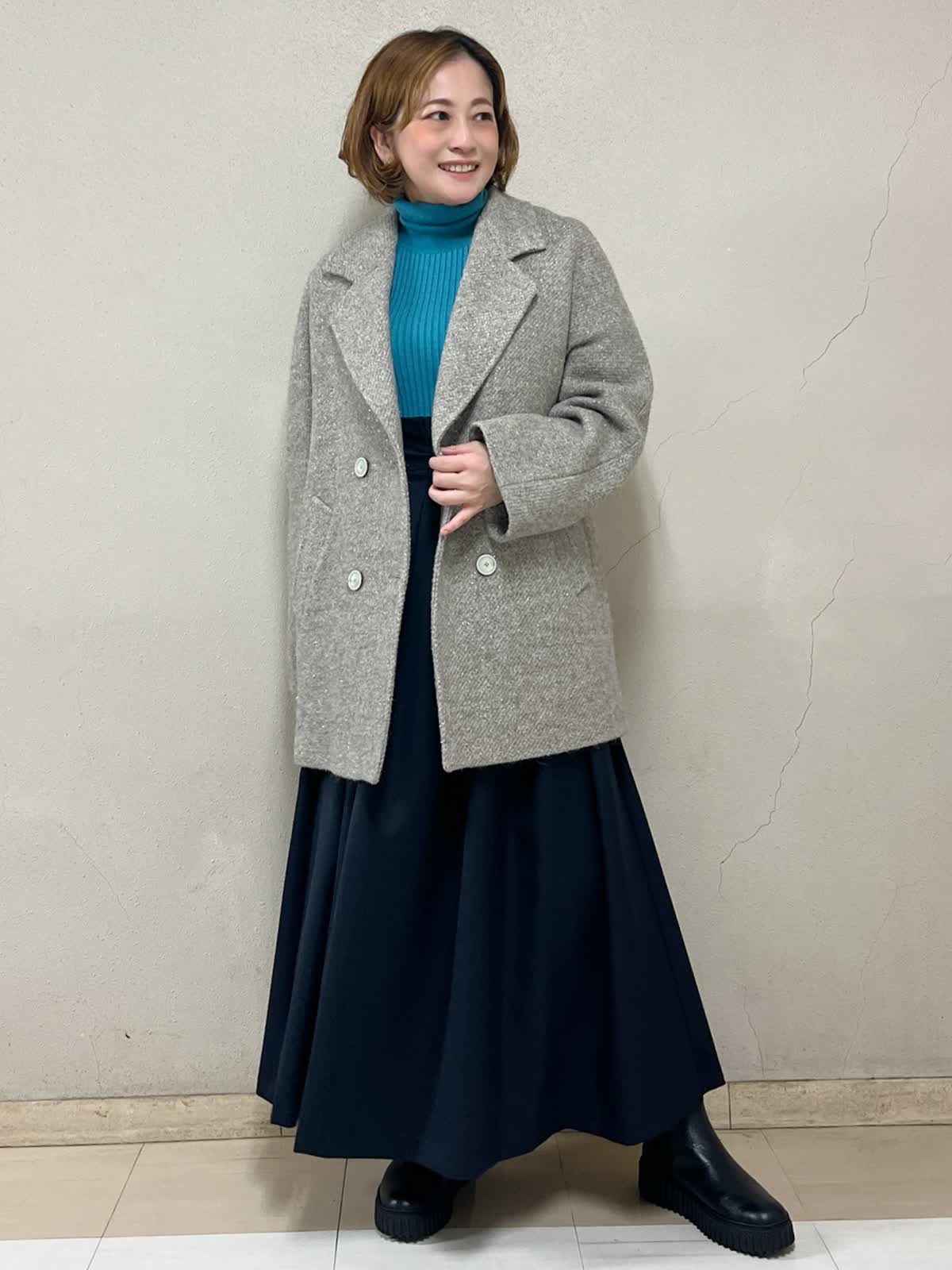 【着用サイズ】コート:9号 ニット:9号 スカート:フリーサイズ 【着用カラー】コート:ベージュ ニット:ターコイズブルー スカート:ネイビー 忘年会コーディネートです。上品な風合いのコートです。アルパカウールで軽く暖かさが違います。自分へのプレゼントとしてもおすすめです。着るたびに気持ちが上がるコートです。インナーにはきれいなターコイズブルーを合わせてみました。