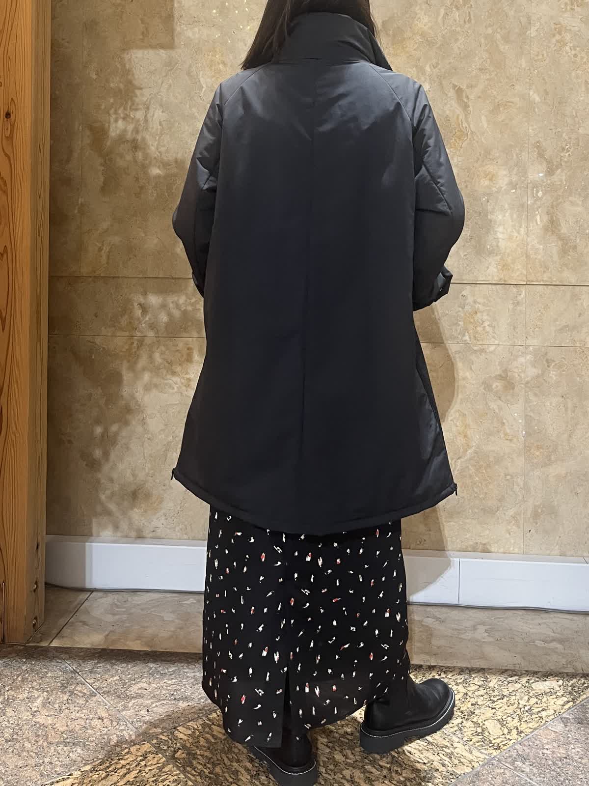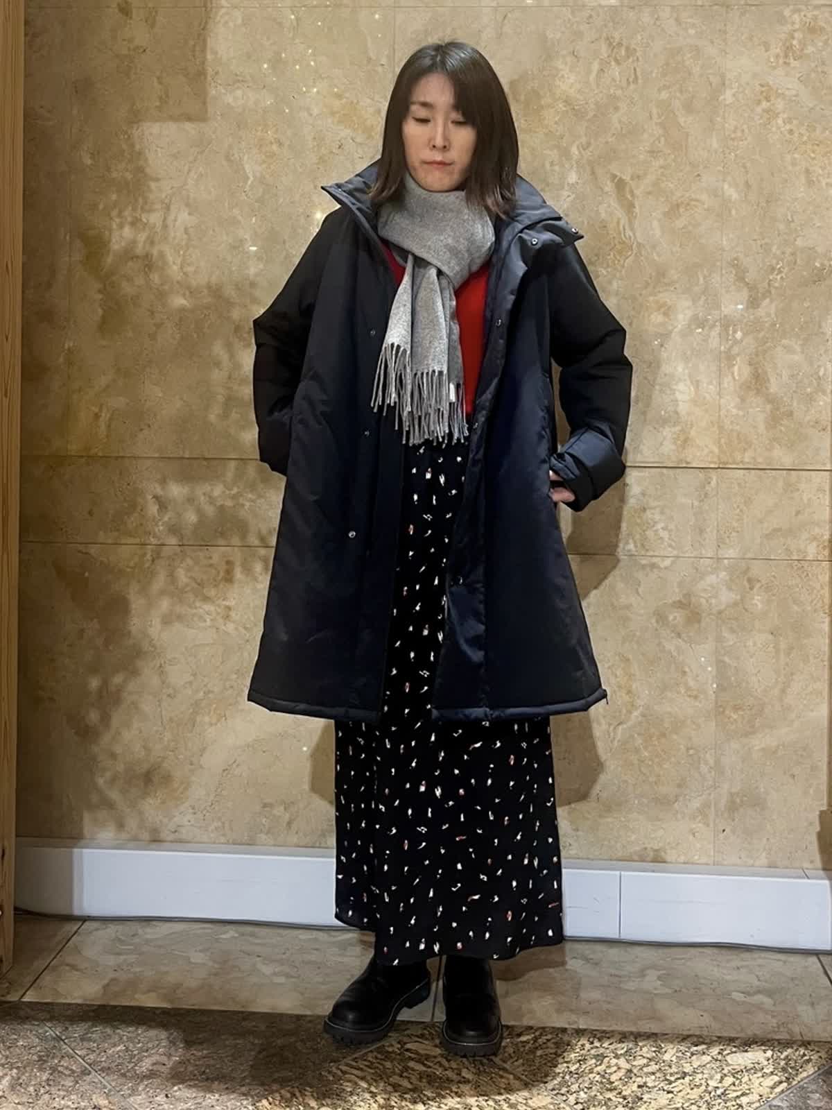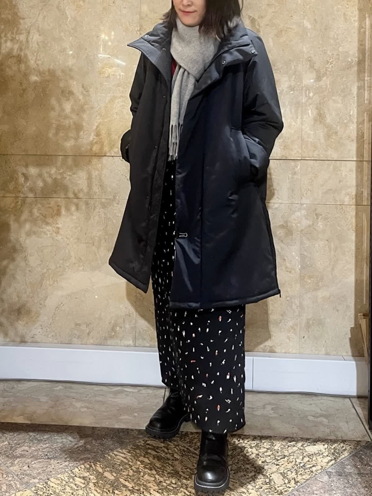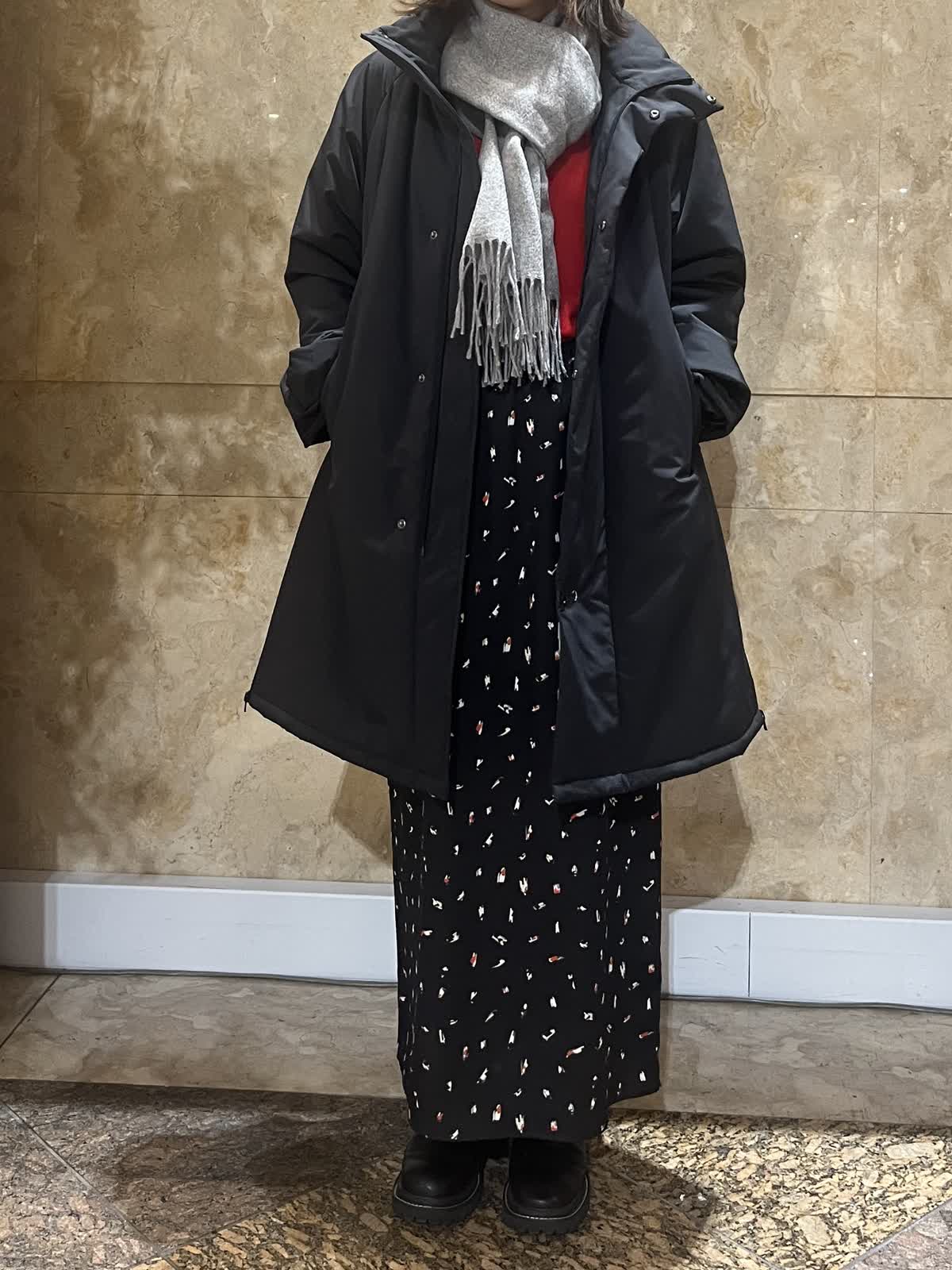 【着用サイズ/カラー】アウター:フリーサイズ/ブラック ニット:9号/レッド スカート:フリーサイズ/ブラック 中綿スタンドカラーコートが軽くて暖かかったので黒もオススメです。
