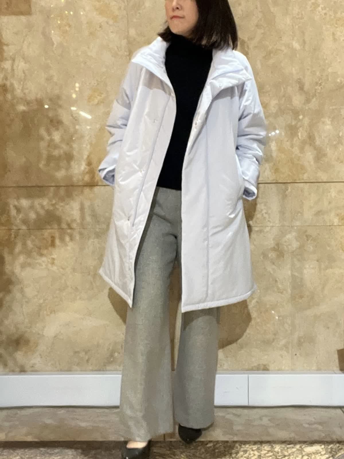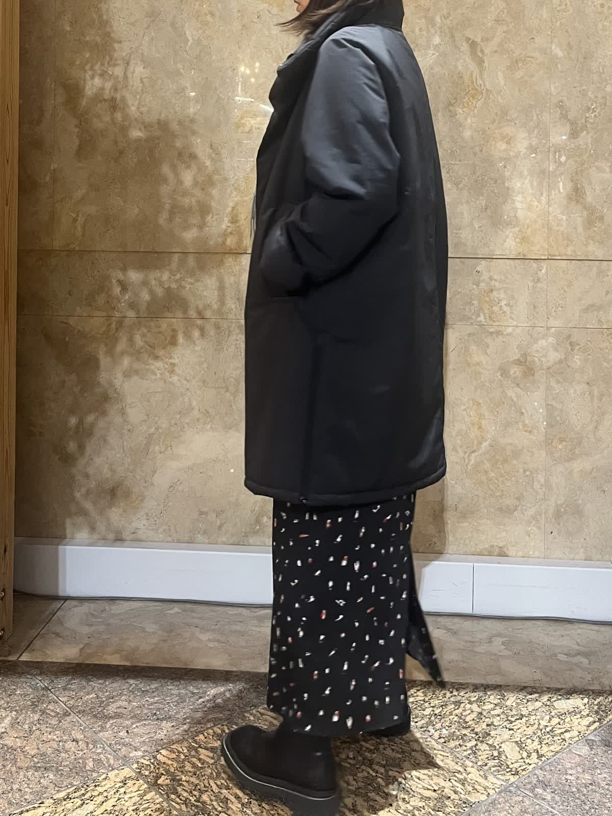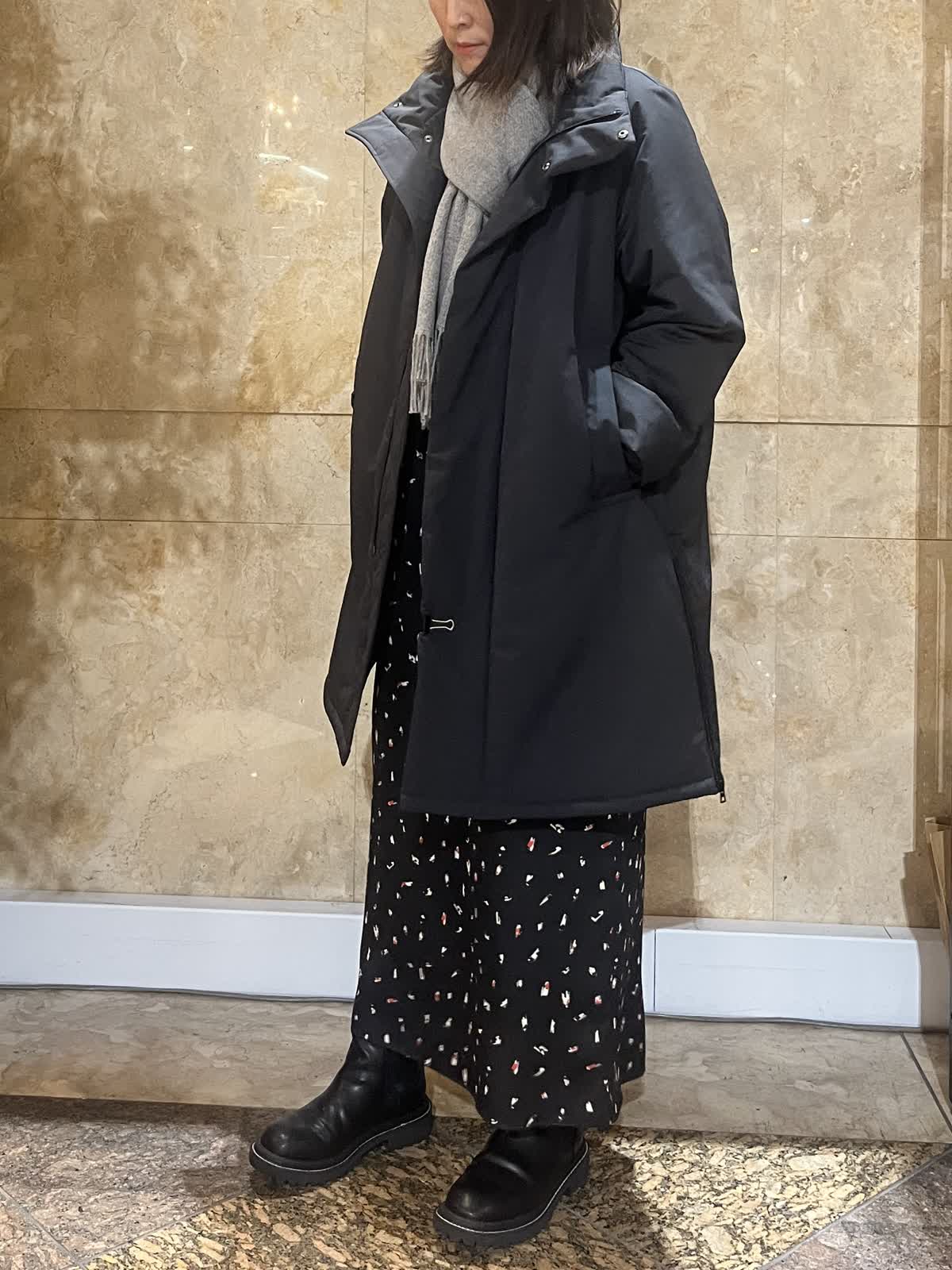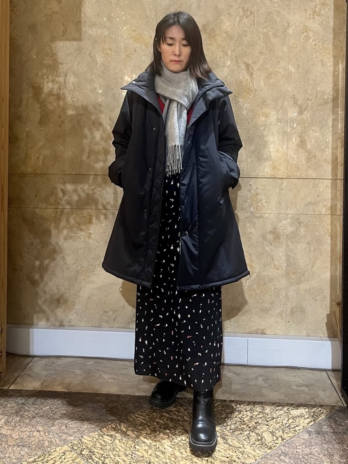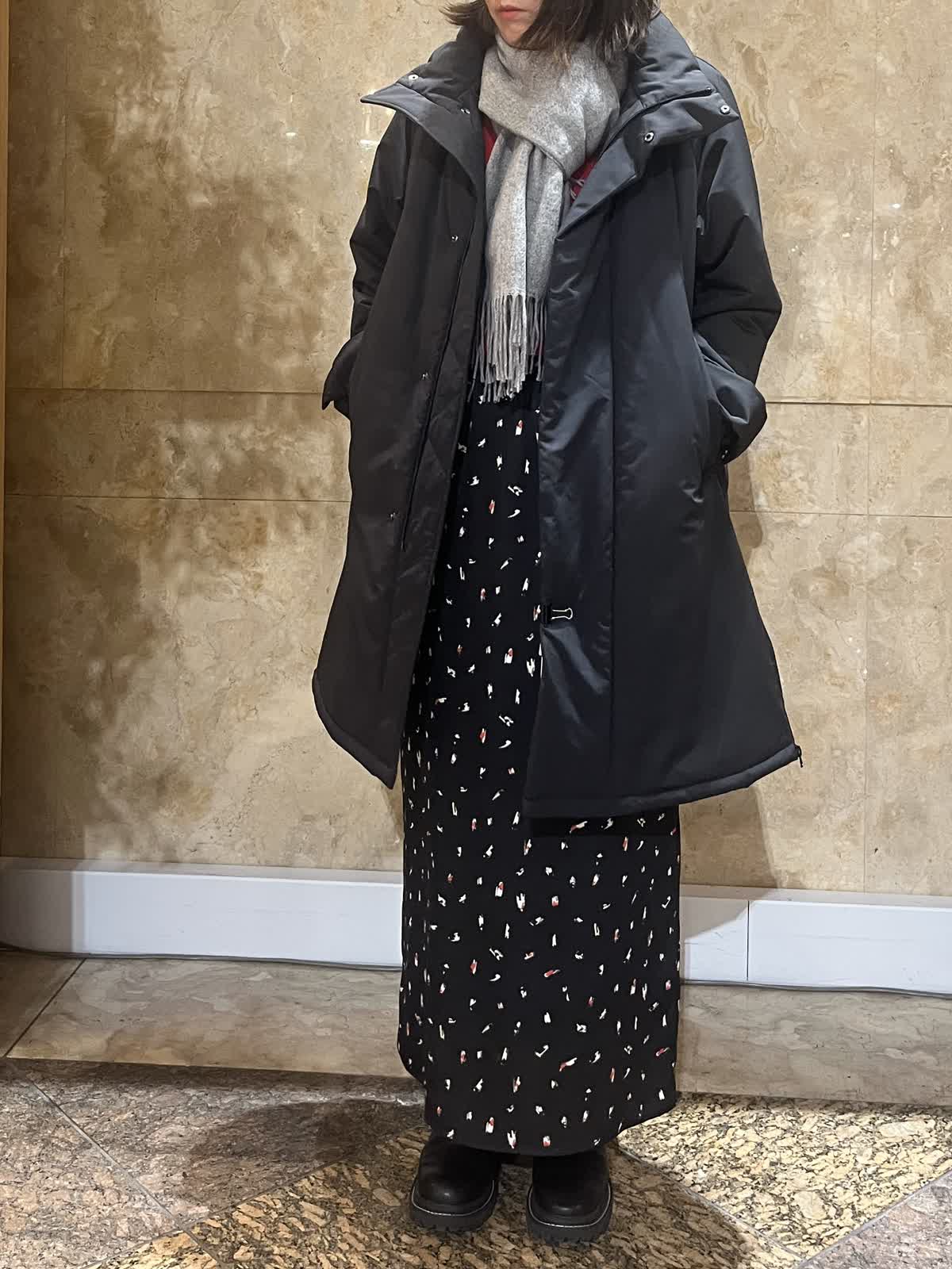 【着用サイズ/カラー】アウター:フリーサイズ/ブラック ニット:9号/レッド スカート:フリーサイズ/ブラック 中綿スタンドカラーコートが軽くて暖かかったので黒もオススメです。