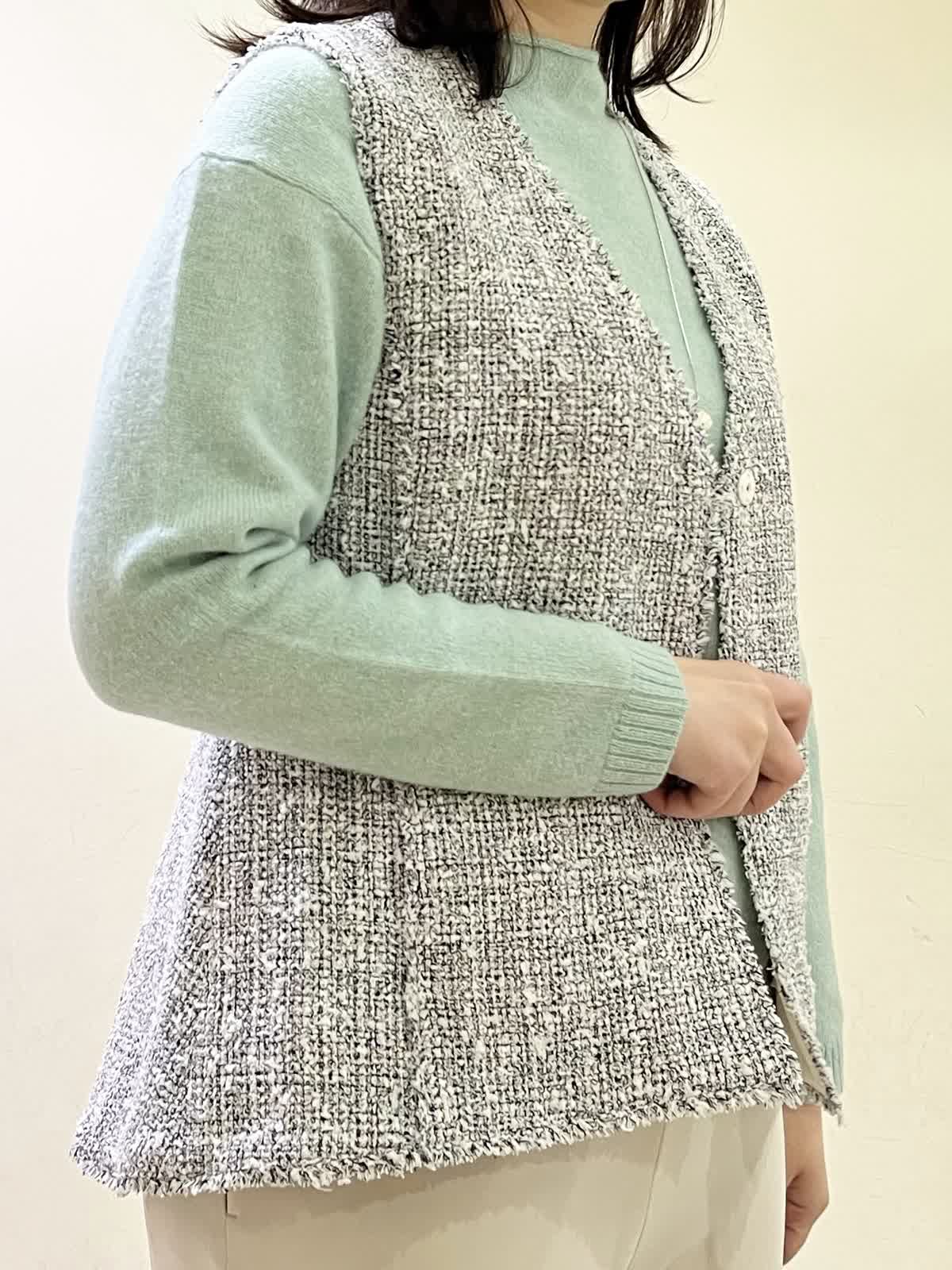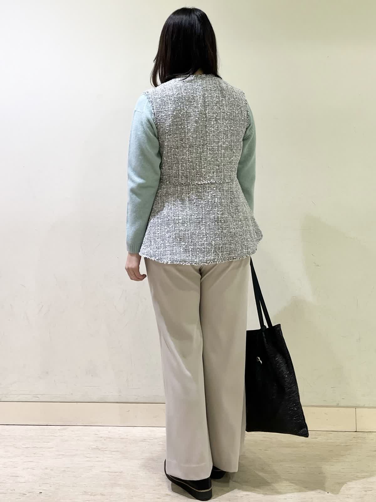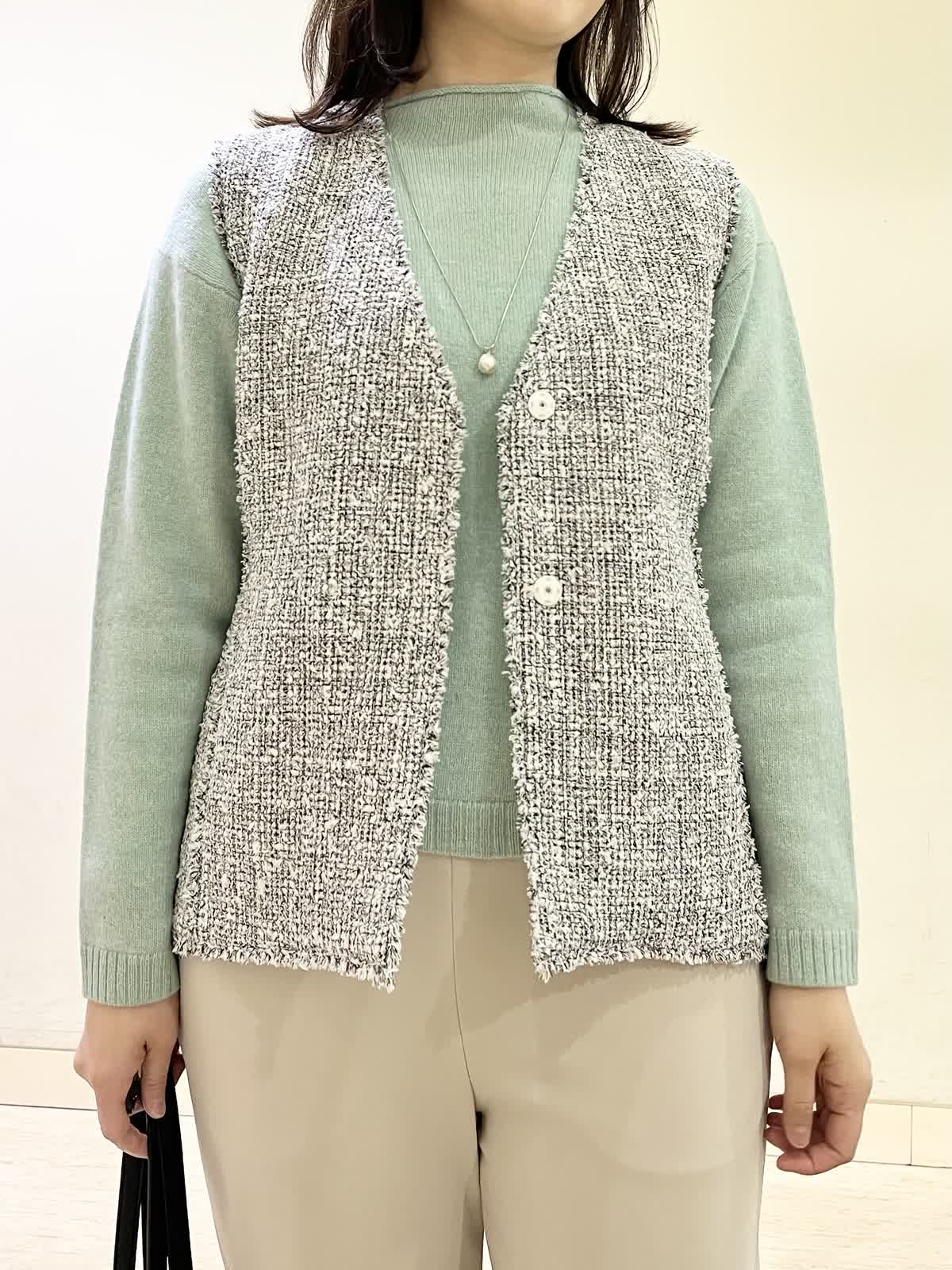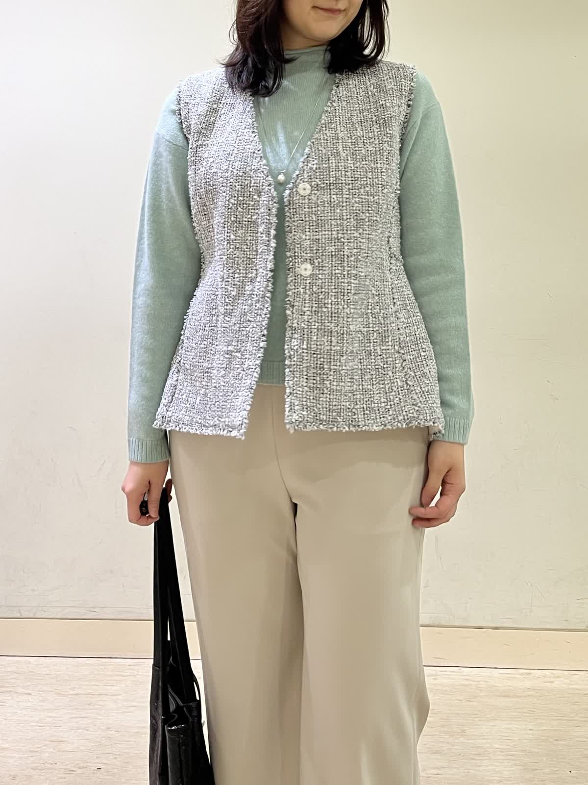 【着用カラー/サイズ】ジレ:オフホワイト/フリー セーター:ペパーミント/フリー パンツ:ベージュ/11号 忘年会コーデ。年末年始の食事会の機会には普段のアイテムにきれいめなツイードジレをオン!一気にきちんと感が出て華やかになります。合わせたセーターは、アルパカ混合素材でふんわり柔らかい素材です。ウエストゴムのフレアパンツは、楽ちんに着用できて安心です。