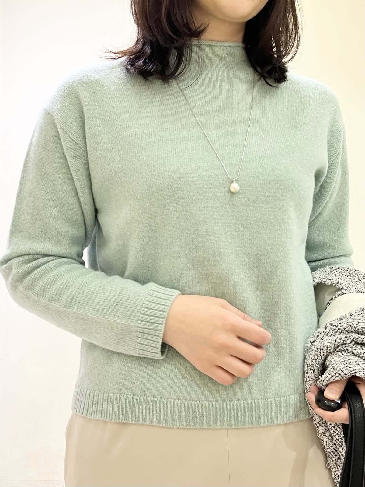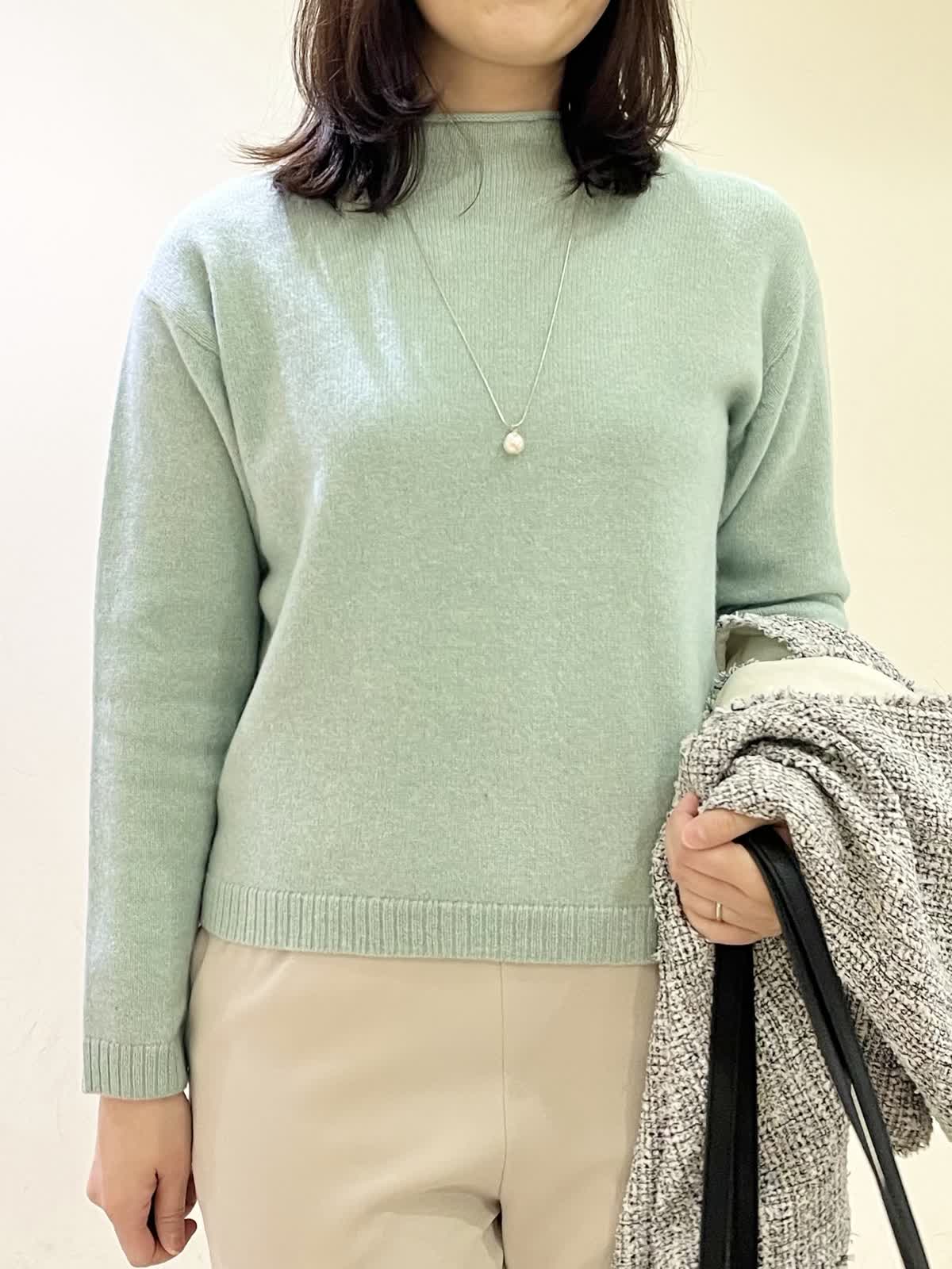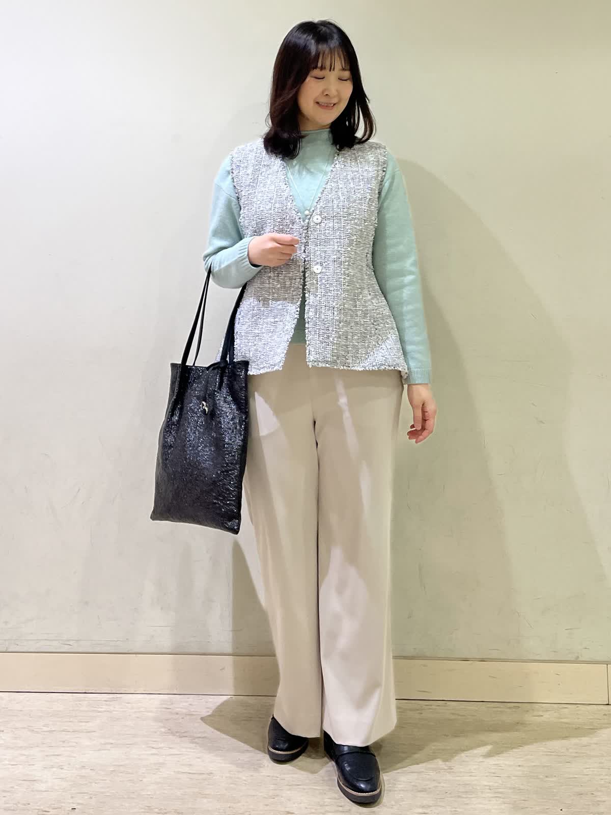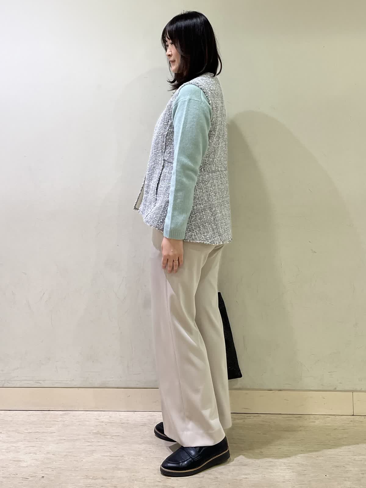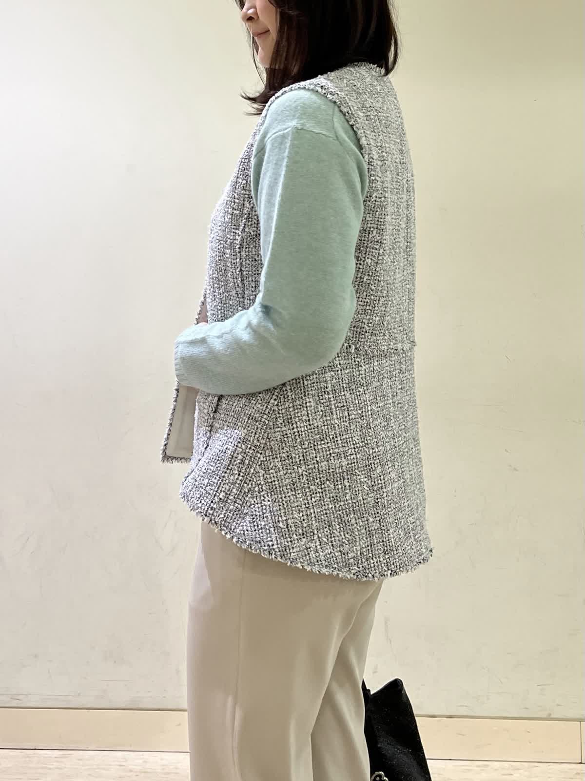 【着用カラー/サイズ】ジレ:オフホワイト/フリー セーター:ペパーミント/フリー パンツ:ベージュ/11号 忘年会コーデ。年末年始の食事会の機会には普段のアイテムにきれいめなツイードジレをオン!一気にきちんと感が出て華やかになります。合わせたセーターは、アルパカ混合素材でふんわり柔らかい素材です。ウエストゴムのフレアパンツは、楽ちんに着用できて安心です。