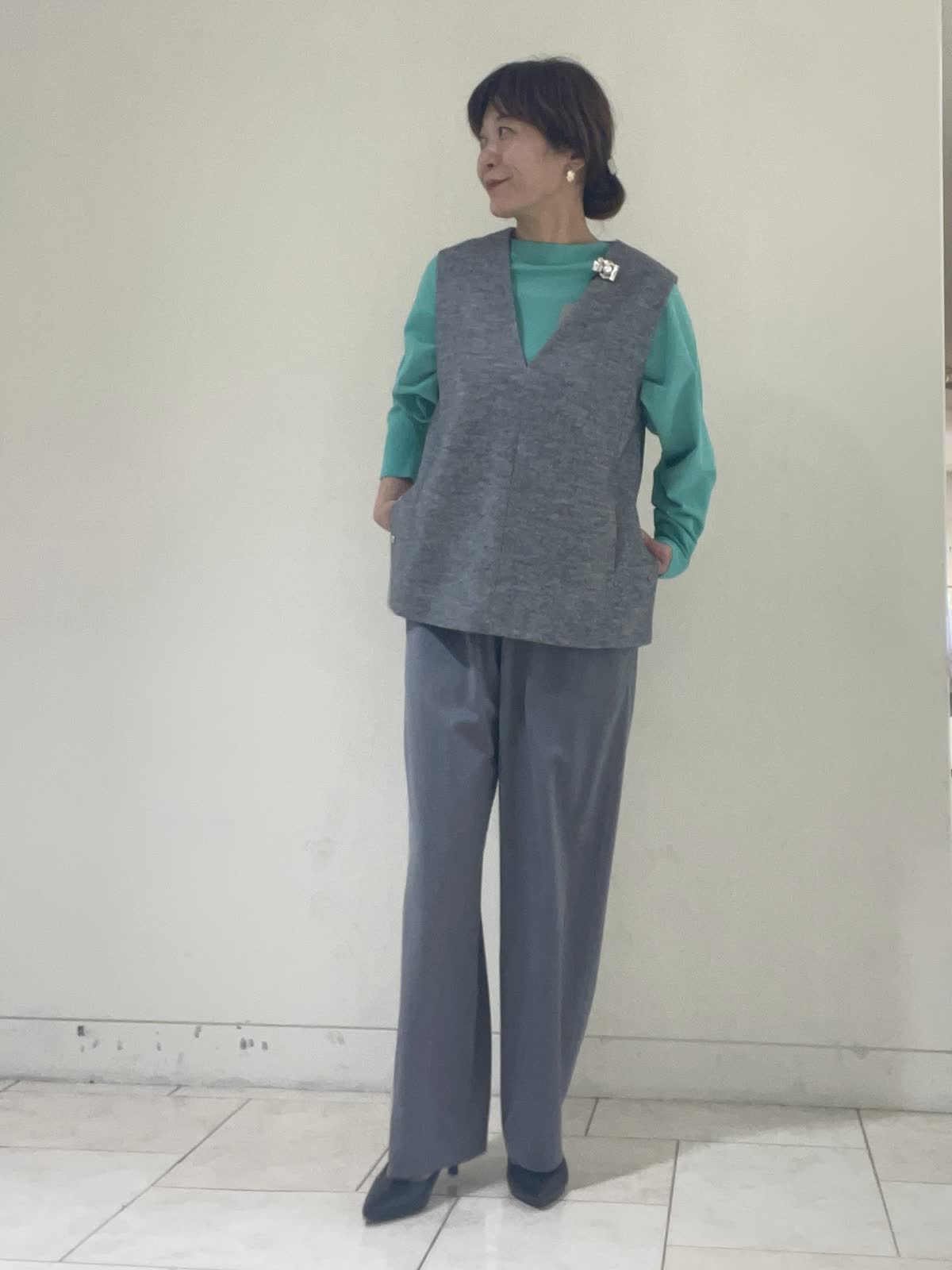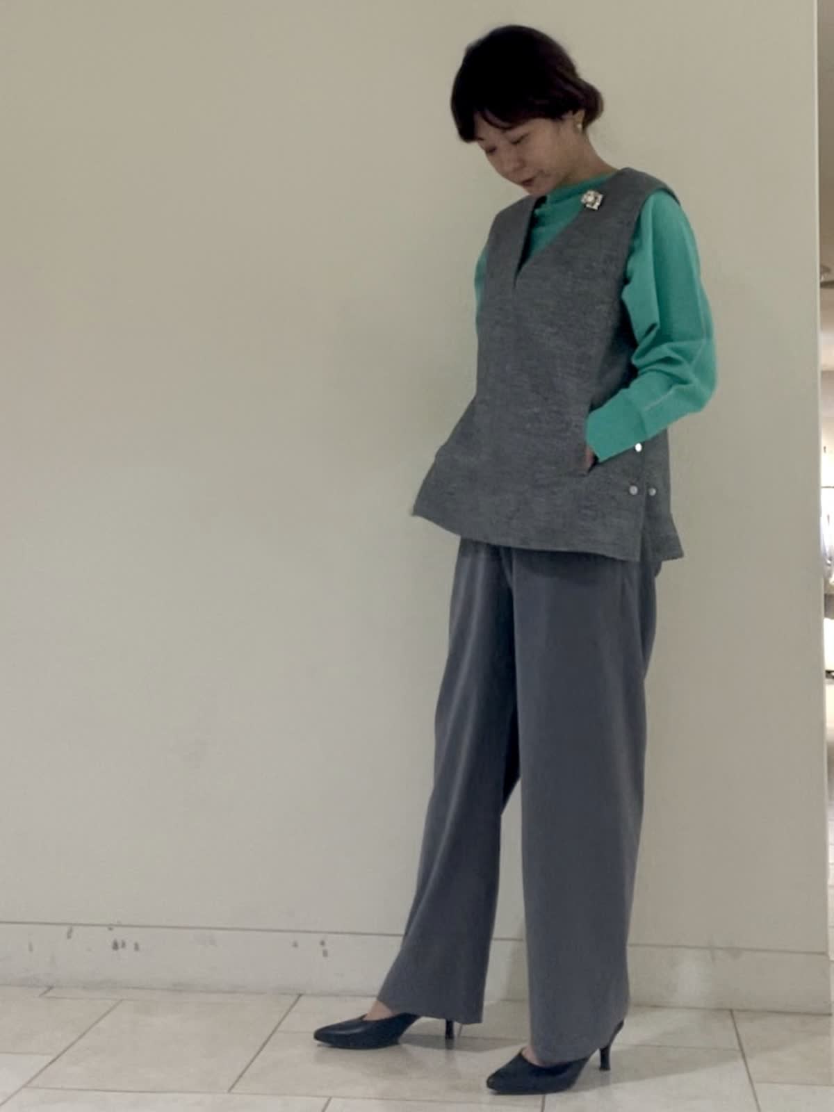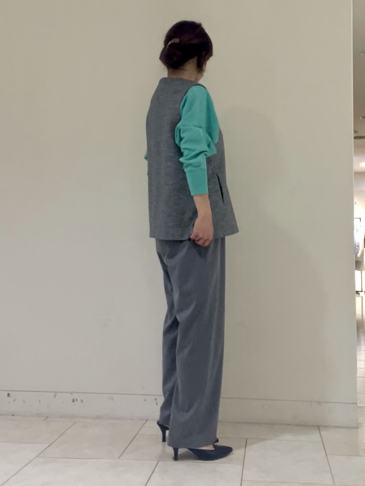 【着用サイズ/カラー】ニットペパーミント:フリーサイズ ジレグレー:9号サイズ パンツグレー:9号サイズ アクセントカラーもまとめやすいグレーコーデ。ジャケット代わりに重宝するジレは嬉しいポケット付き。 両サイドスリットにできる仕様で 透け感あるブラウスやハイネック、ボウタイブラウス、カットソー等トップスからボトムスまで合わせやすくておすすめです。