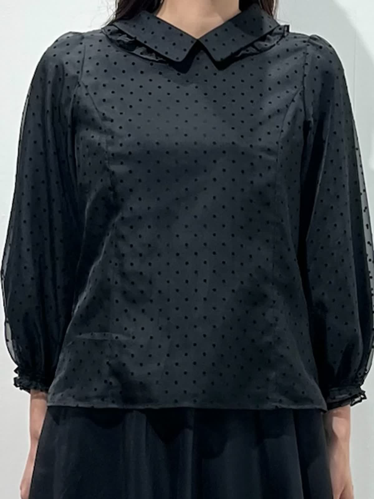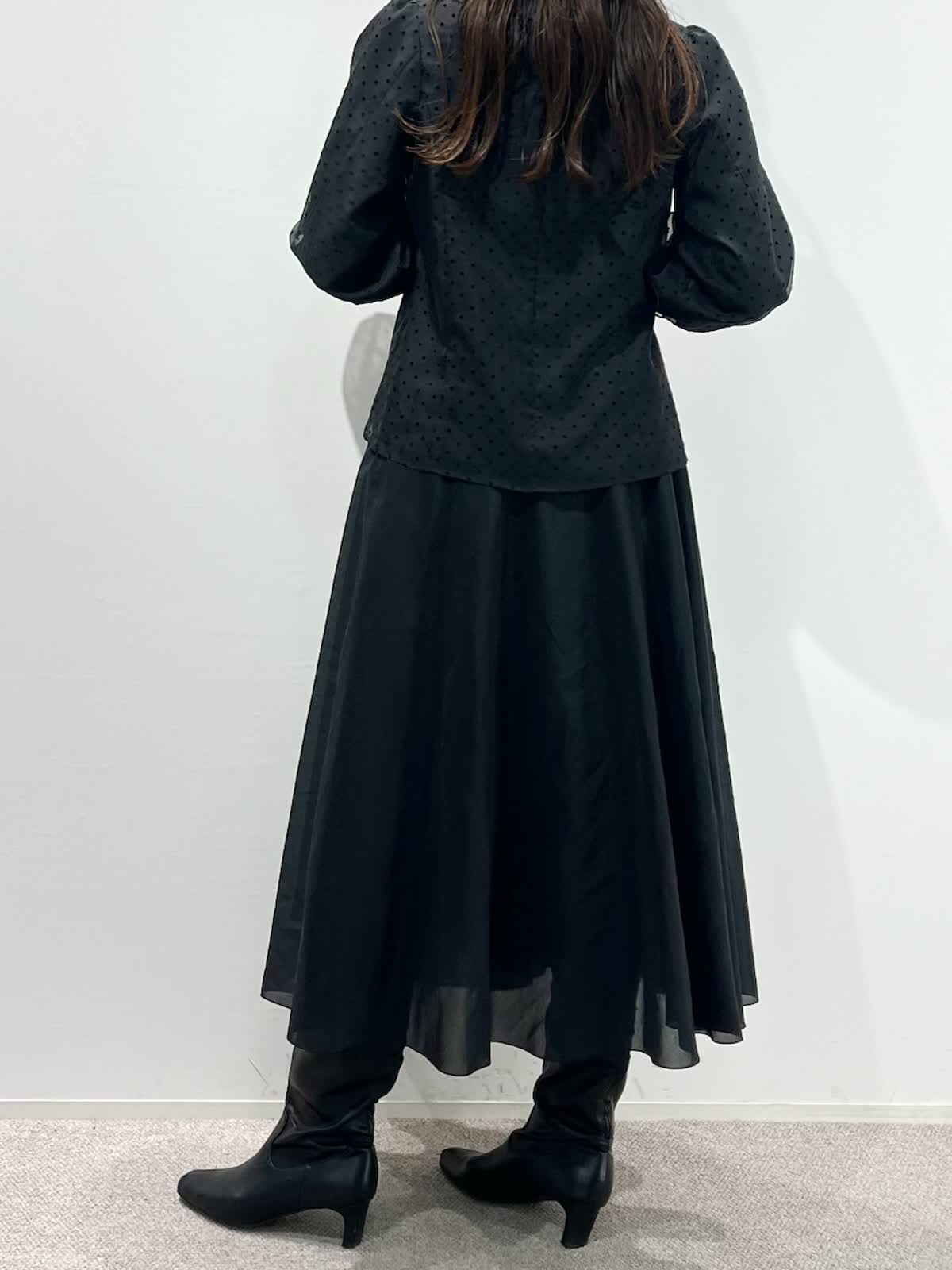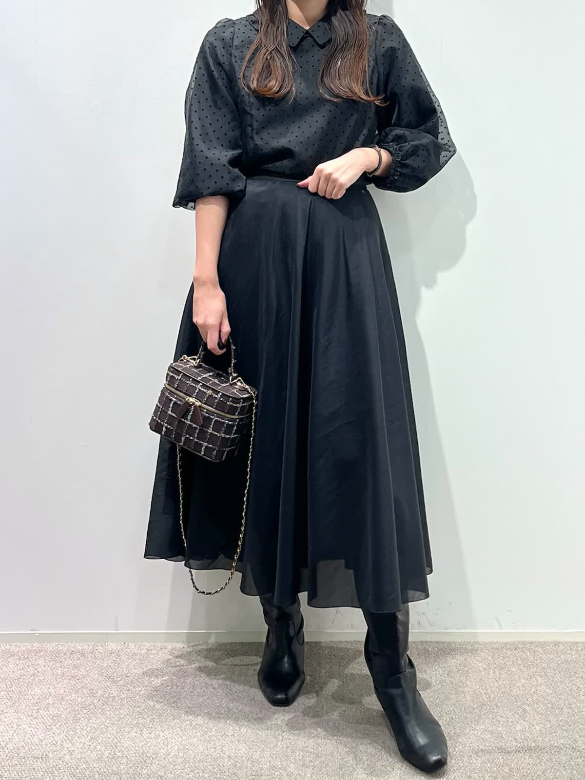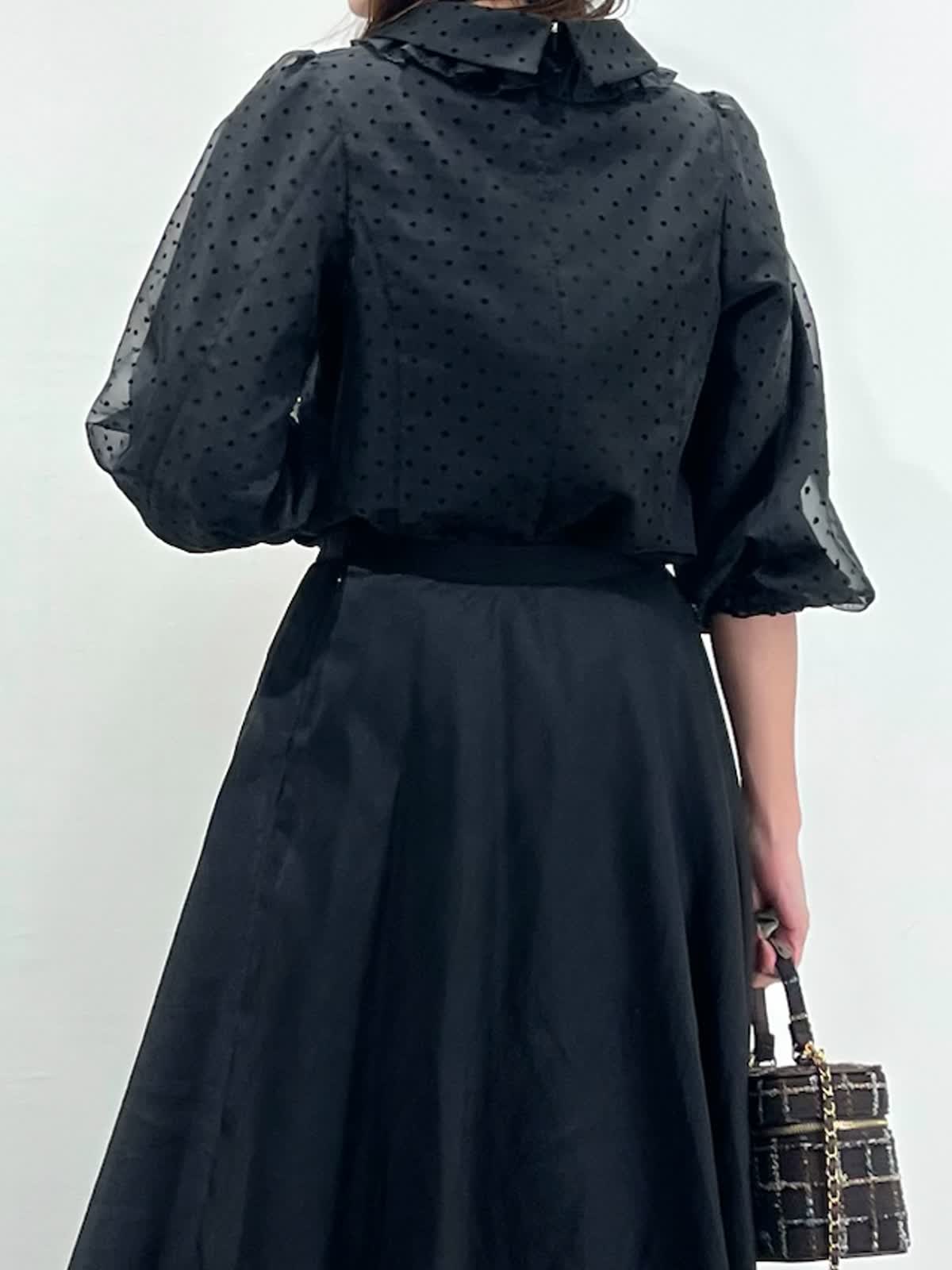【着用サイズ】ブラウス:9号 スカート:11号 【着用カラー】ブラウス:ブラック スカート:ブラック バッグ:モカチャ 「ドット×モノトーンクラシカルコーデ」 オーガンジー素材が上品な印象の、ドット柄フリル襟ブラウス。モノトーンのボトムと合わせることで、クラシカルでモードな着こなしになります。二重のフリル襟と、袖口のギャザーのデザインがポイントで、アウターやジャケットのインナーに合わせるとより華やかな装いに。モノトーンのドット柄なので、コーデのポイントやベーシックスタイルにも大活躍。ウォッシャブル可能や、シーズン長く着用できるのも嬉しいポイント。スカートはウエストゴム仕様。裾のシアー感がモノトーンコーデを軽く見せてくれるので、重たくなりすぎず、おすすめです。
