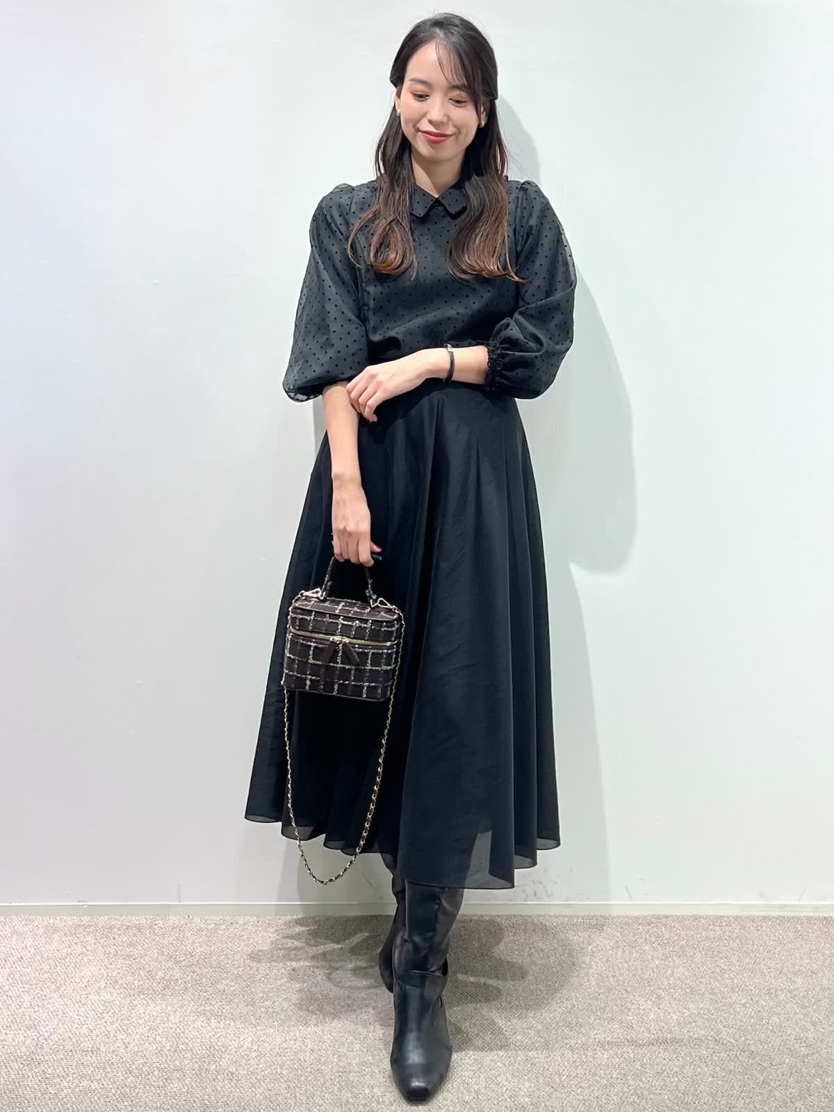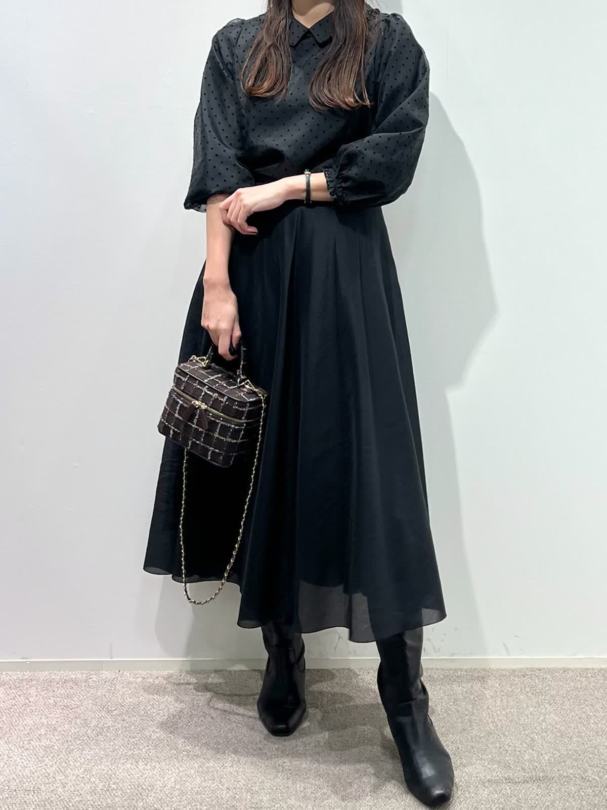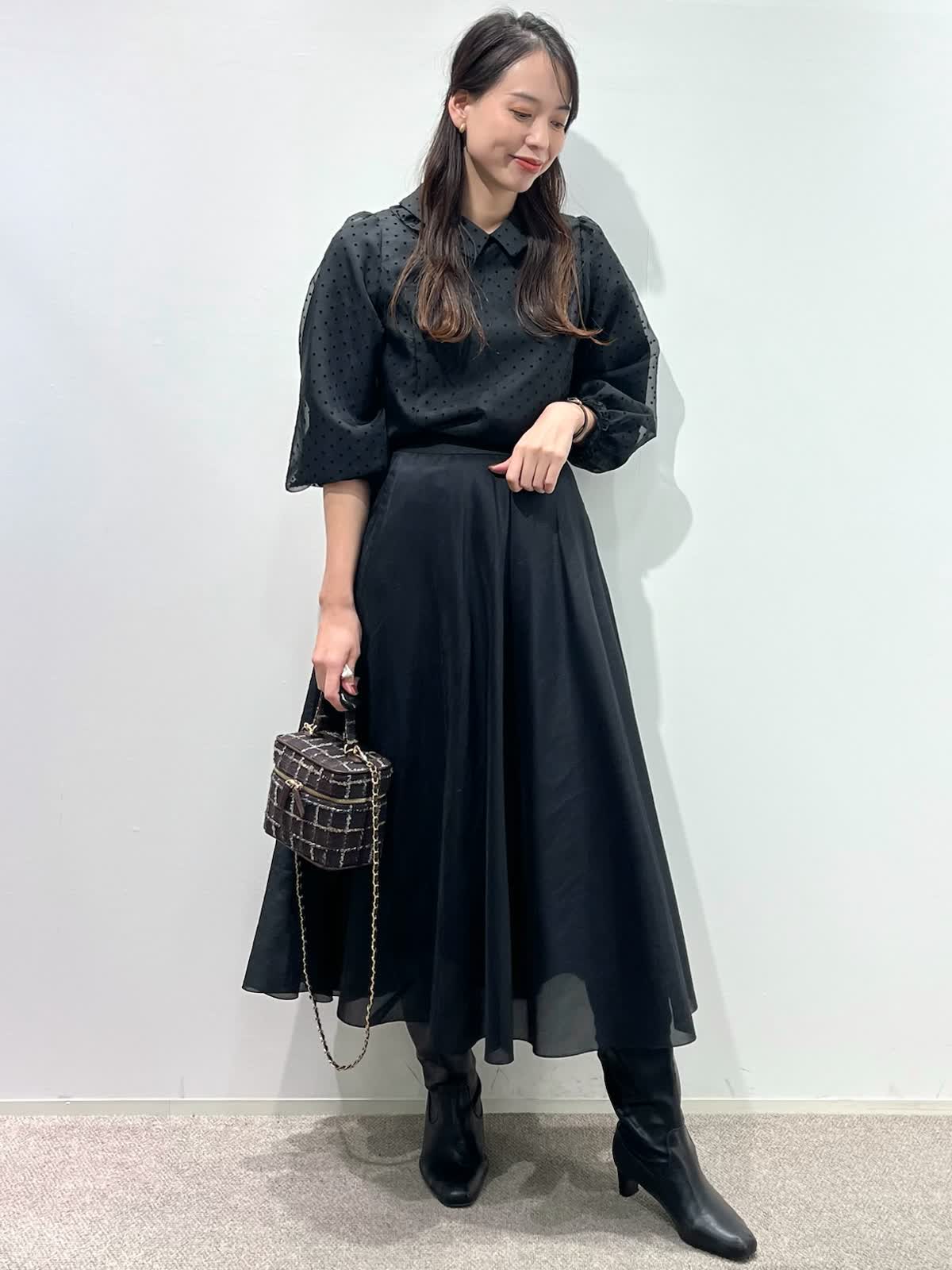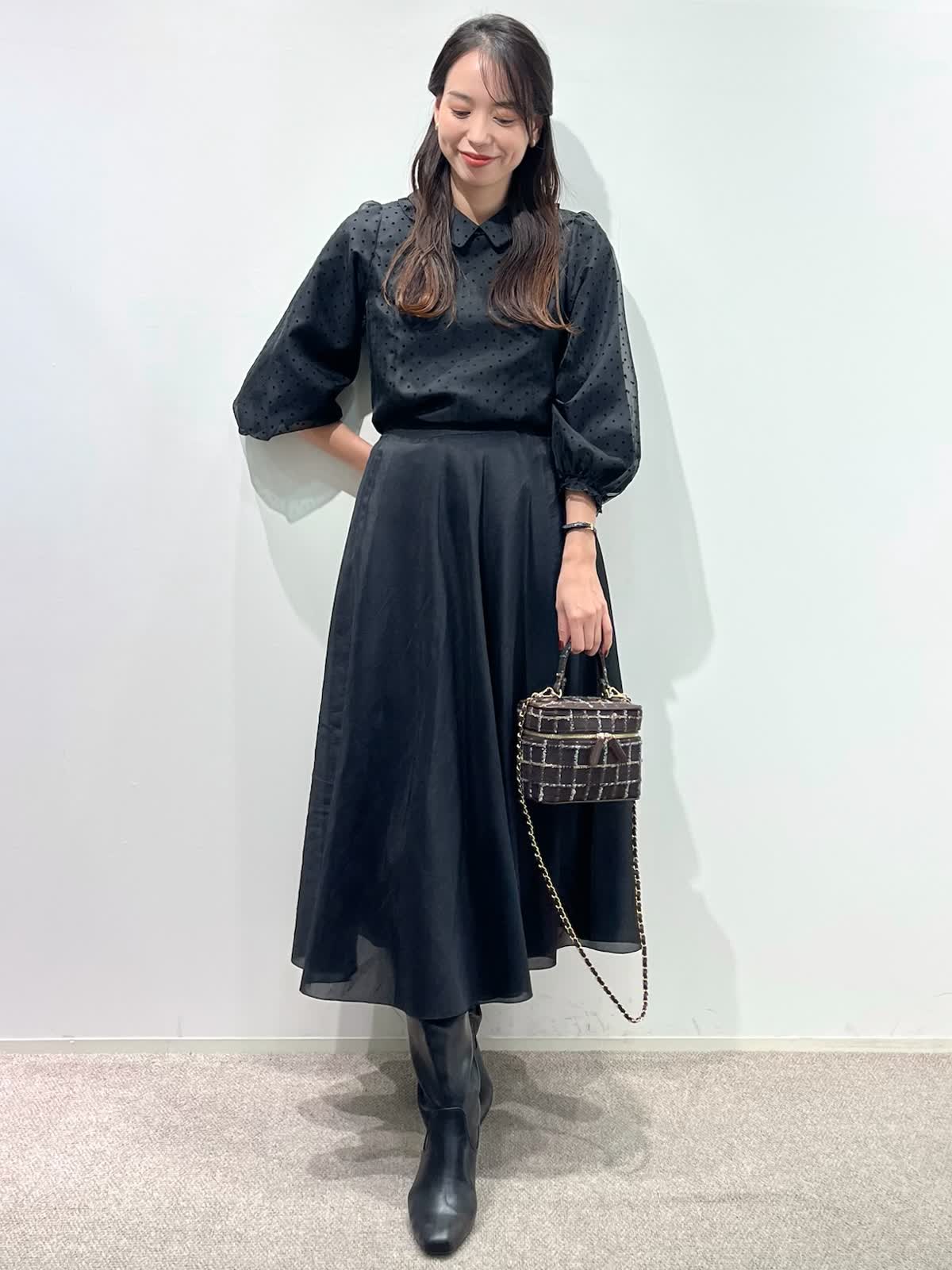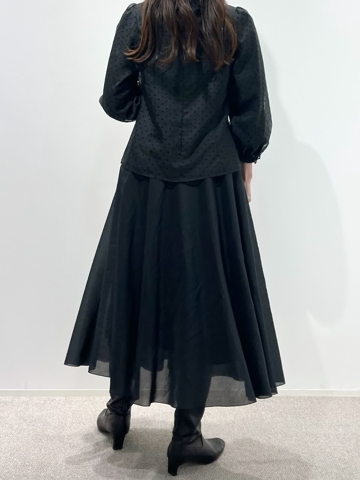 【着用サイズ】ブラウス:9号 スカート:11号 【着用カラー】ブラウス:ブラック スカート:ブラック バッグ:モカチャ 「ドット×モノトーンクラシカルコーデ」 オーガンジー素材が上品な印象の、ドット柄フリル襟ブラウス。モノトーンのボトムと合わせることで、クラシカルでモードな着こなしになります。二重のフリル襟と、袖口のギャザーのデザインがポイントで、アウターやジャケットのインナーに合わせるとより華やかな装いに。モノトーンのドット柄なので、コーデのポイントやベーシックスタイルにも大活躍。ウォッシャブル可能や、シーズン長く着用できるのも嬉しいポイント。スカートはウエストゴム仕様。裾のシアー感がモノトーンコーデを軽く見せてくれるので、重たくなりすぎず、おすすめです。
