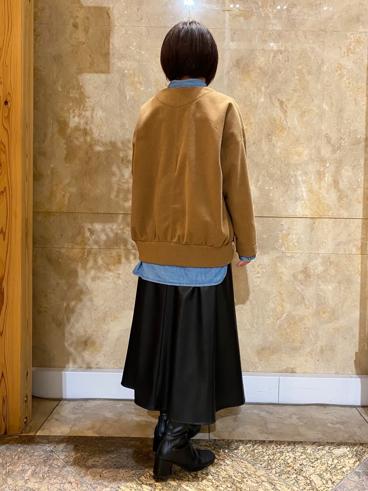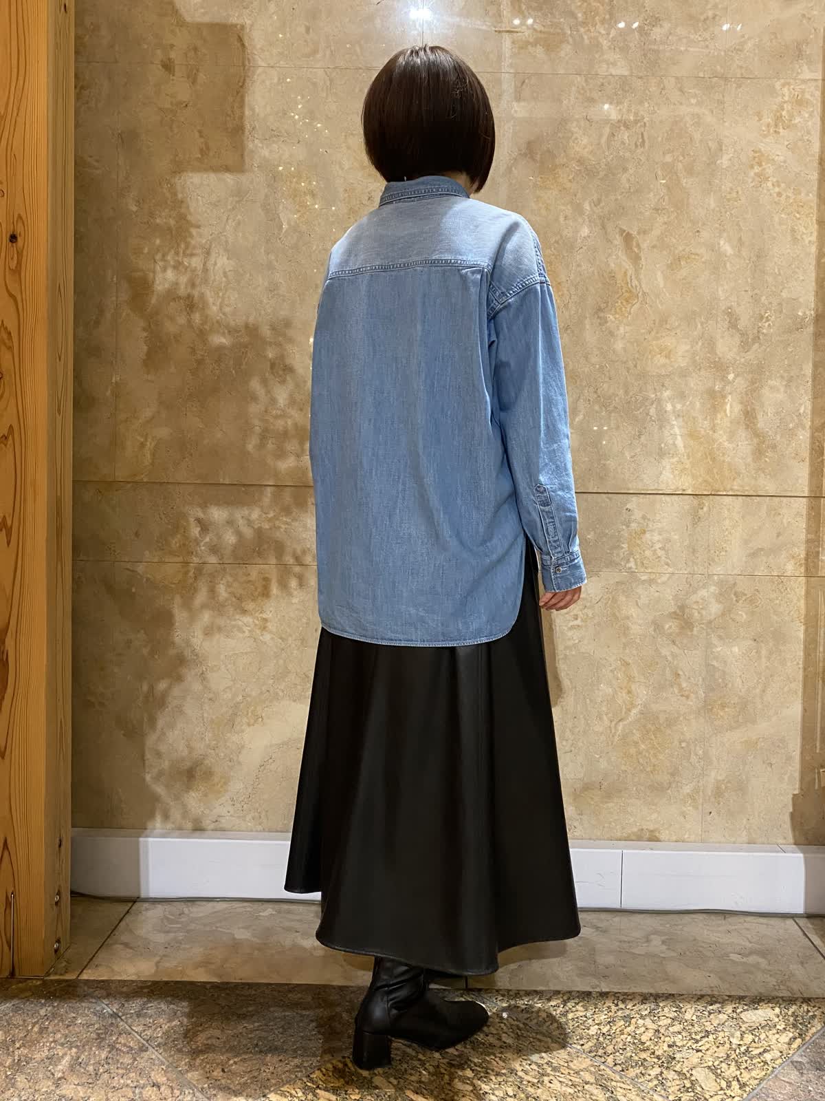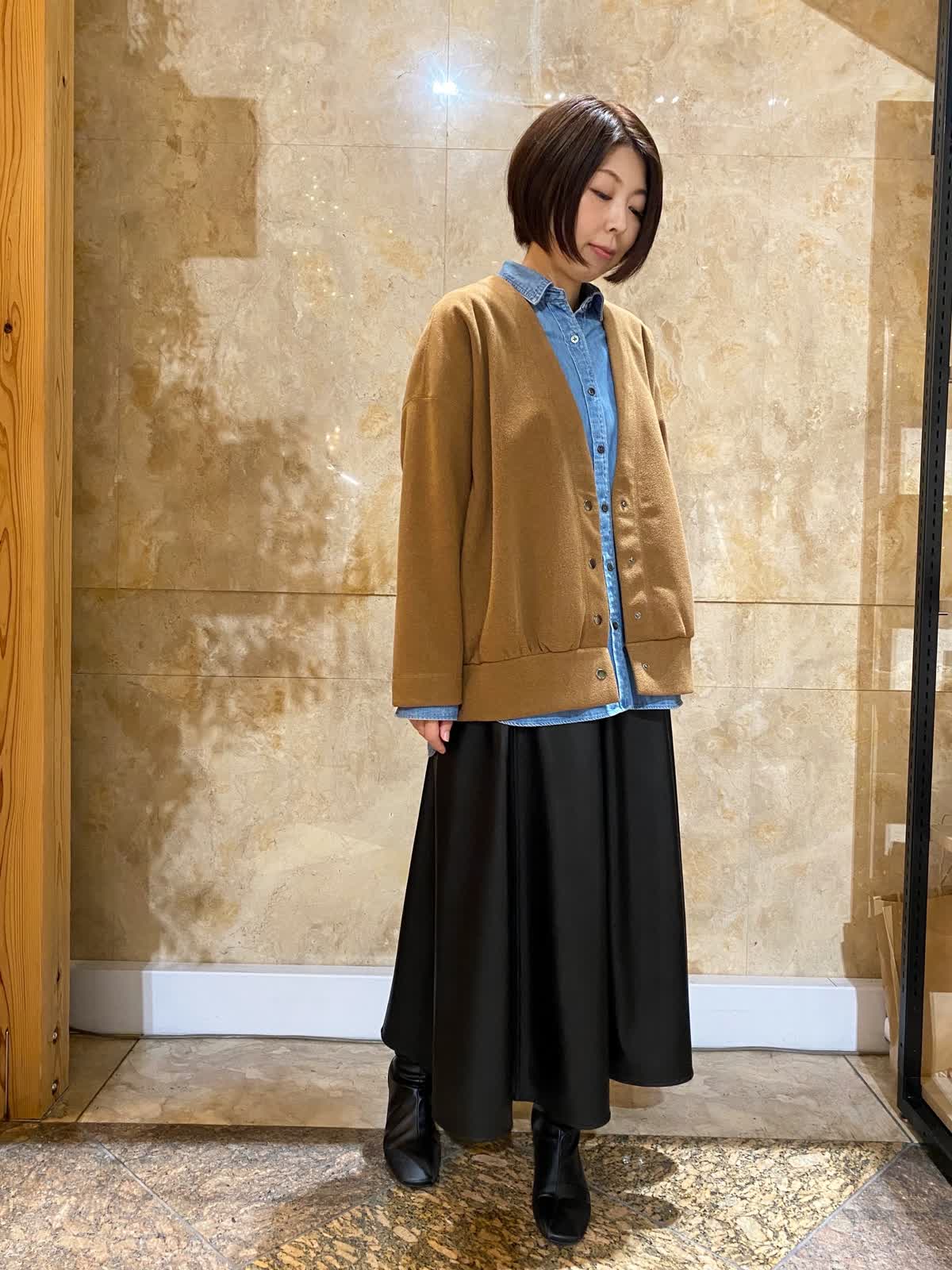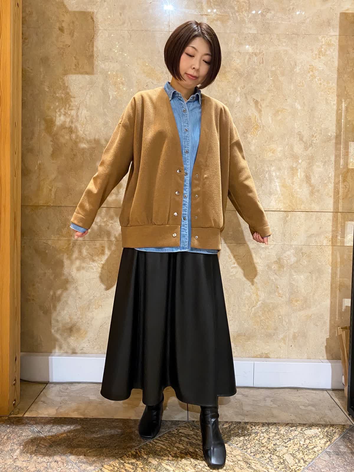 【着用サイズ/カラー】 カーディガン:フリーサイズ/キャメル シャツ : フリーサイズ/ブルー スカート : 9号/ブラック ぬくぬくリラックスコーデ。圧縮起毛の厚手カーディガンは、ウールは入っていないのにとにかく暖かいです。毛玉になりにくいのもうれしいポイント。デニムシャツは柔らかく着心地抜群。オーバーサイズで、インナーとしても羽織としてもいろんなアレンジが可能な優秀な1枚。スカートはソフトレザーで柔らかく、高級感あり。ウエスト後ろ部分だけゴムになっているので楽ちんです。