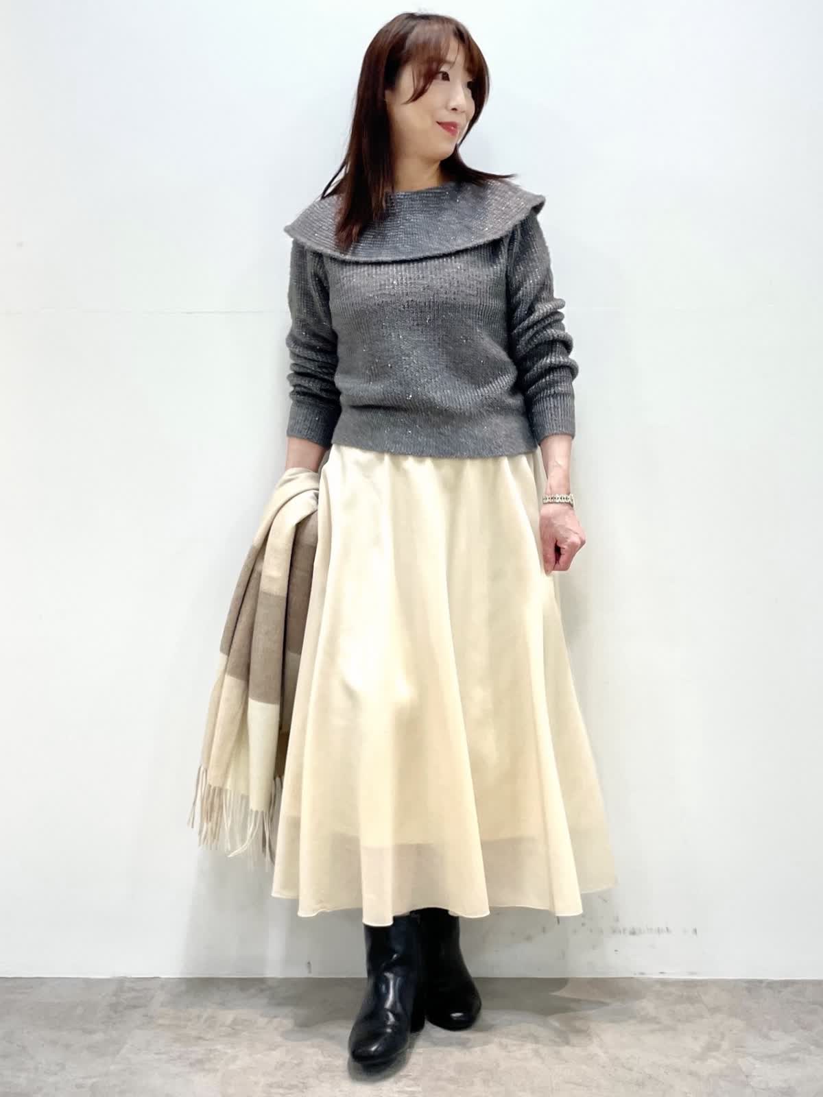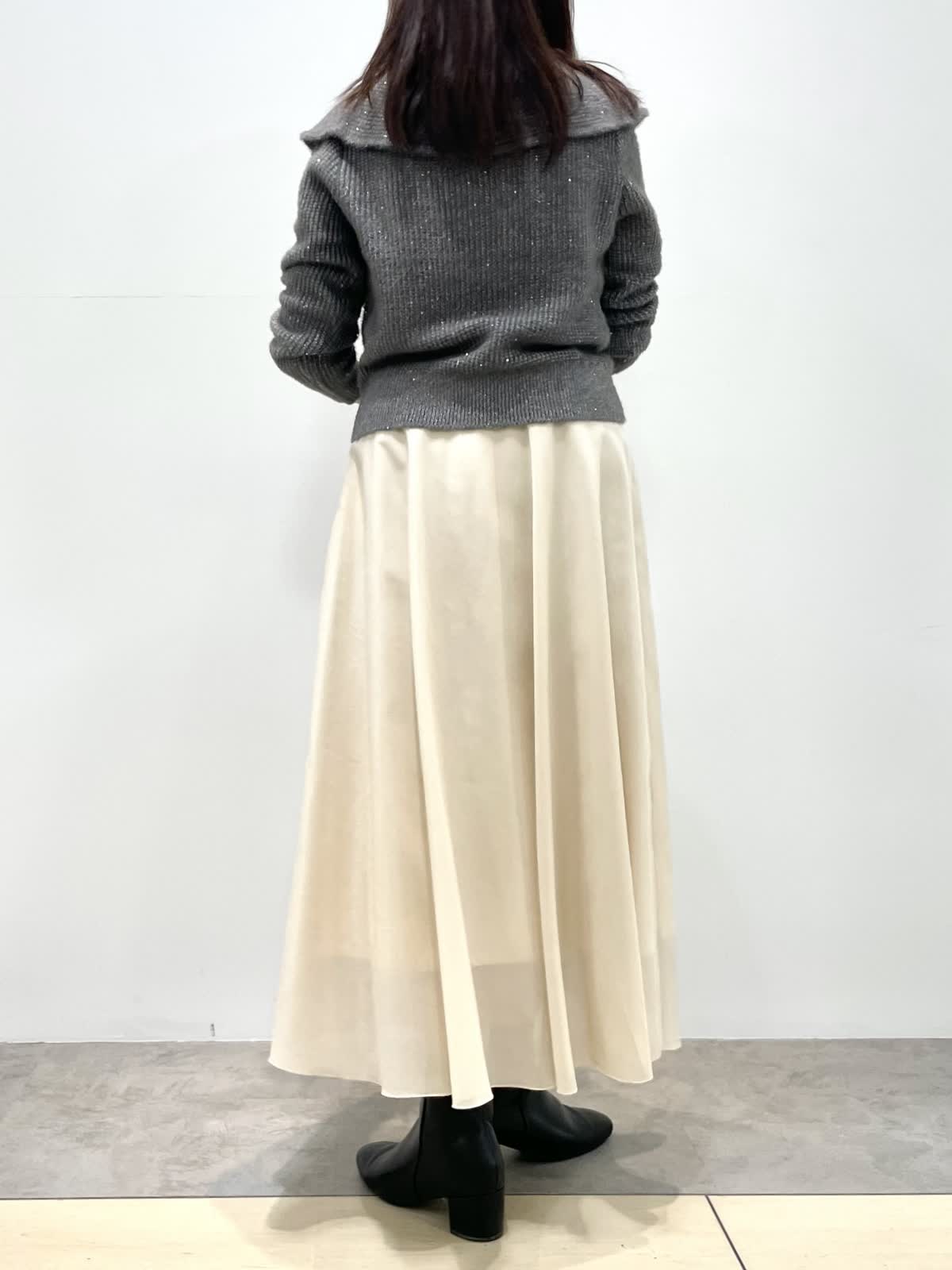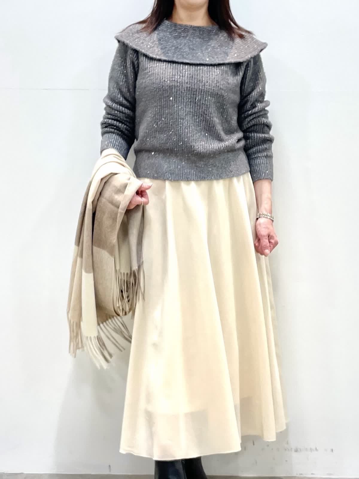 【着用カラー】全て9号 【着用カラー】ニット: グレー スカート: アイボリー 細かなスパンコールとラメ編み込んだ華やかニット。クリスマスや忘年会、イベントにお勧めな映えニットです。スカートは厚手のオーガンジー素材。裏地が短く裾に透け感があります。すっきりとしたシルエットで様々なトップスに合わせやすいです。