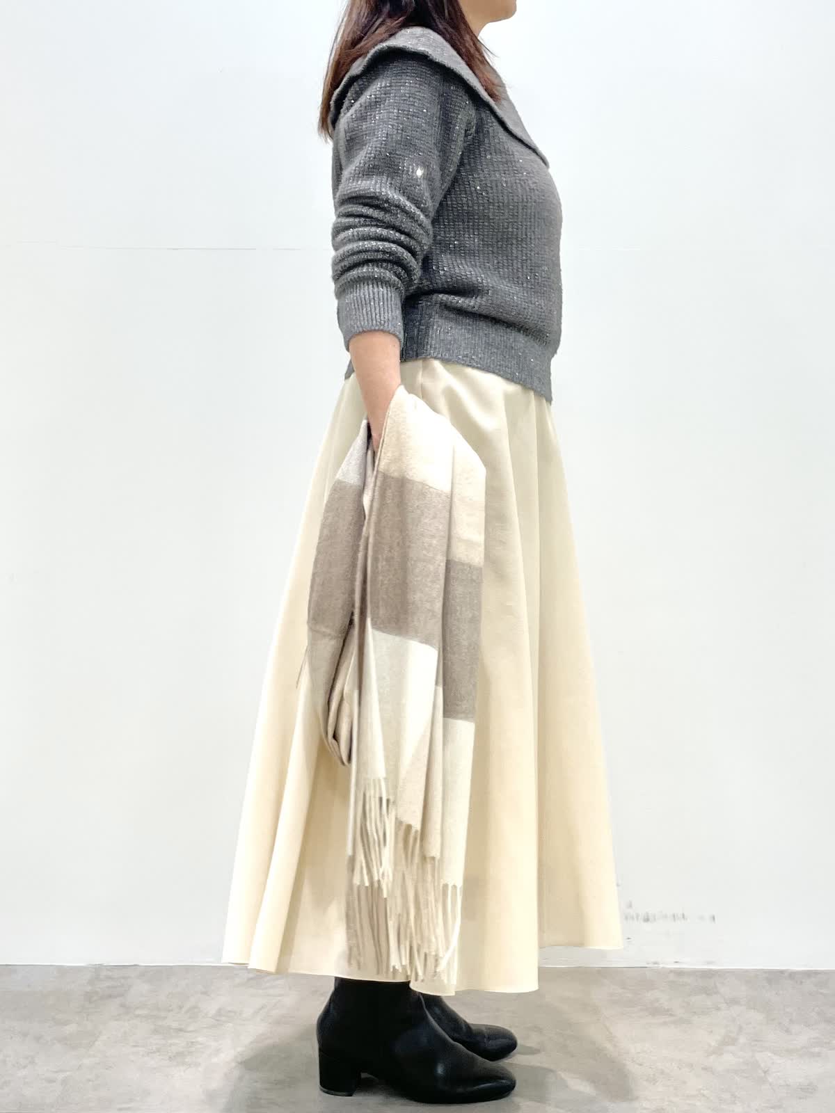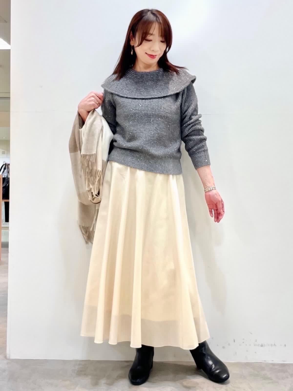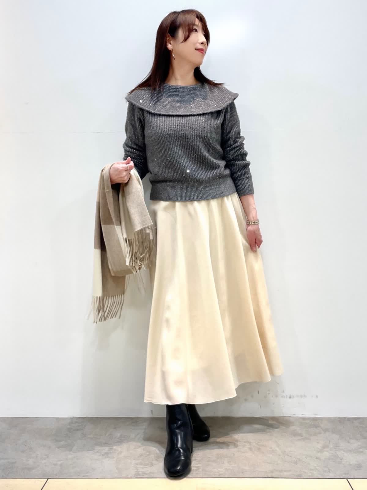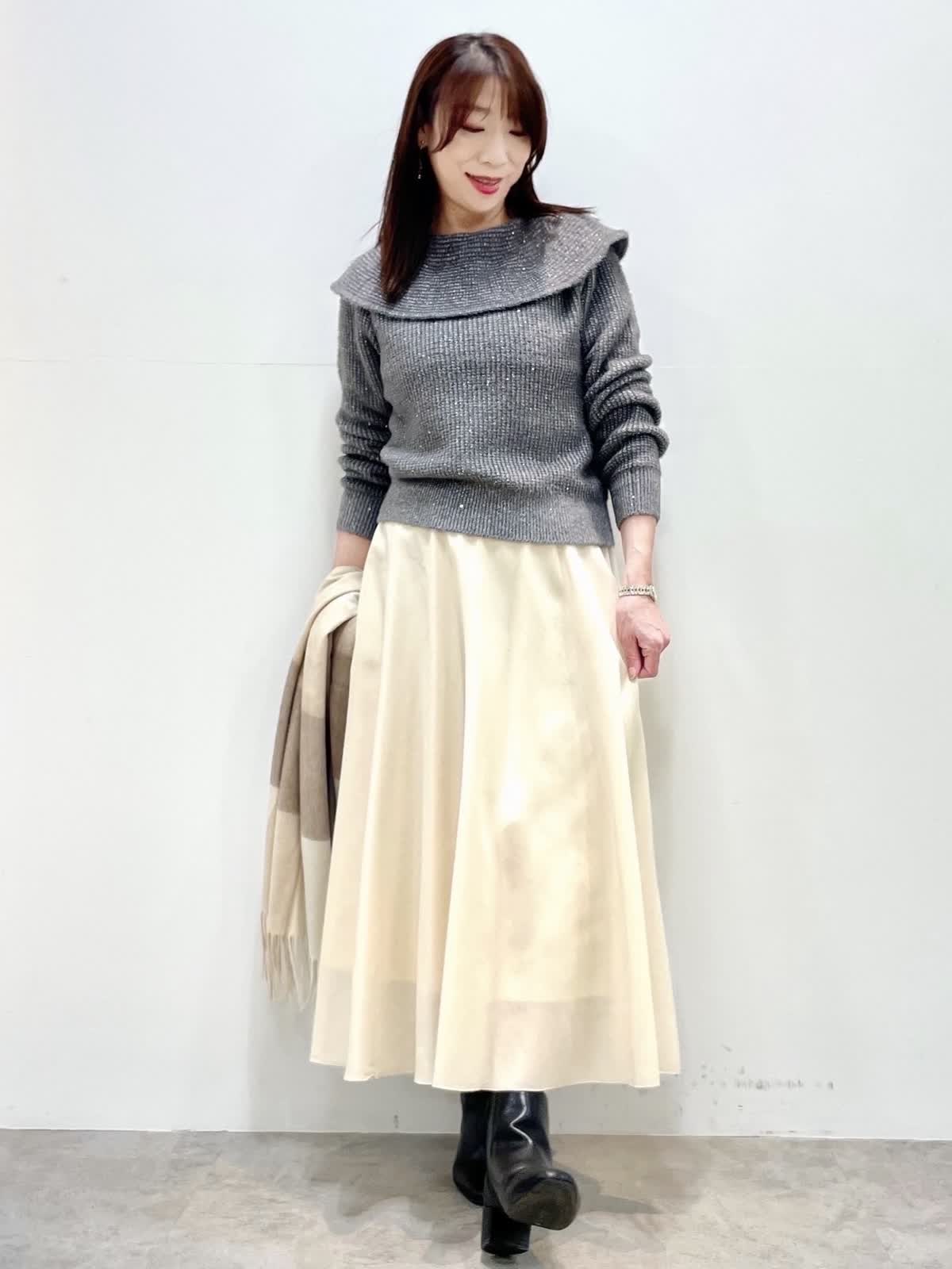 【着用カラー】全て9号 【着用カラー】ニット: グレー スカート: アイボリー 細かなスパンコールとラメ編み込んだ華やかニット。クリスマスや忘年会、イベントにお勧めな映えニットです。スカートは厚手のオーガンジー素材。裏地が短く裾に透け感があります。すっきりとしたシルエットで様々なトップスに合わせやすいです。