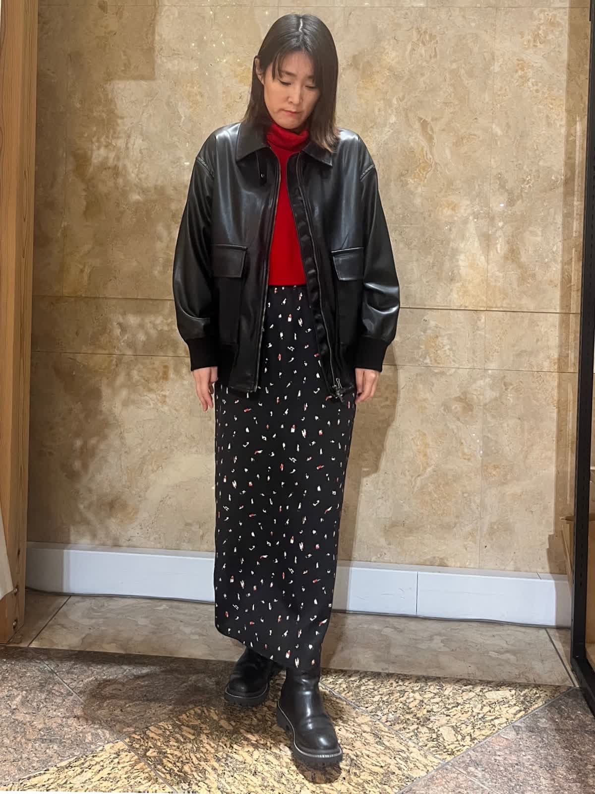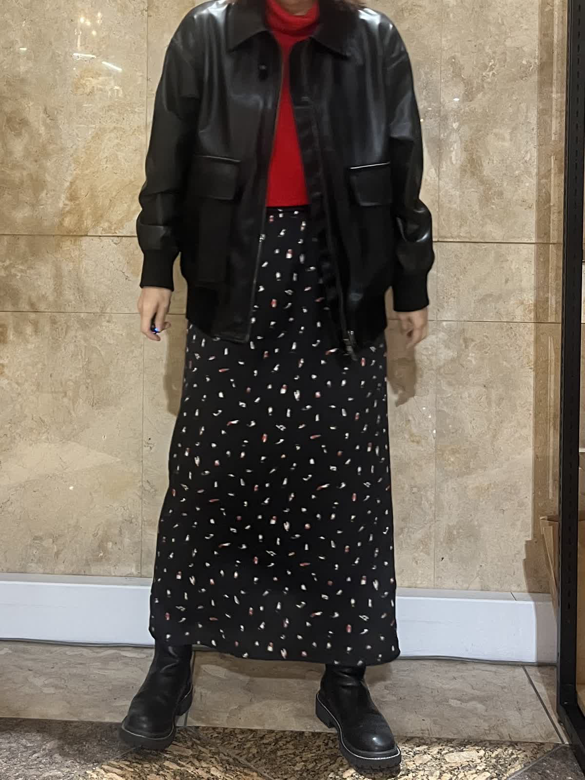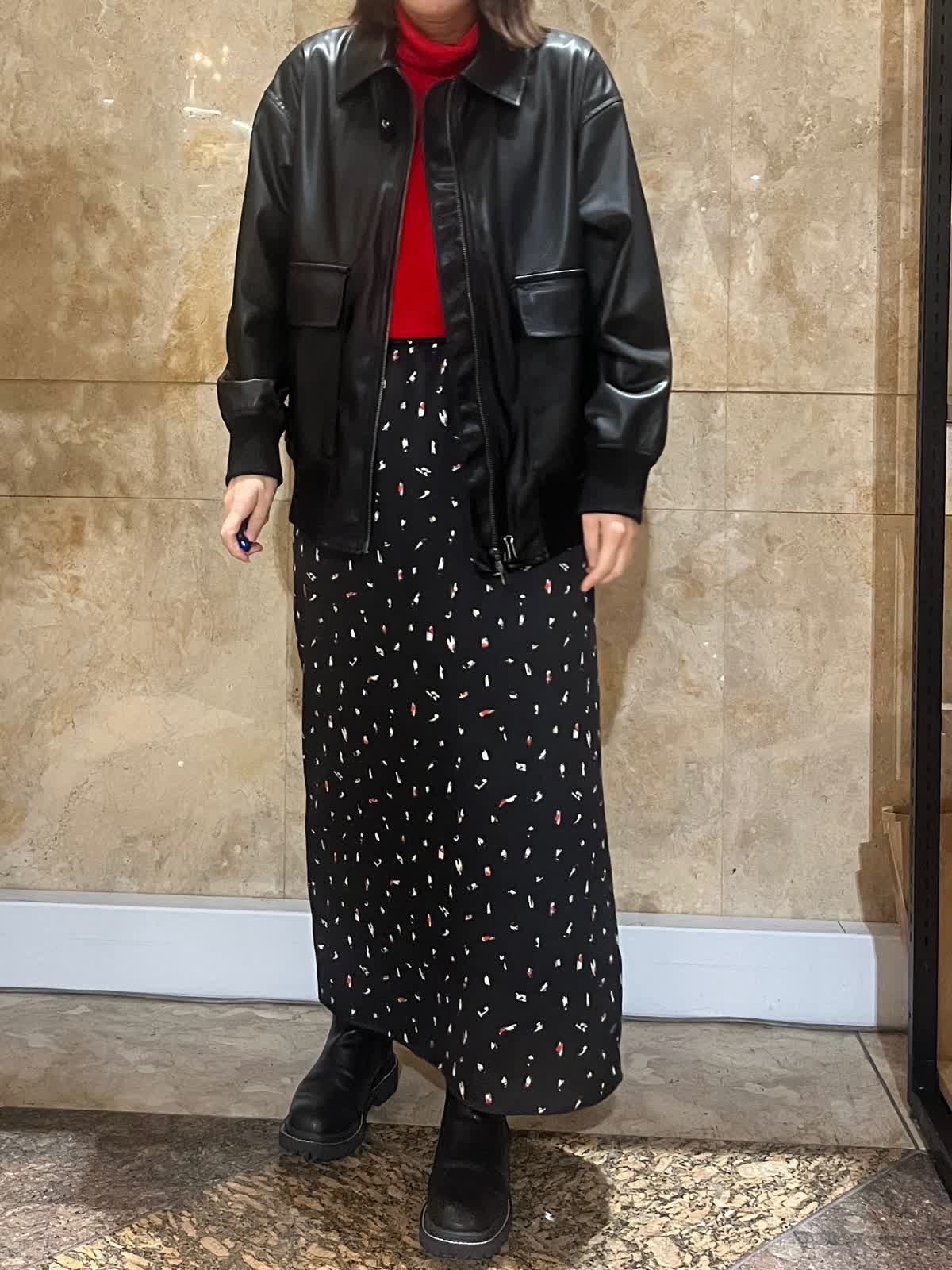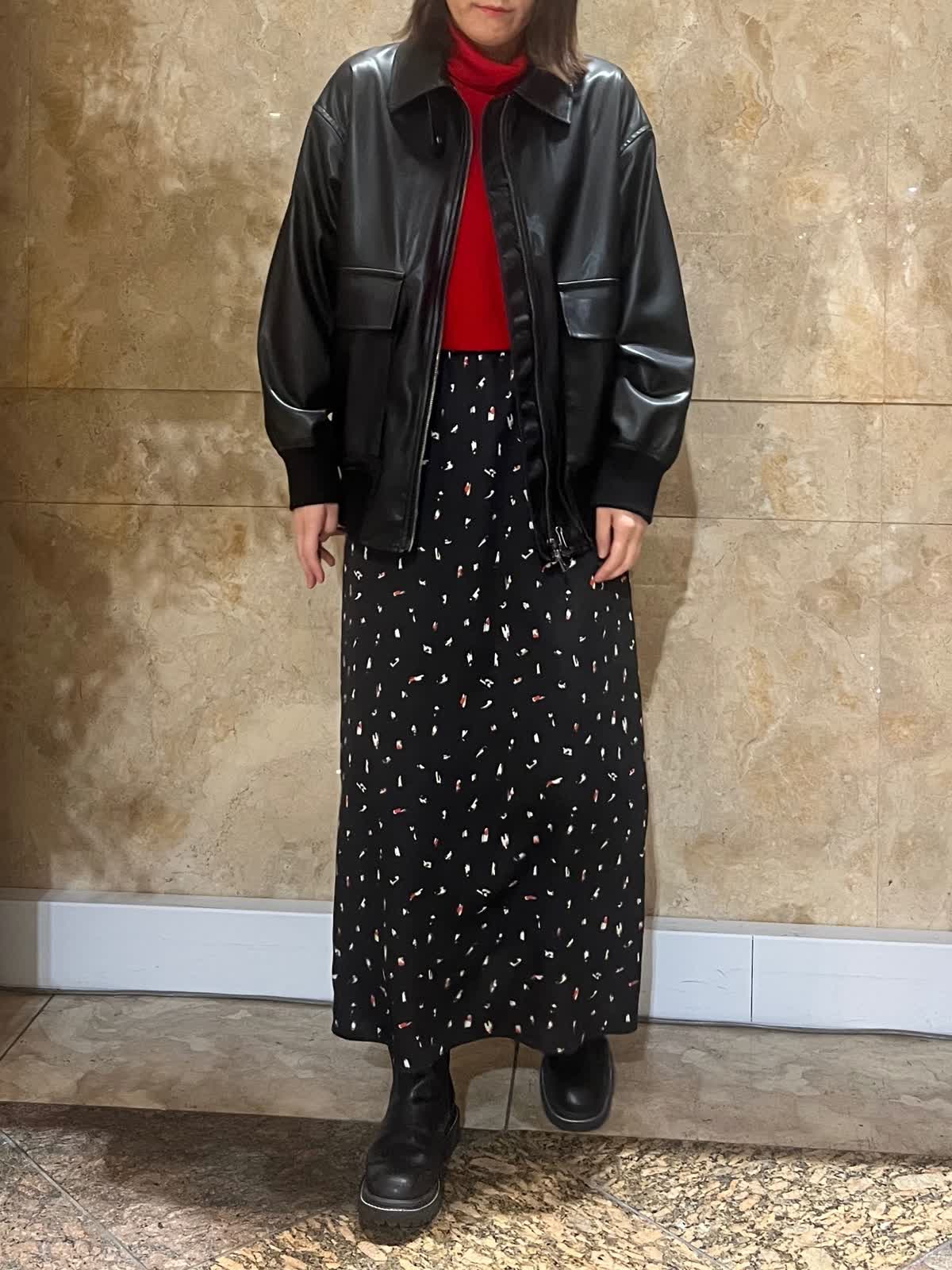【着用サイズ/カラー】レザージャケット:フリーサイズ/ブラック ニット:フリーサイズ/レッド スカート:フリーサイズ/ブラック レザージャケットはトレンドのアイテム。合皮になるのでお手頃価格です。 丈感も安心丈ですのでスカート、パンツ何でも合わせやすいです。