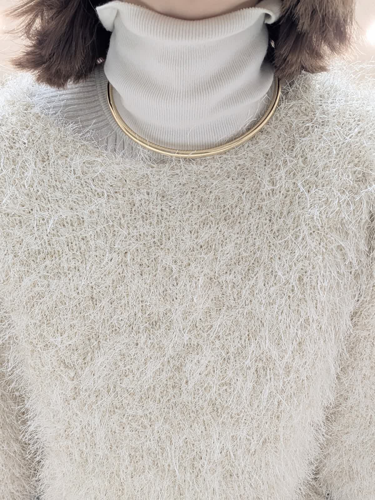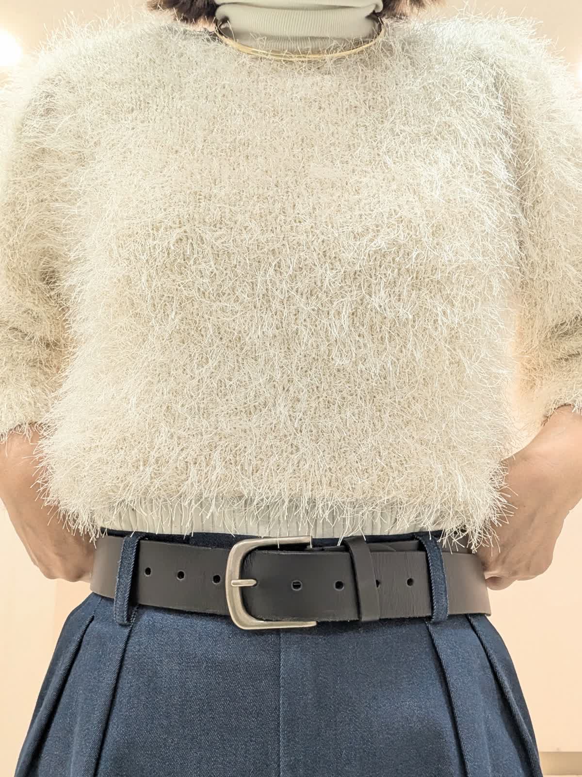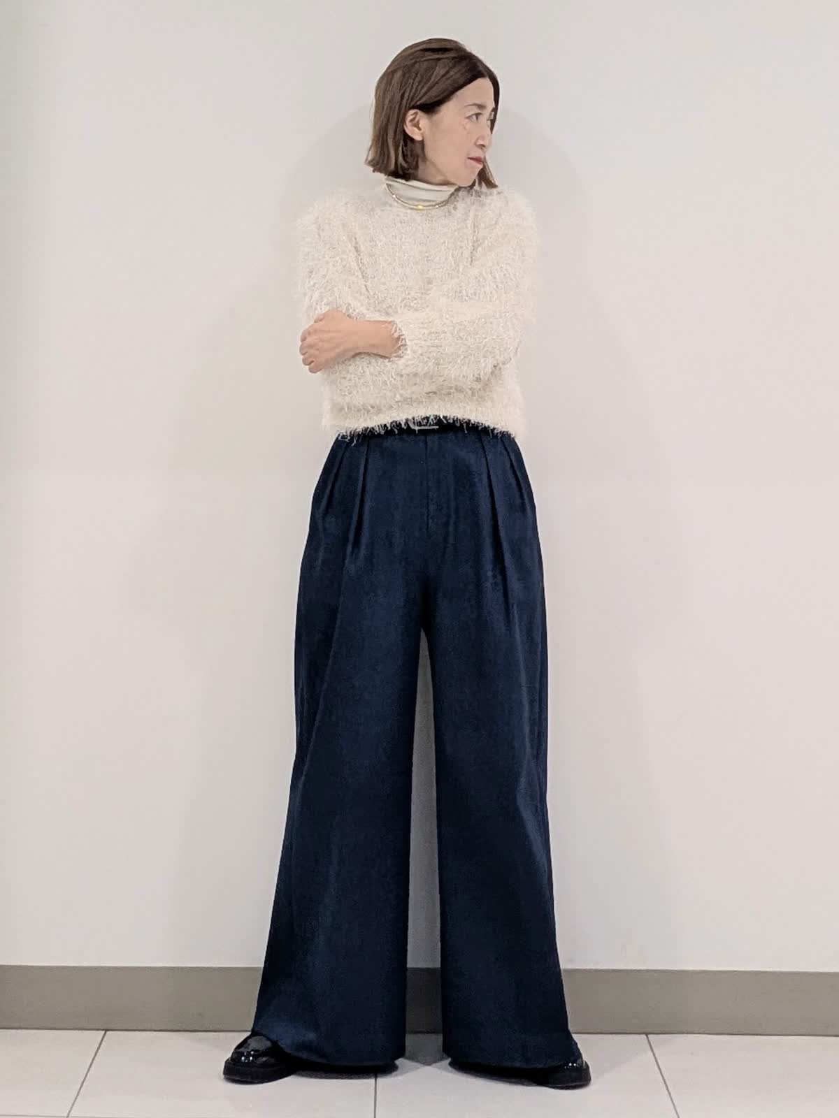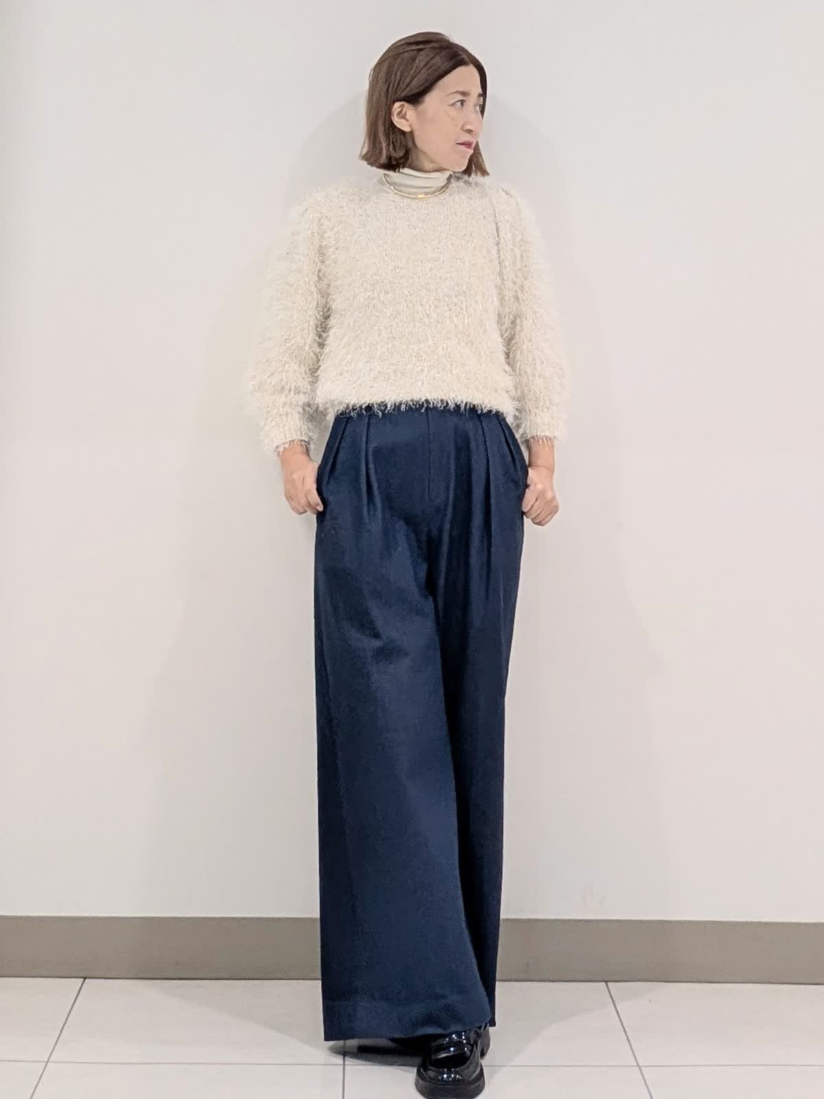 【着用サイズ トップス9号/パンツ7号】 袖はフワッとさせ七分丈にし全体をスッキリとした印象に仕上げた華やかな女性らしさを出せるニット。 合わせ方でカジュアルにもフェミニンにも◎ インナーを合わせても雰囲気が変わり今年らしい印象に。 合わせたボトムスは、Oggi掲載商品三尋木奈保コラボのタックワイドパンツ。生地にハリ感がありワイドレッグがオシャレなポイント。 新しいアイテムがプラス。