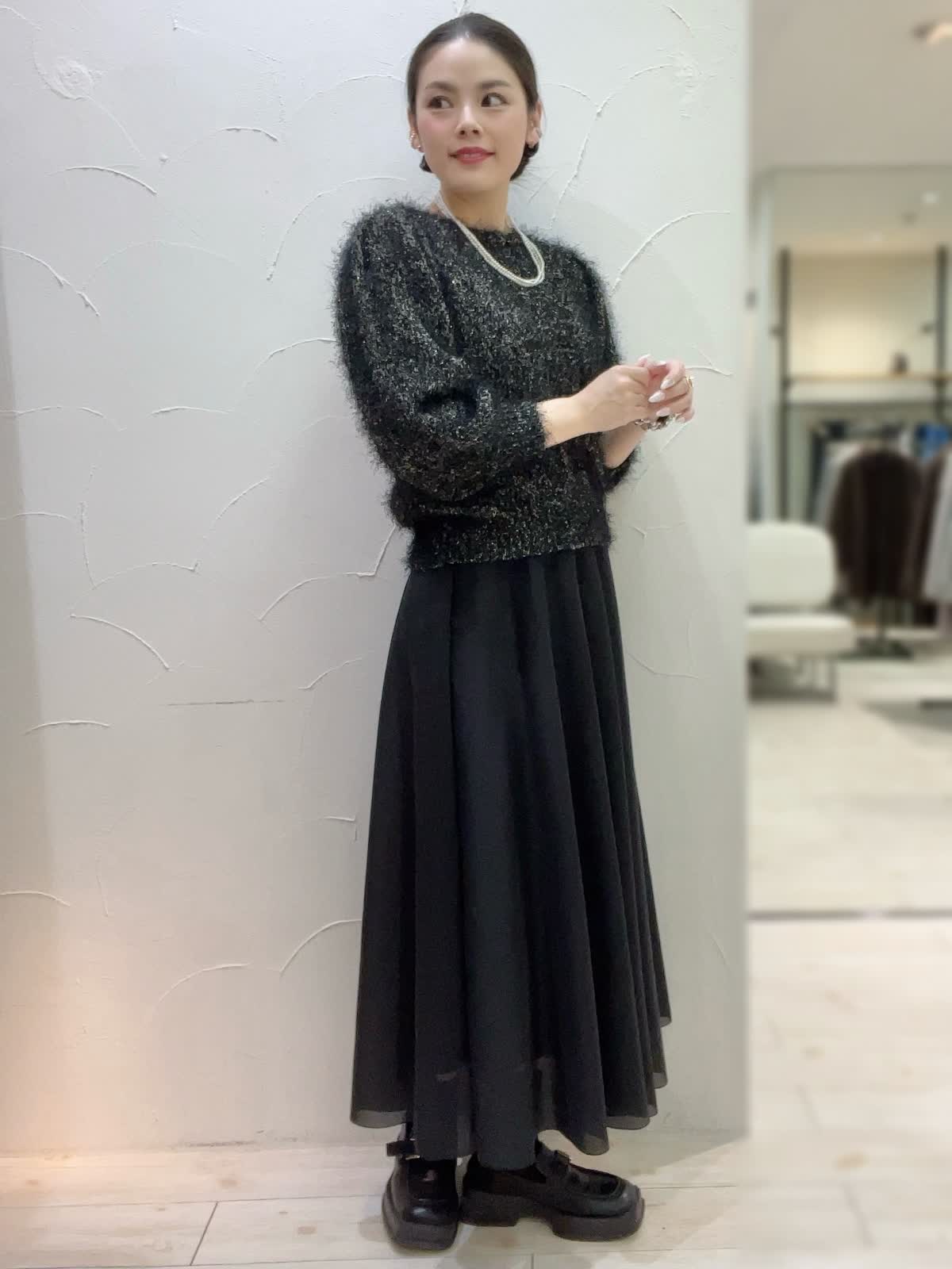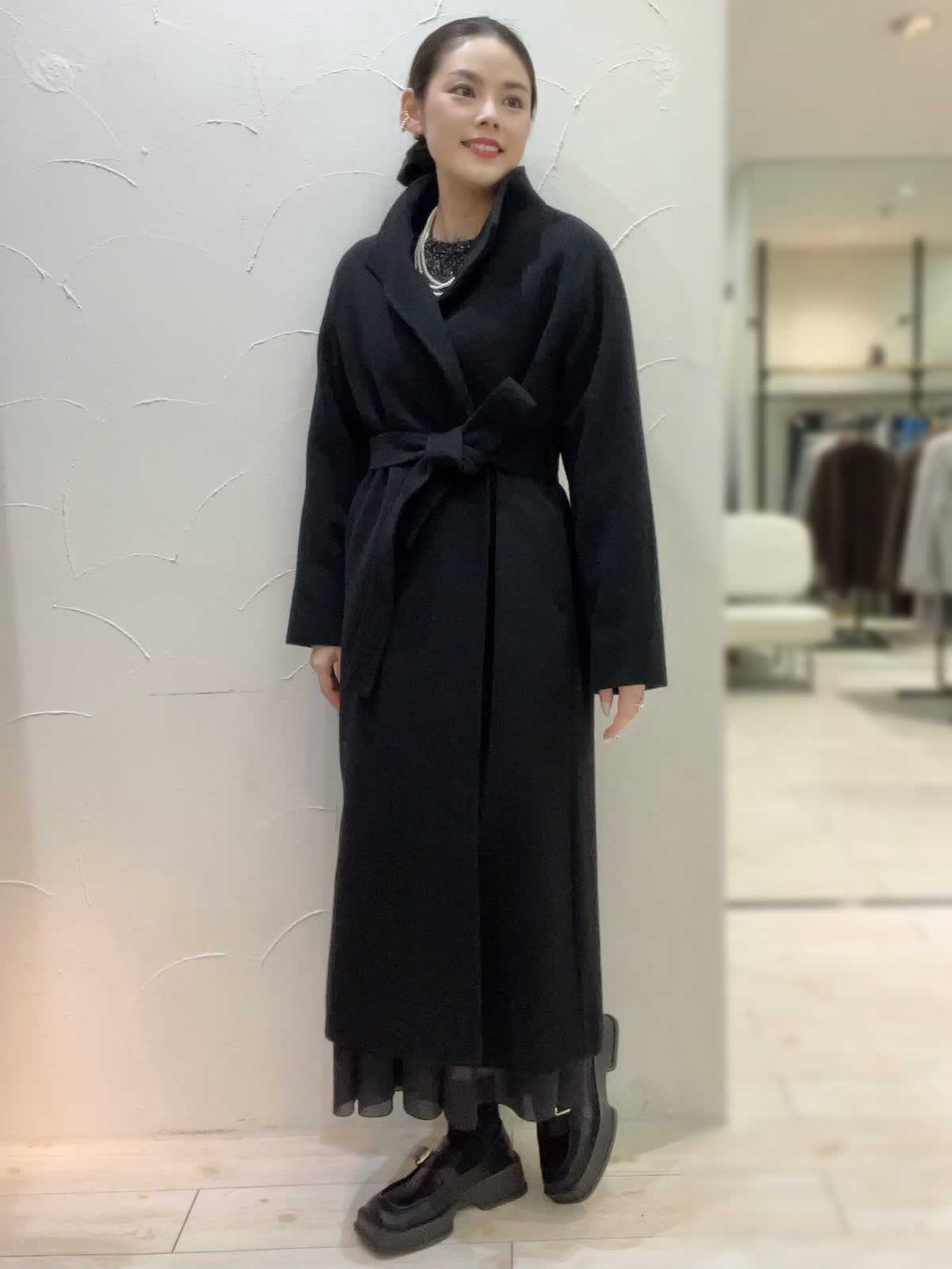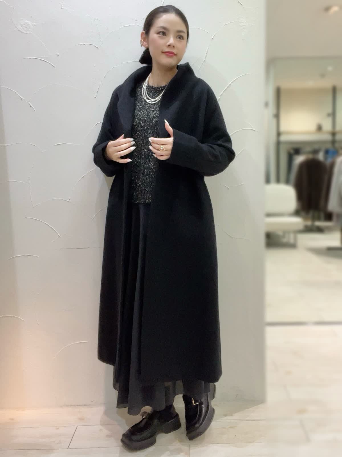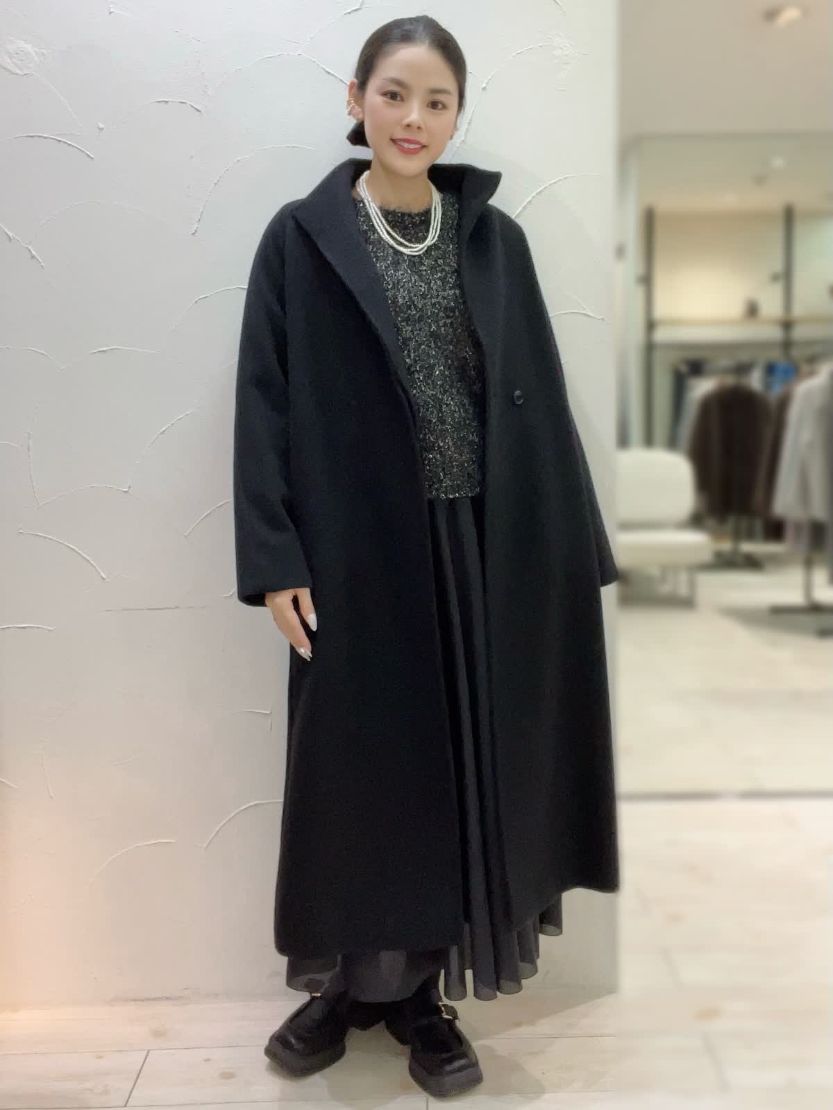 【着用サイズ】全て9号orフリーサイズ 【着用カラー】コート:ブラック ニット:ブラック スカート:ブラック 特別な日のおでかけに。ブラックでまとめた大人なコーディネート。ニュアンスのあるニットとシアー感のあるスカートが大人な女性にぴったり。コートは高めのウエストでスタイルアップして見えるデザイン。