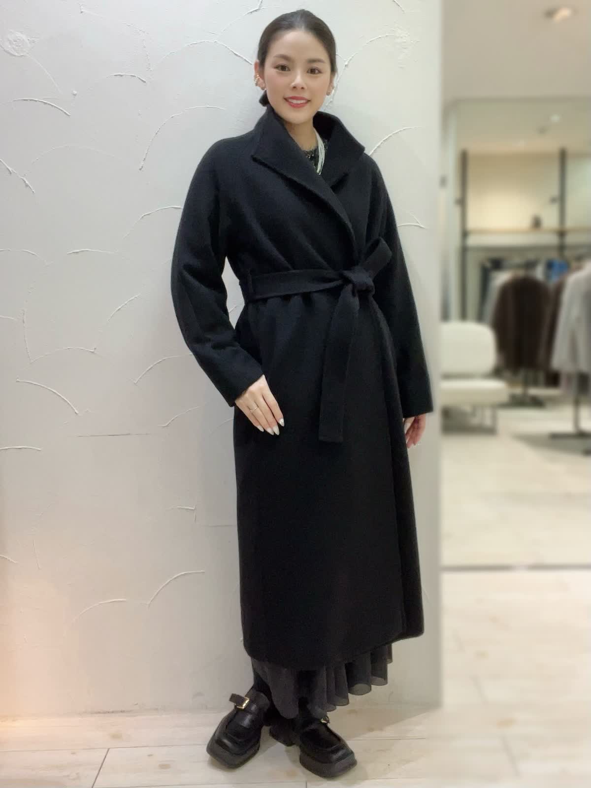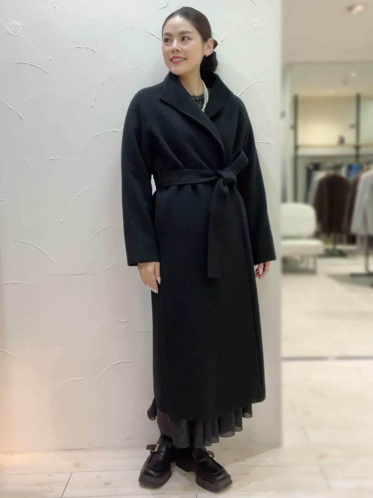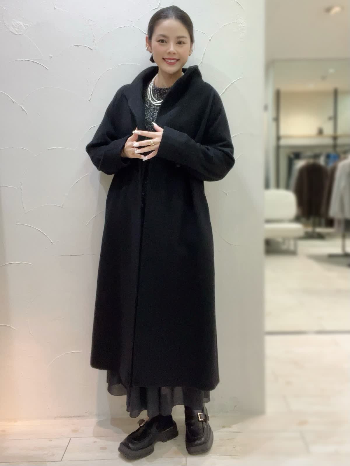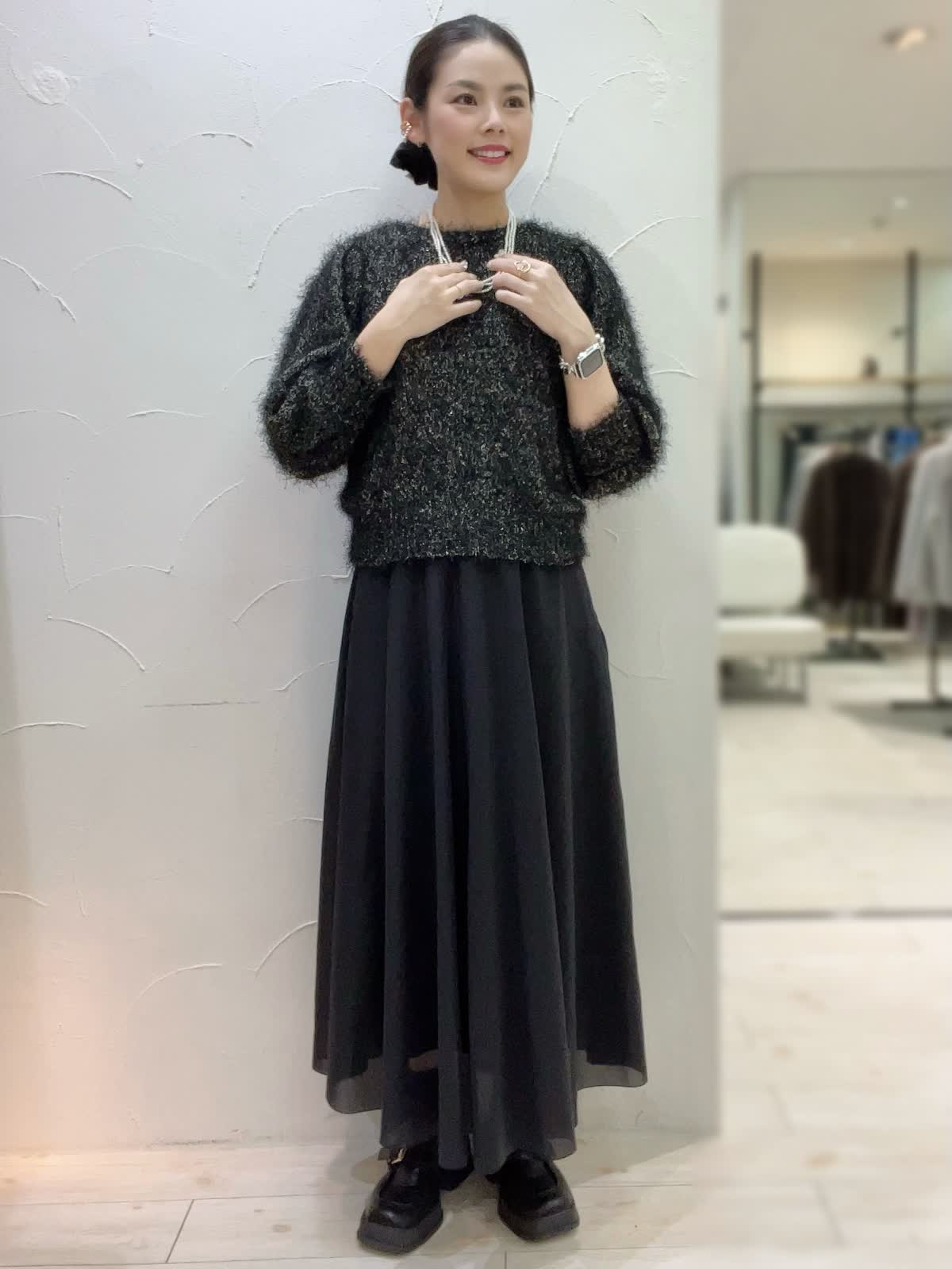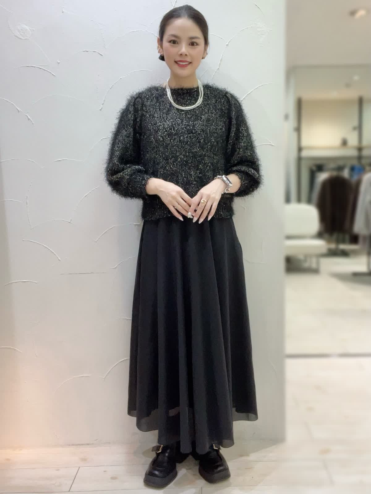 【着用サイズ】全て9号orフリーサイズ 【着用カラー】コート:ブラック ニット:ブラック スカート:ブラック 特別な日のおでかけに。ブラックでまとめた大人なコーディネート。ニュアンスのあるニットとシアー感のあるスカートが大人な女性にぴったり。コートは高めのウエストでスタイルアップして見えるデザイン。