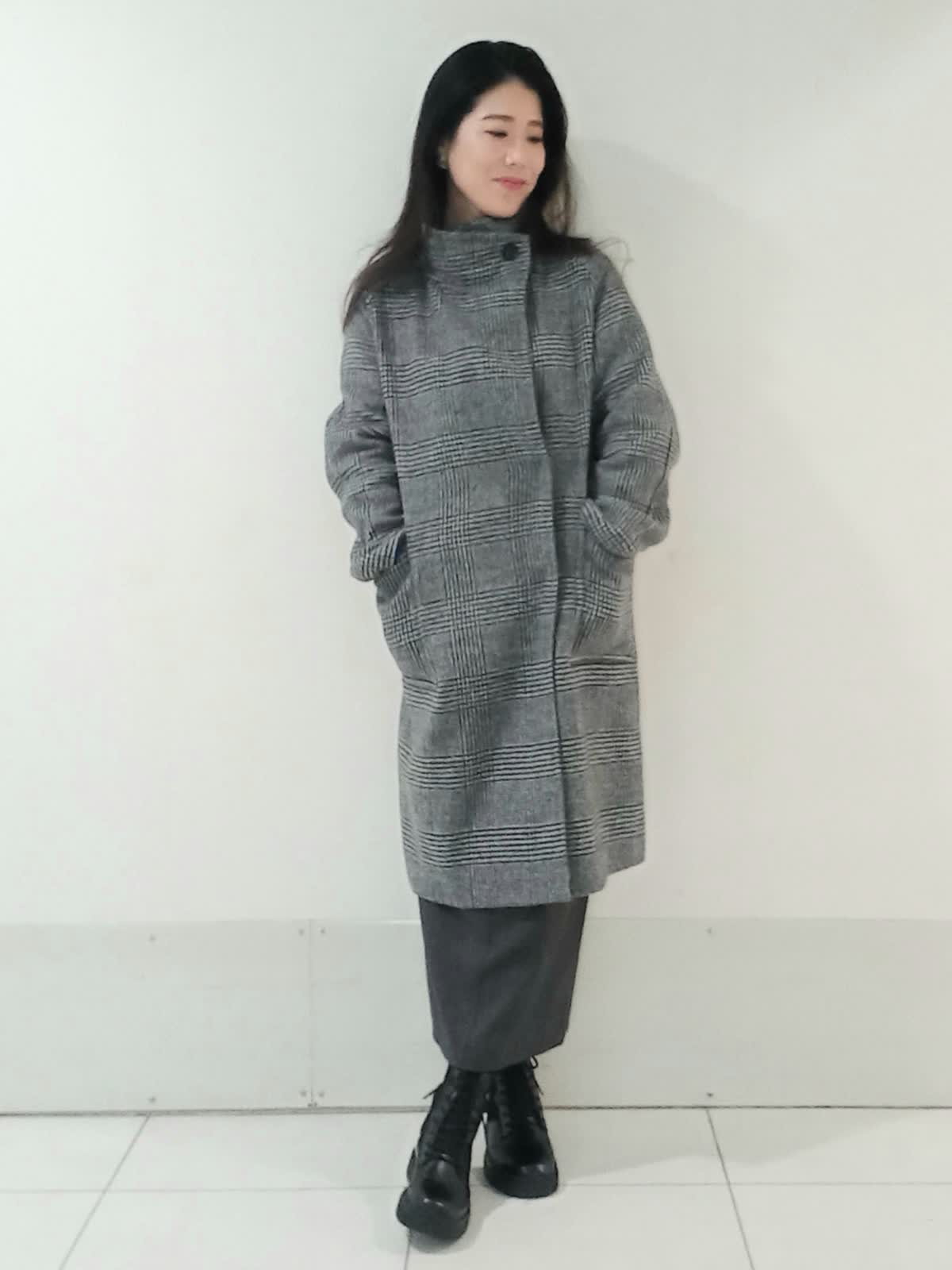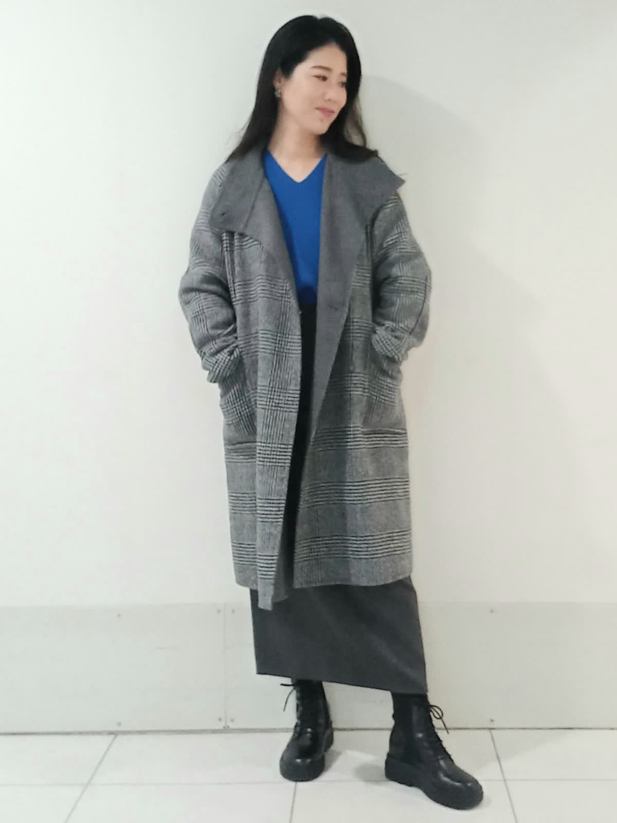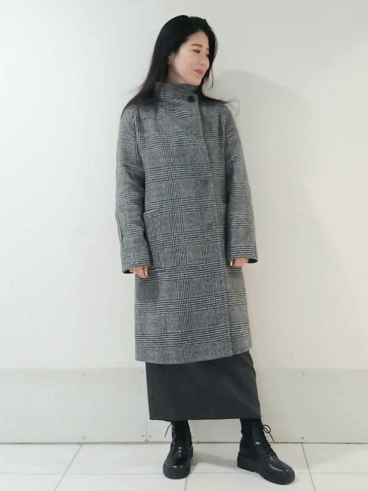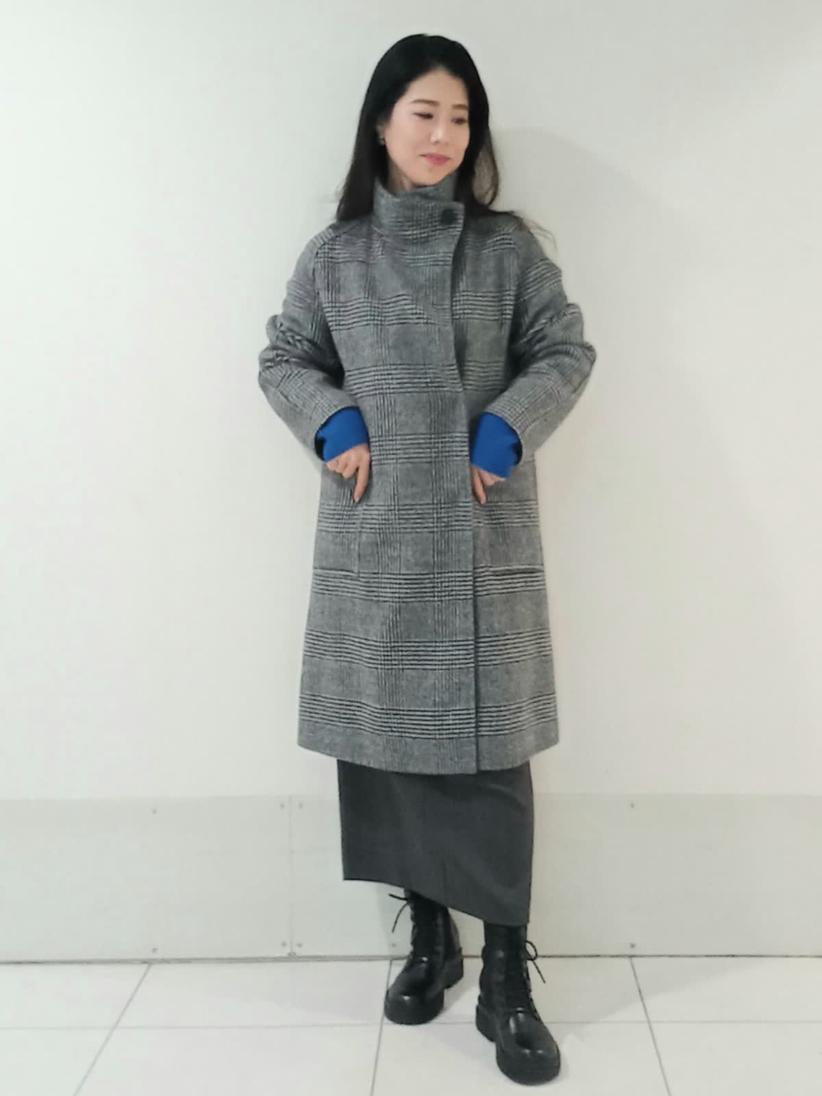 【着用サイズコート9号、ニット9号、スカート9号】 スタンドカラーにもなる襟元のデザインが、かっちりとした大人の雰囲気を演出しています。 グレンチェック柄がクラシックで、シンプルなIラインシルエットに深みを与えています。 上品なクラシカル柄のコートを主役に、鮮やかなブルーニットを効かせた、スタイリッシュで大人なIラインシルエットのコーディネートです!
