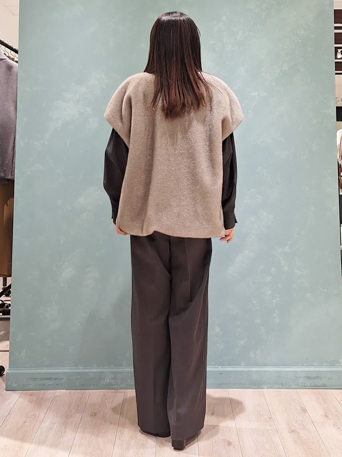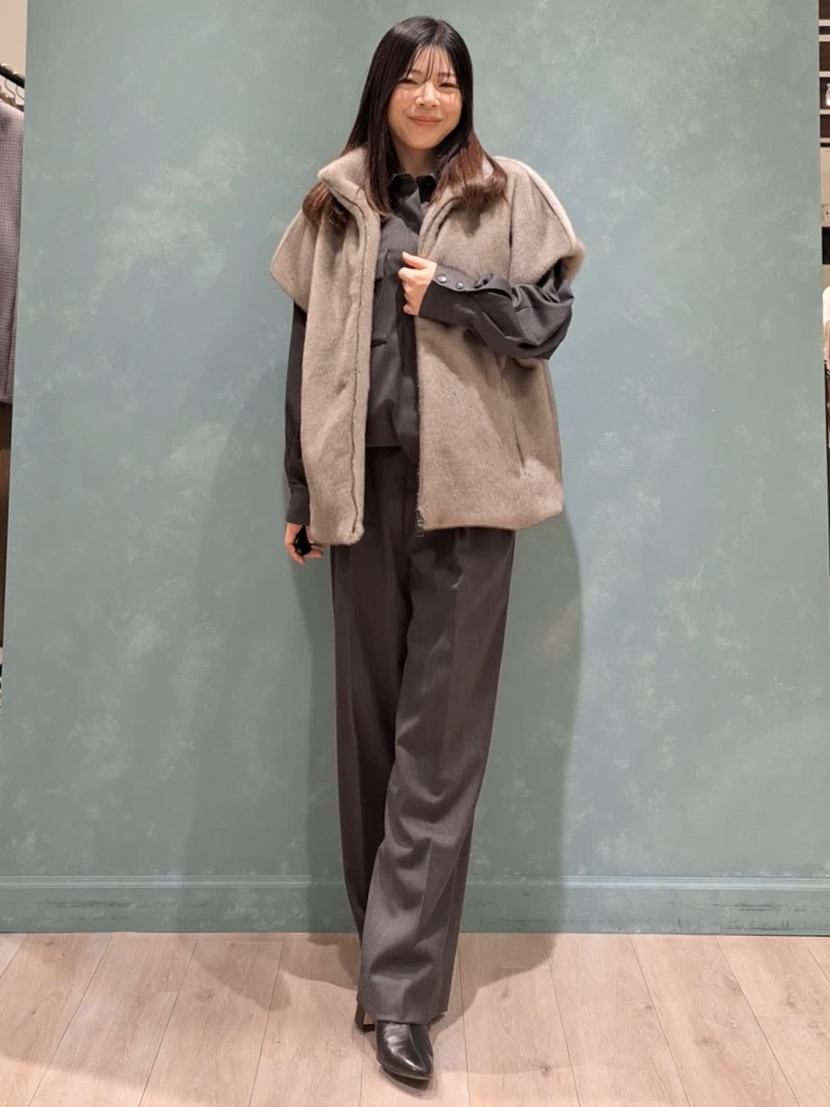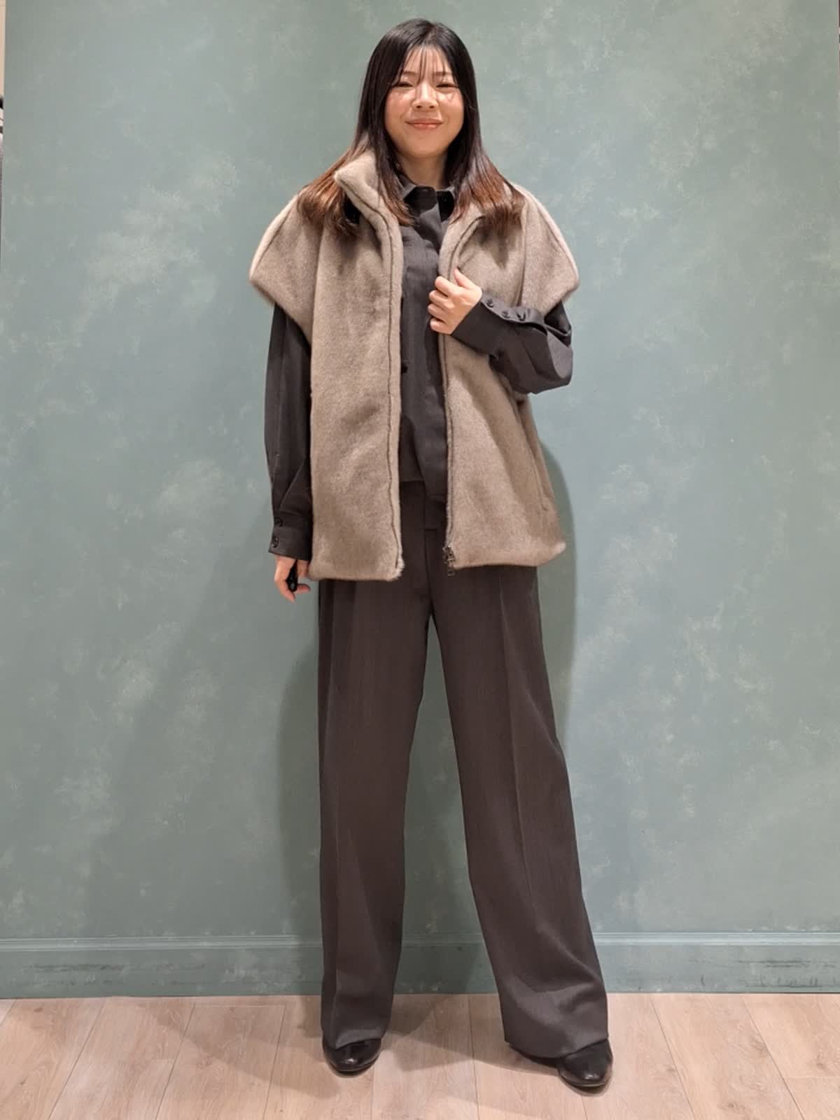 【着用サイズ、カラー】ジレ:9号、グレーベージュ ブラウス:9号、チャコールグレー パンツ:7号、チャコールグレー 格好いいパンツスタイルのセットアップに、エコファージレを合わせてオシャレ度UP!エコファージレは腰回りが隠れる安心の着丈で、裾を絞って表情を変えれます。肌触りが抜群で柔らかいので着心地◎コーディネートのアクセントにお勧めのアイテムです!インナーのセットアップは、サテン調の光沢のある生地で品あり。ブラウス、パンツどちらもゆったり着れる楽チンタイプです!