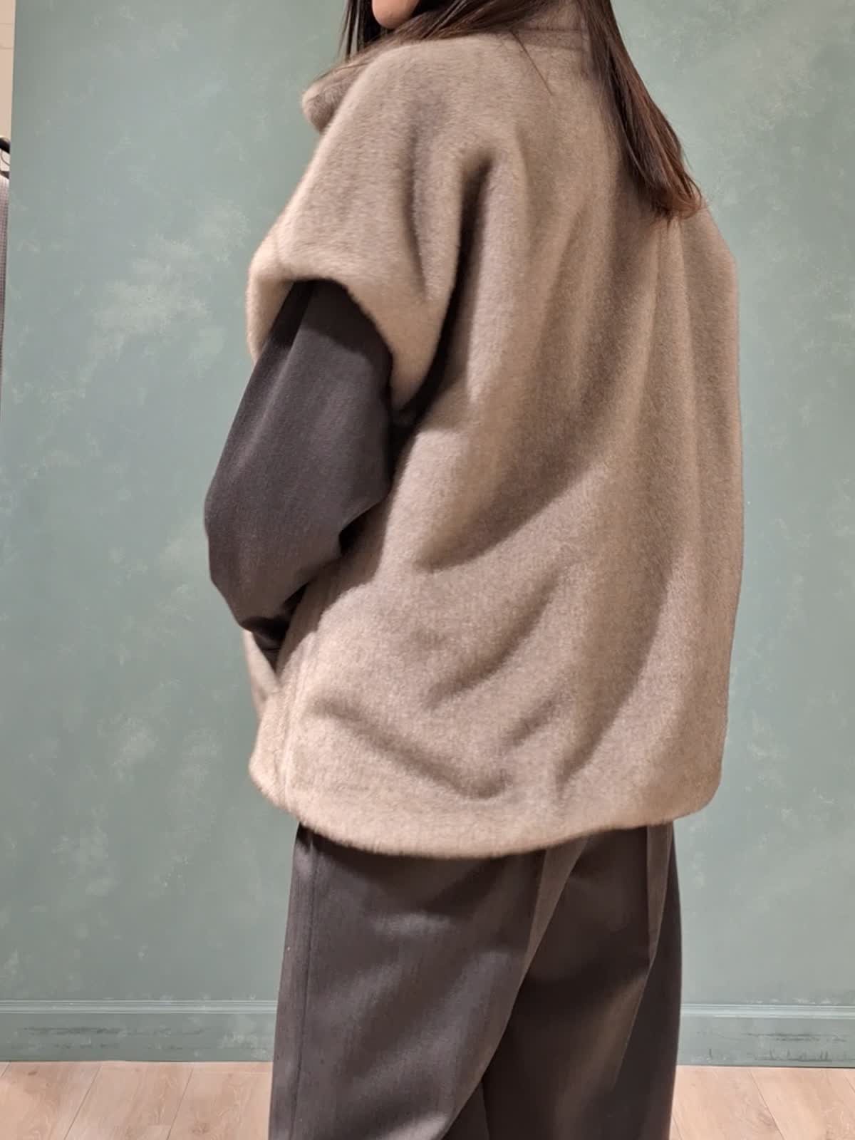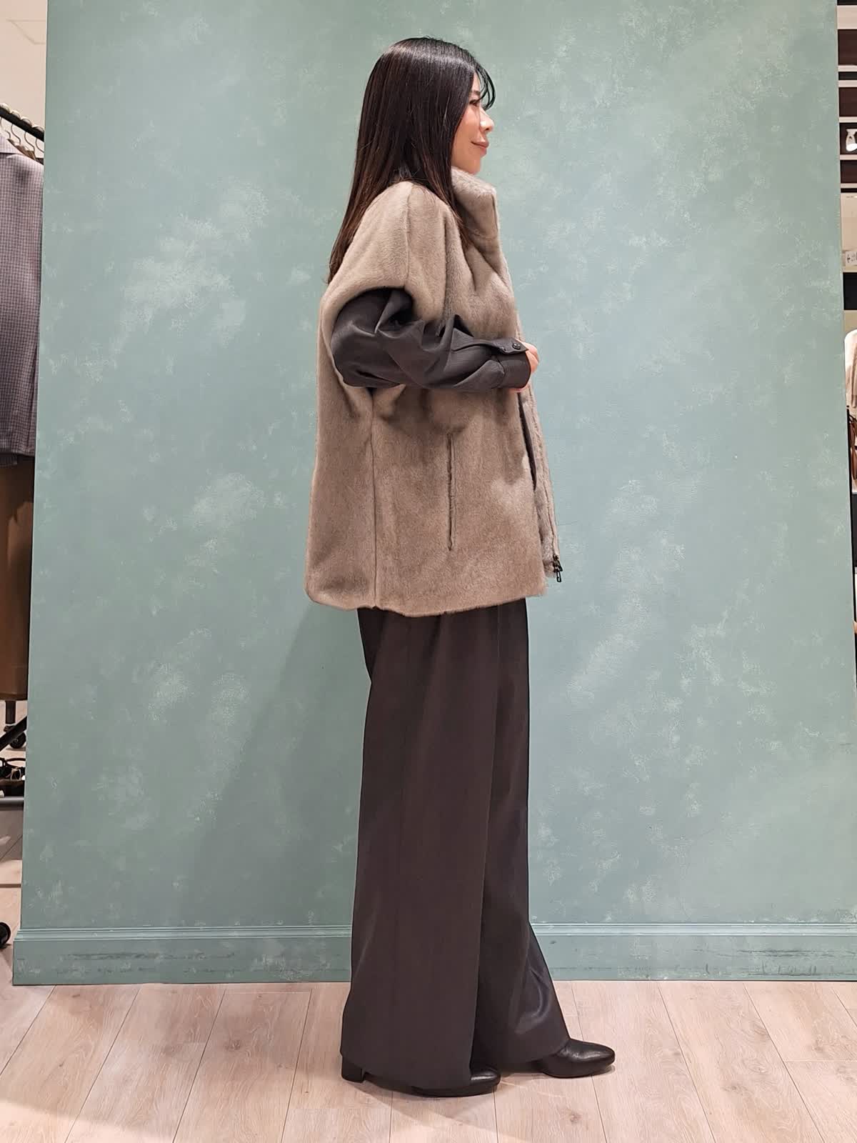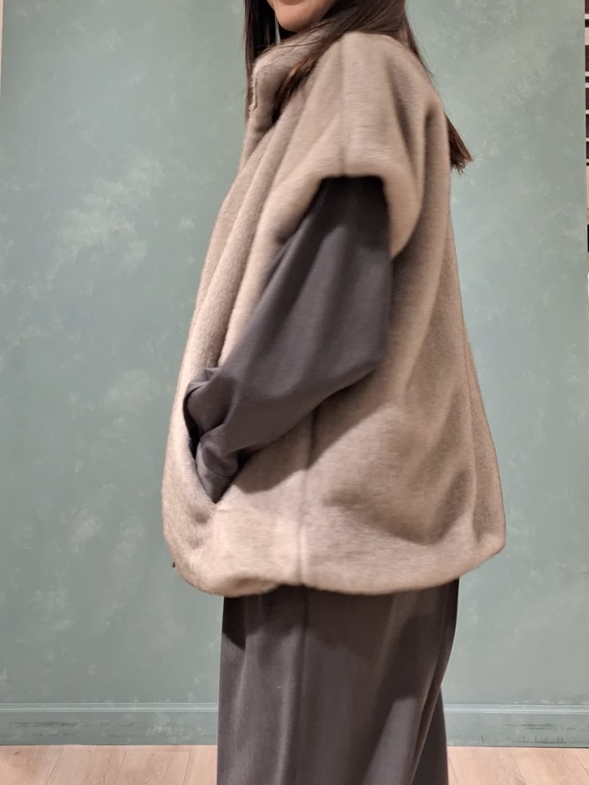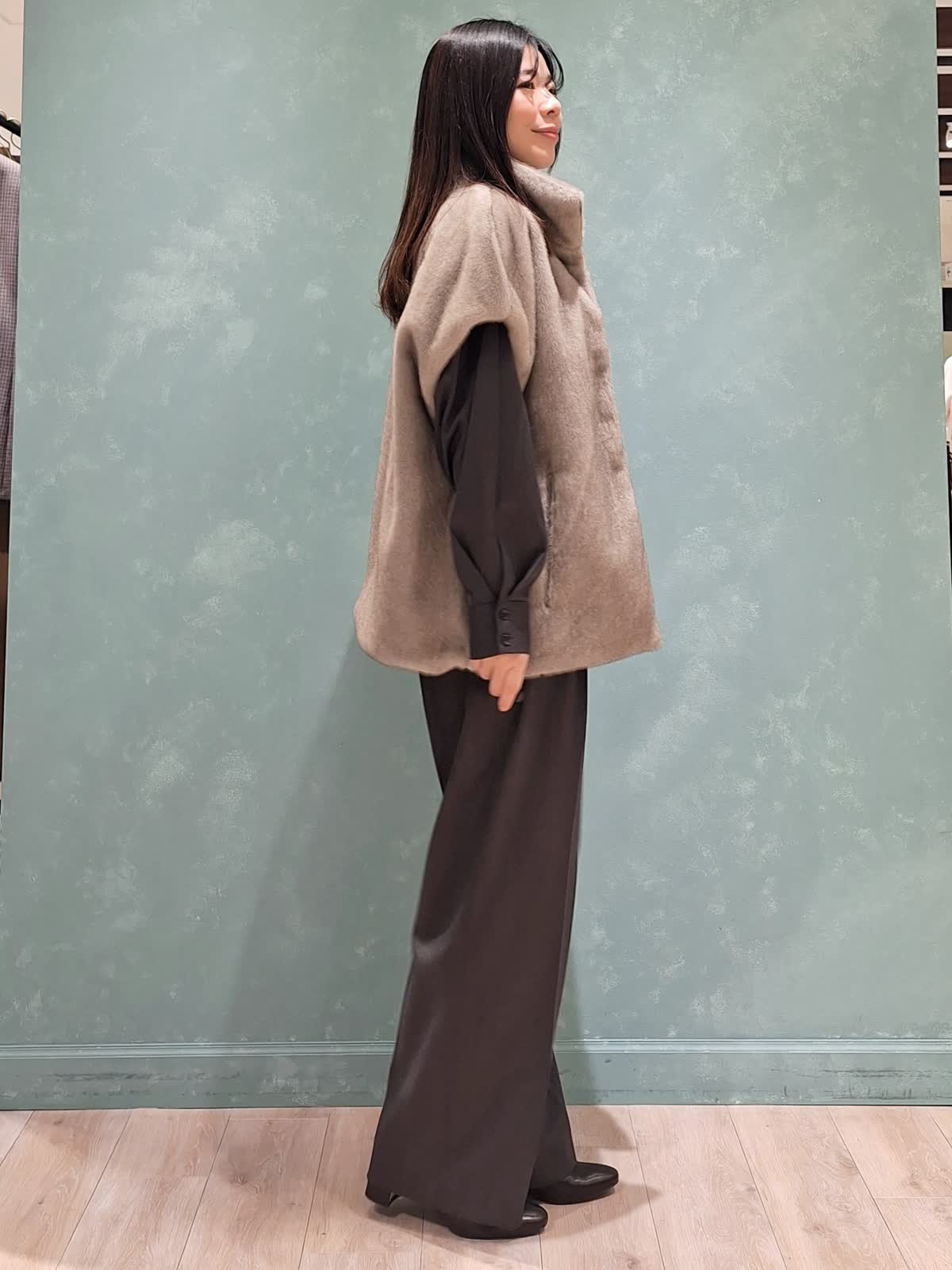 【着用サイズ、カラー】ジレ:9号、グレーベージュ ブラウス:9号、チャコールグレー パンツ:7号、チャコールグレー 格好いいパンツスタイルのセットアップに、エコファージレを合わせてオシャレ度UP!エコファージレは腰回りが隠れる安心の着丈で、裾を絞って表情を変えれます。肌触りが抜群で柔らかいので着心地◎コーディネートのアクセントにお勧めのアイテムです!インナーのセットアップは、サテン調の光沢のある生地で品あり。ブラウス、パンツどちらもゆったり着れる楽チンタイプです!