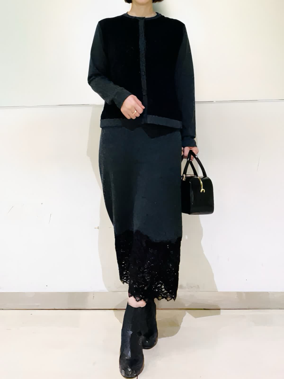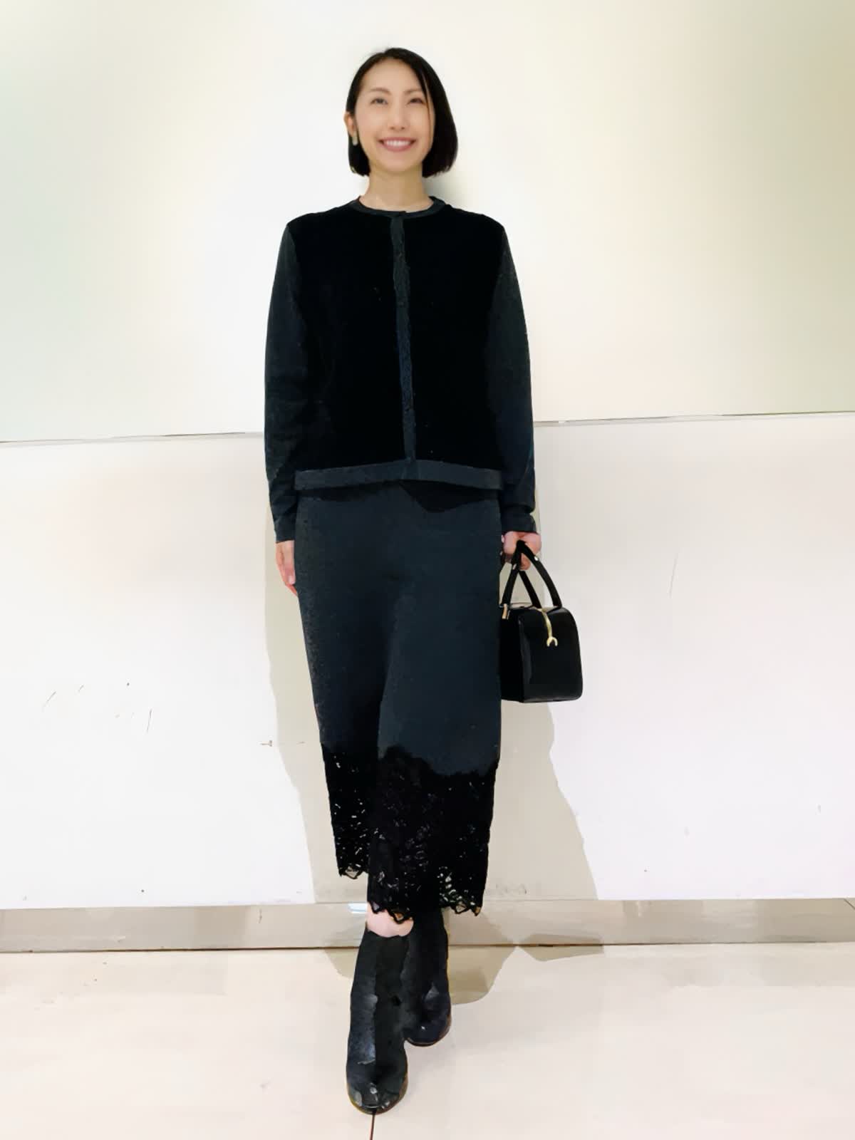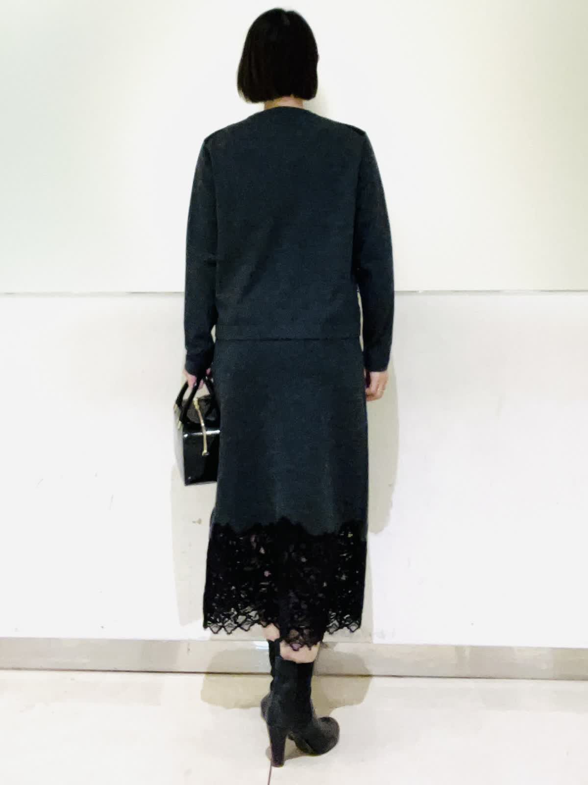 【着用アイテム/カラー】すべて9号/チャコールグレー レースがドッキングされた華やかツーピース。見頃とスカートの裾にのレースが華やかで、忘年会や女子会などちょっとおしゃれしていきたい時におすすめ。きれい目な雰囲気ですが、ニットなのでストレスフリーな着心地。ホームパーティーにもおすすめです。