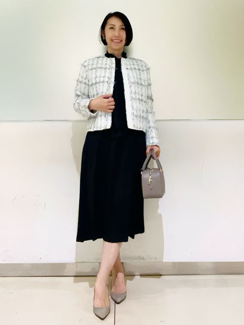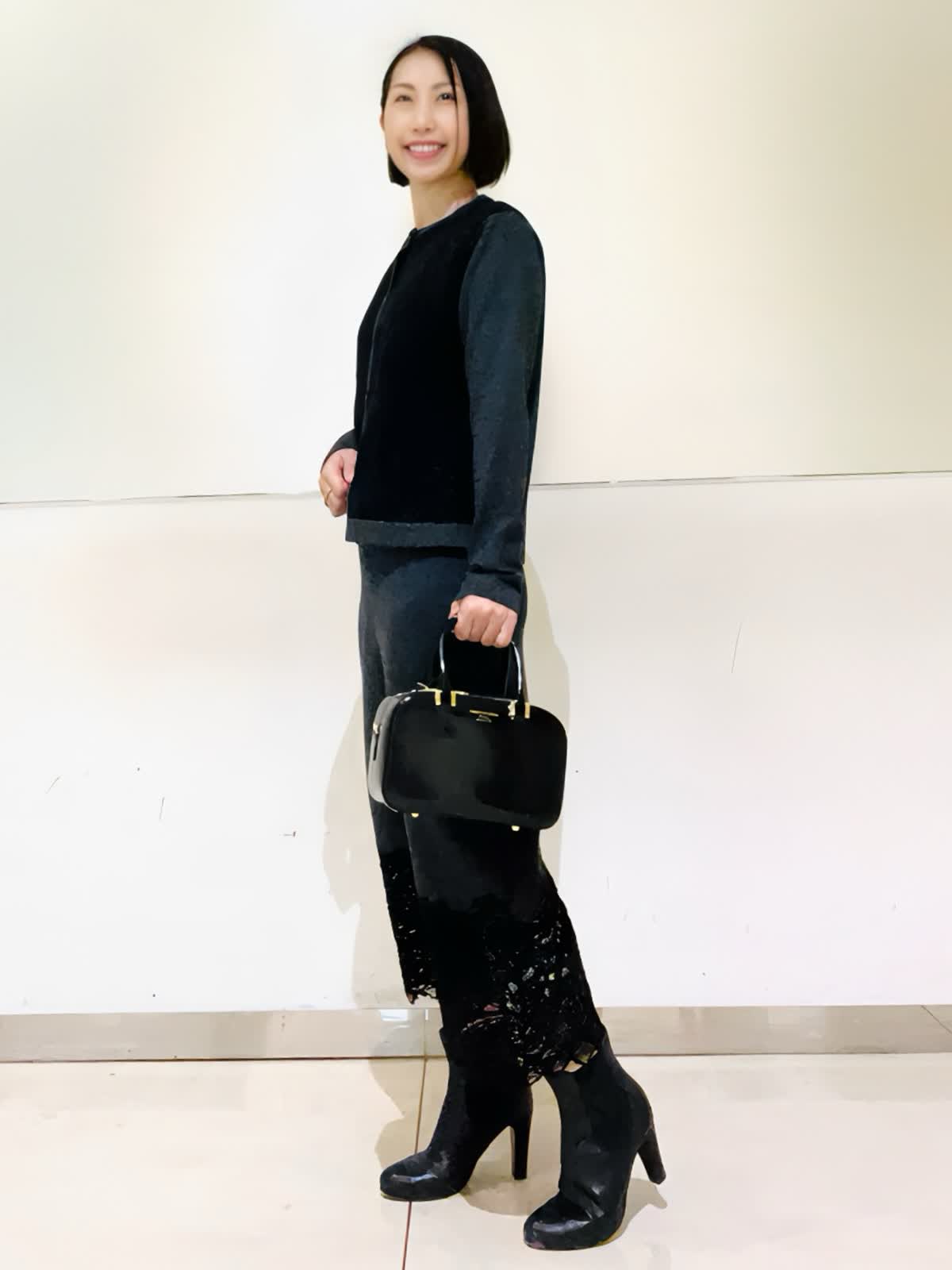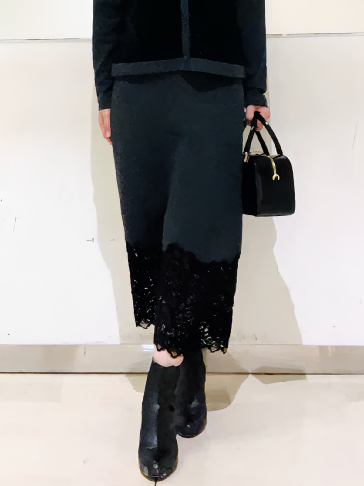 【着用アイテム/カラー】すべて9号/チャコールグレー レースがドッキングされた華やかツーピース。見頃とスカートの裾にのレースが華やかで、忘年会や女子会などちょっとおしゃれしていきたい時におすすめ。きれい目な雰囲気ですが、ニットなのでストレスフリーな着心地。ホームパーティーにもおすすめです。