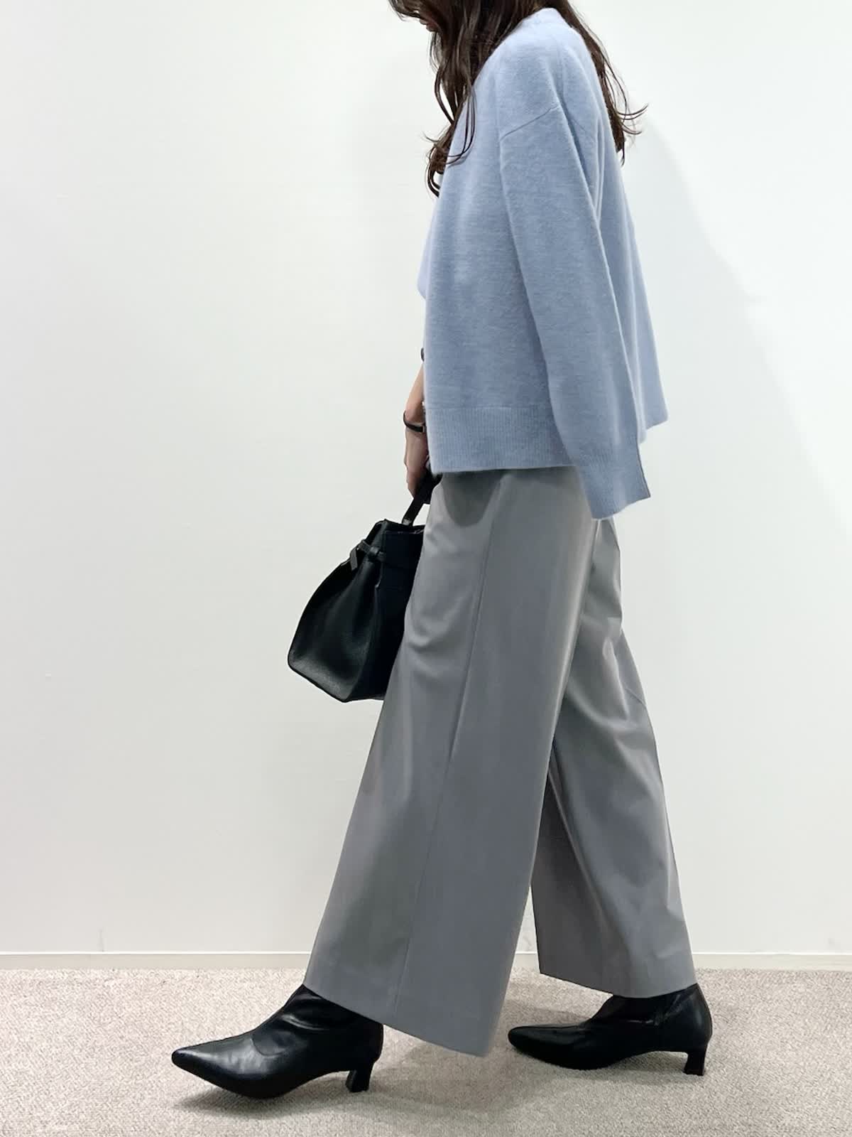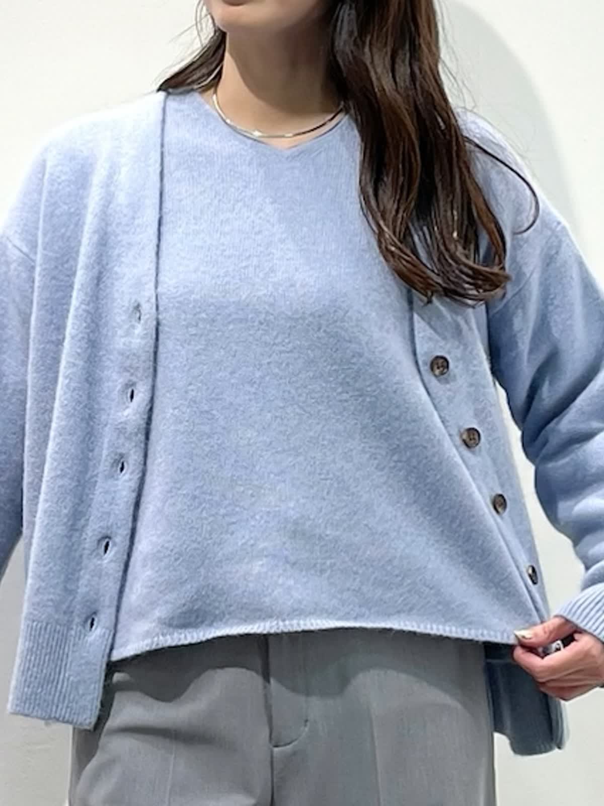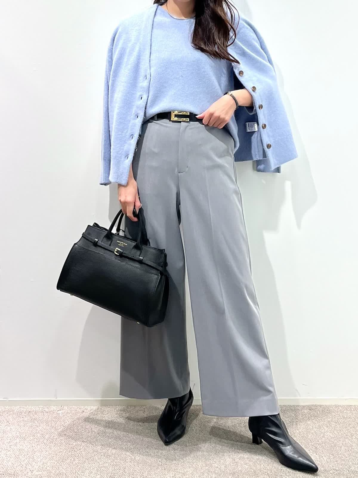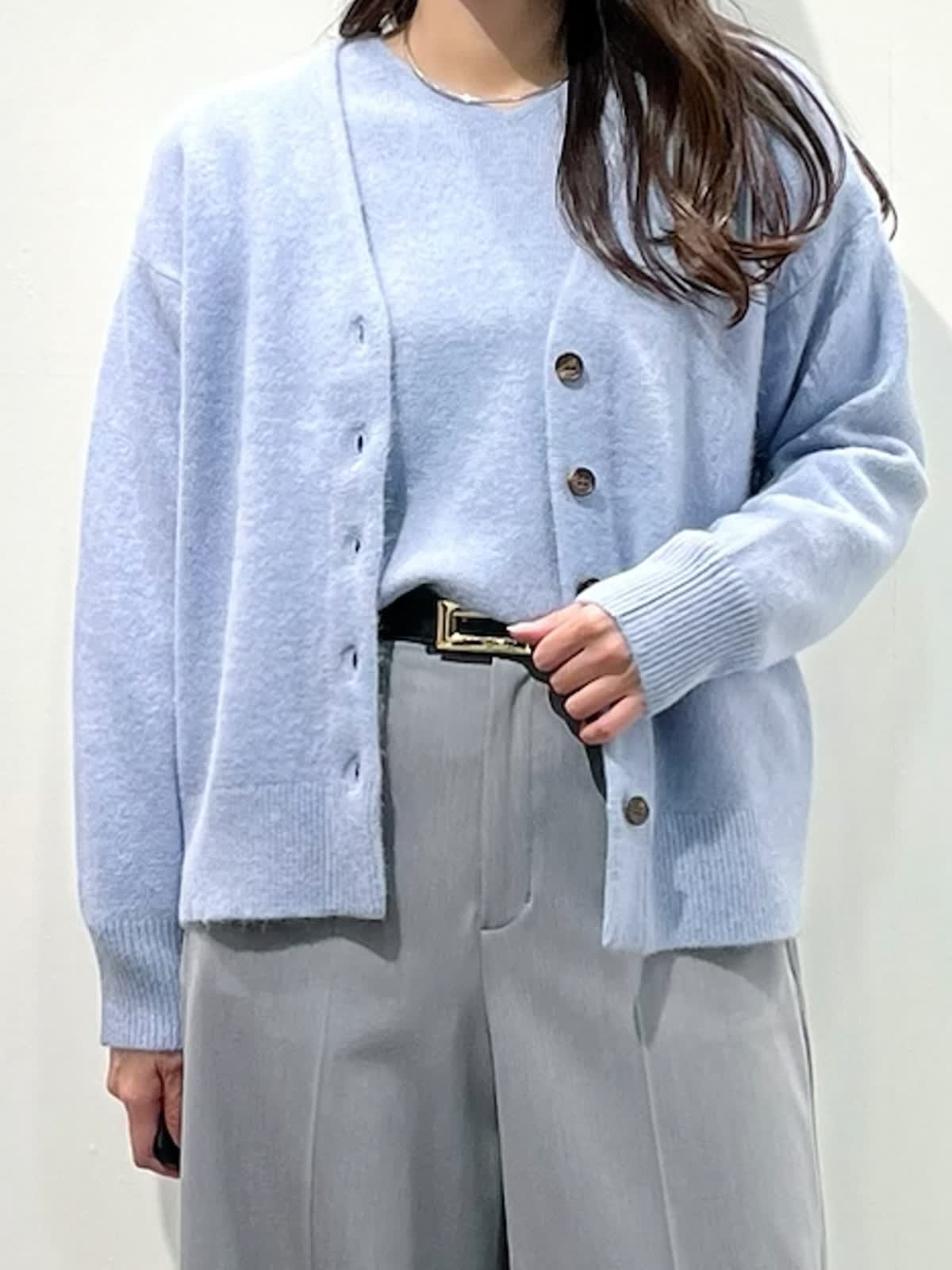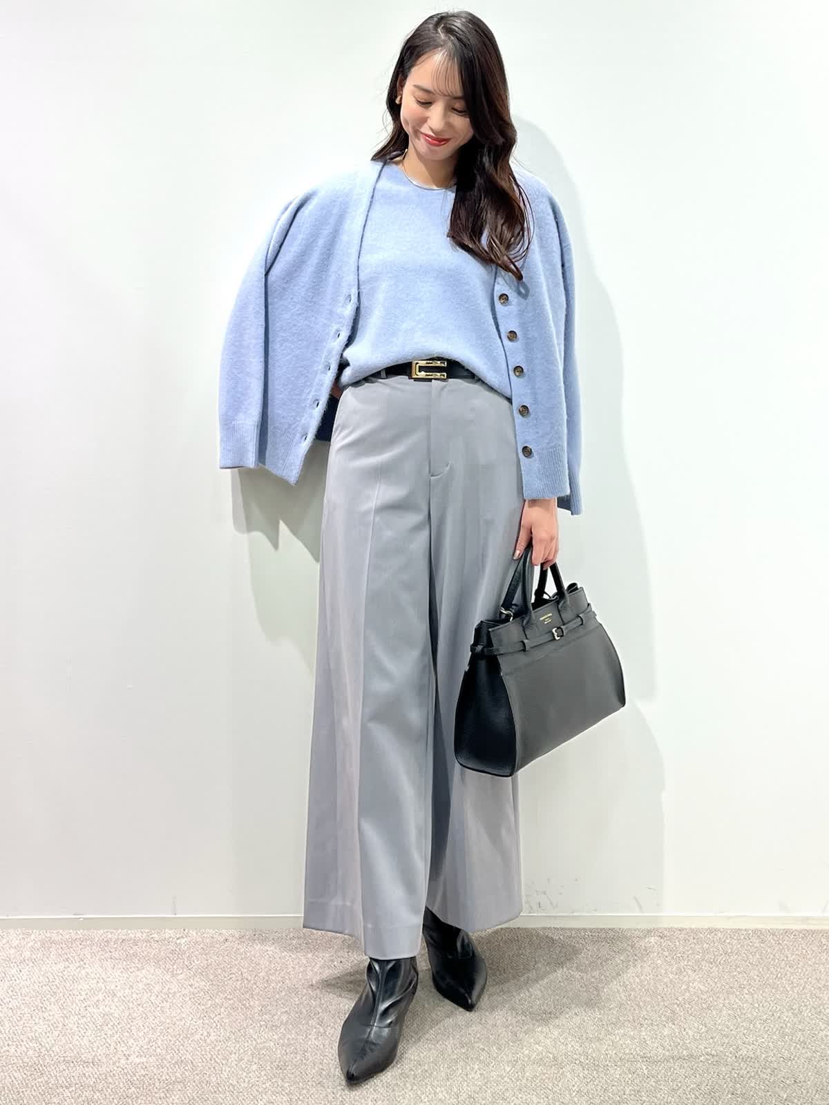 【着用サイズ】カーディガン:9号 ニット:9号 パンツ:11号 【着用カラー】カーディガン:サックス ニット:サックス パンツ:ミディアムグレー バッグ:ブラック 「淡色トーンで魅せるラクーンニットの上品コーデ」 淡いブルー×グレーの配色トーンで柔らかく透明感のあるおすすめスタイル。ふわふわとした質感の上質ラクーンニットは、Vネックニットとカーディガンのアンサンブルがおすすめ。ソフトなタッチと、軽くてあたたかい素材感が、冬のコーデに抜け感を演出してくれるアイテム。パンツ合わせで大人な上品スタイルに。着回し抜群で、通勤やデイリーにも華やかに着こなせます。きれいめカラーで、上品なラグジュアリースタイルが完成。