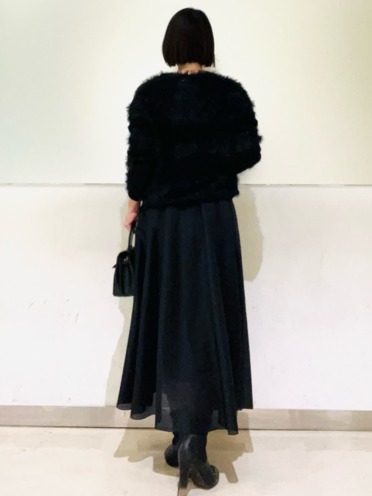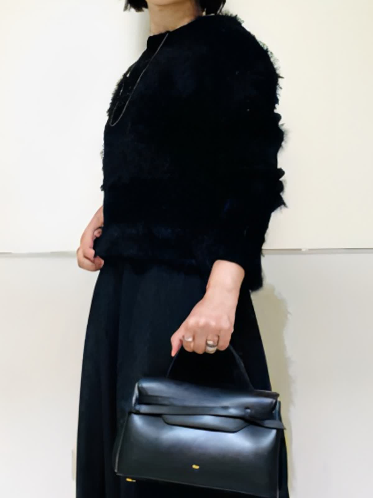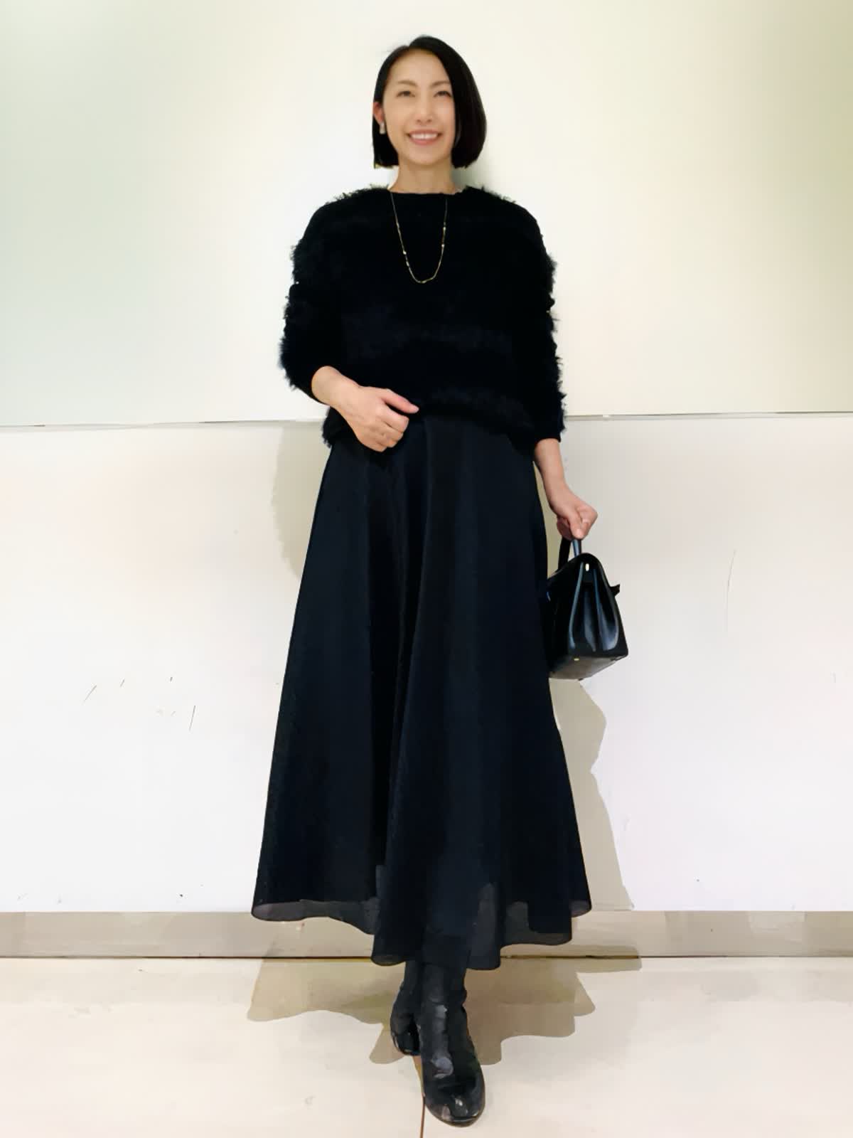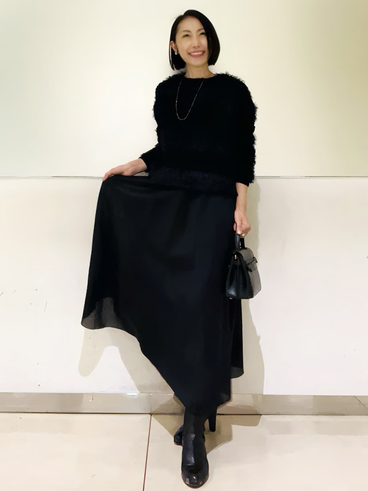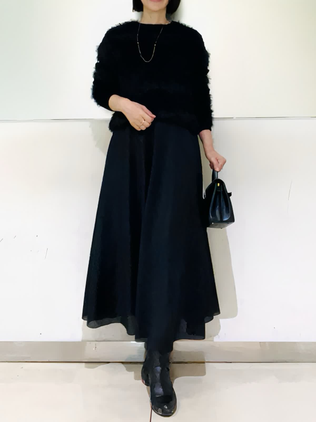 【着用アイテム/カラー】ニット、スカート:ブラック ブラックでまとめた大人の忘年会コーデ。ふわふわのフェザーニットにシアー感のあるスカートでシックだけれど華やかな組み合わせ。ニットは表情感があり、黒でものっぺりせず写真映えします。