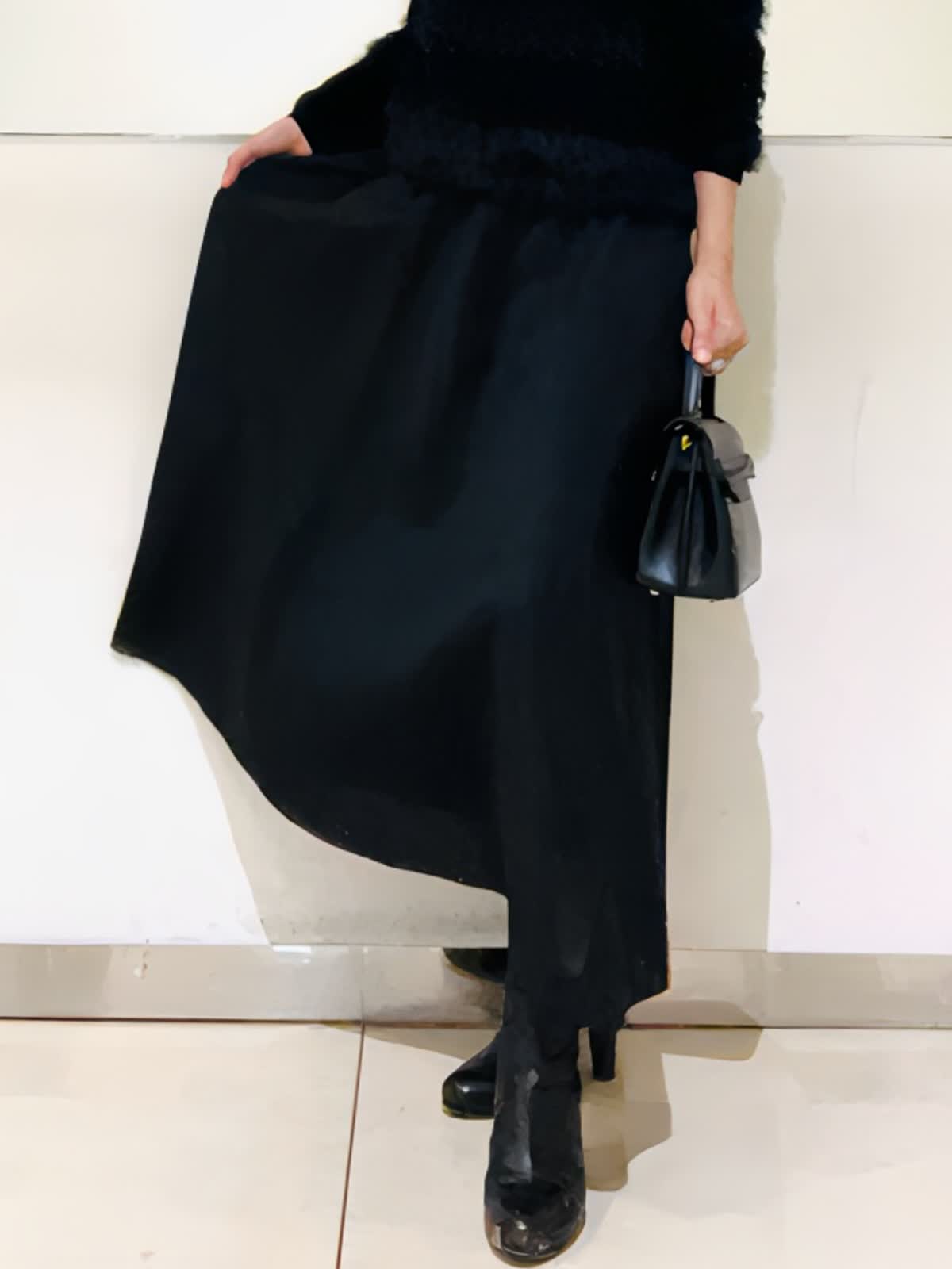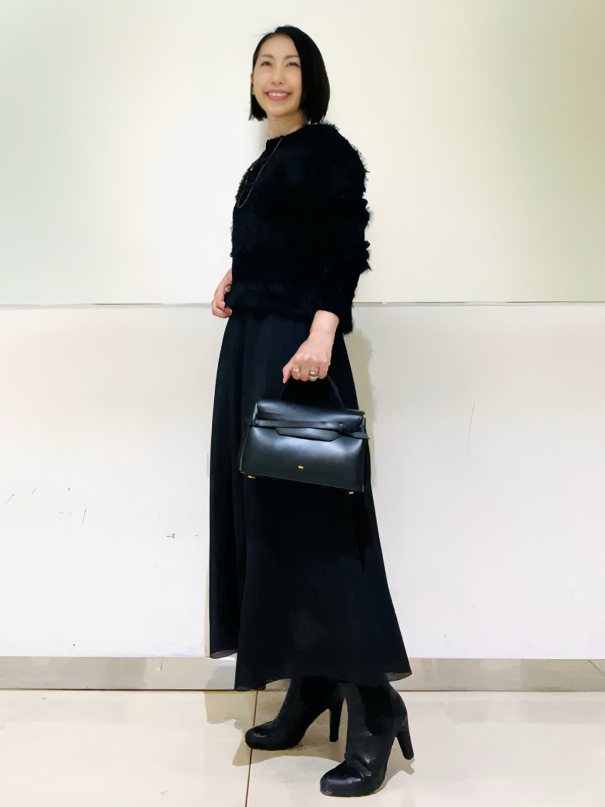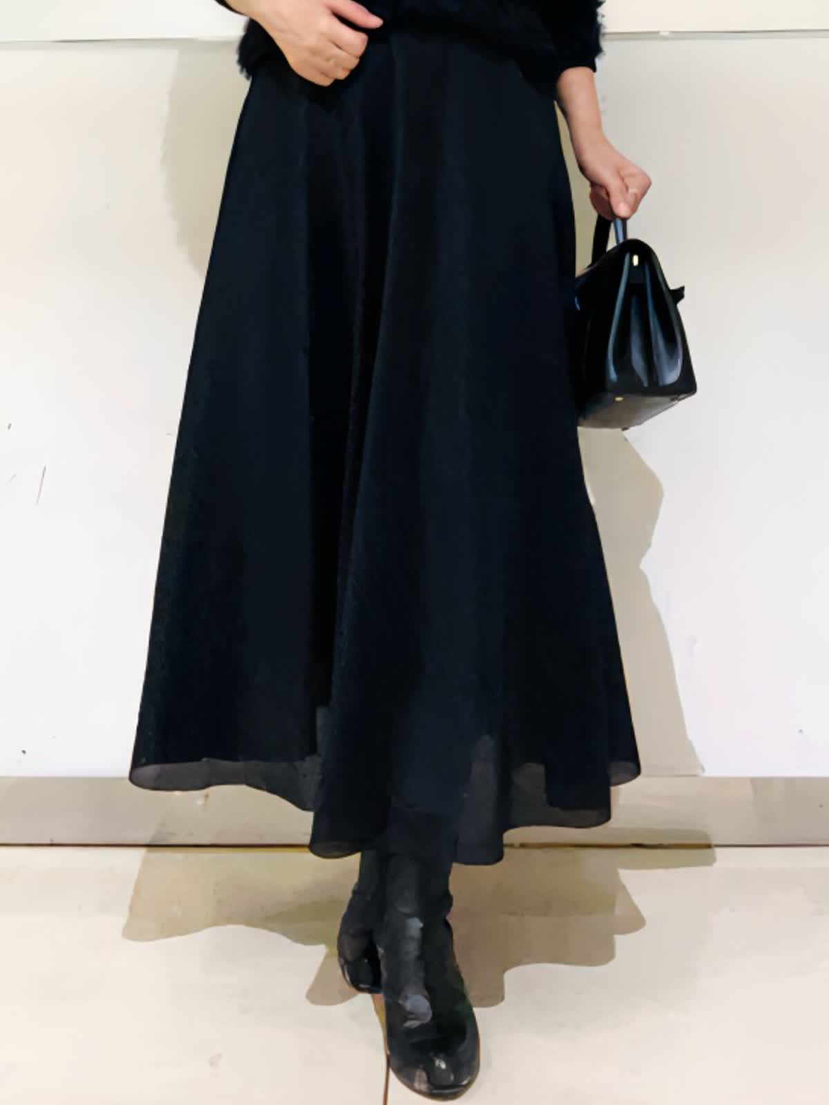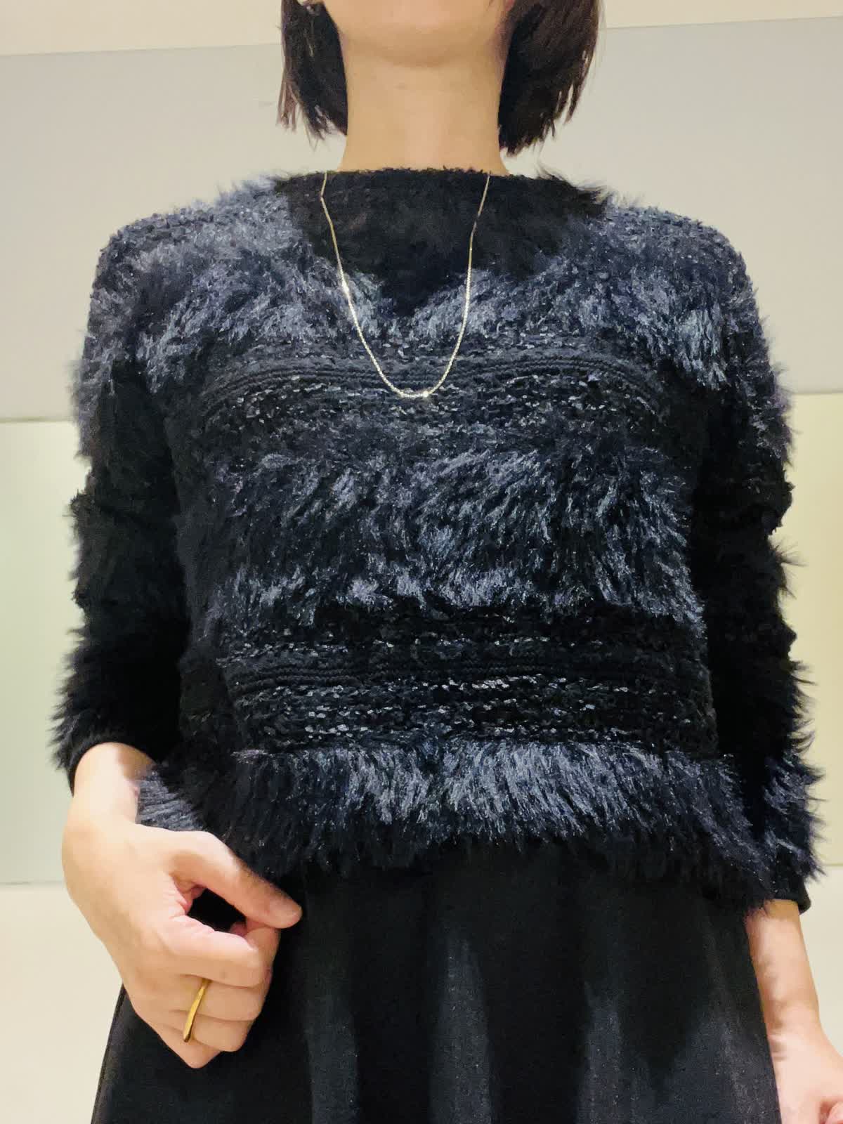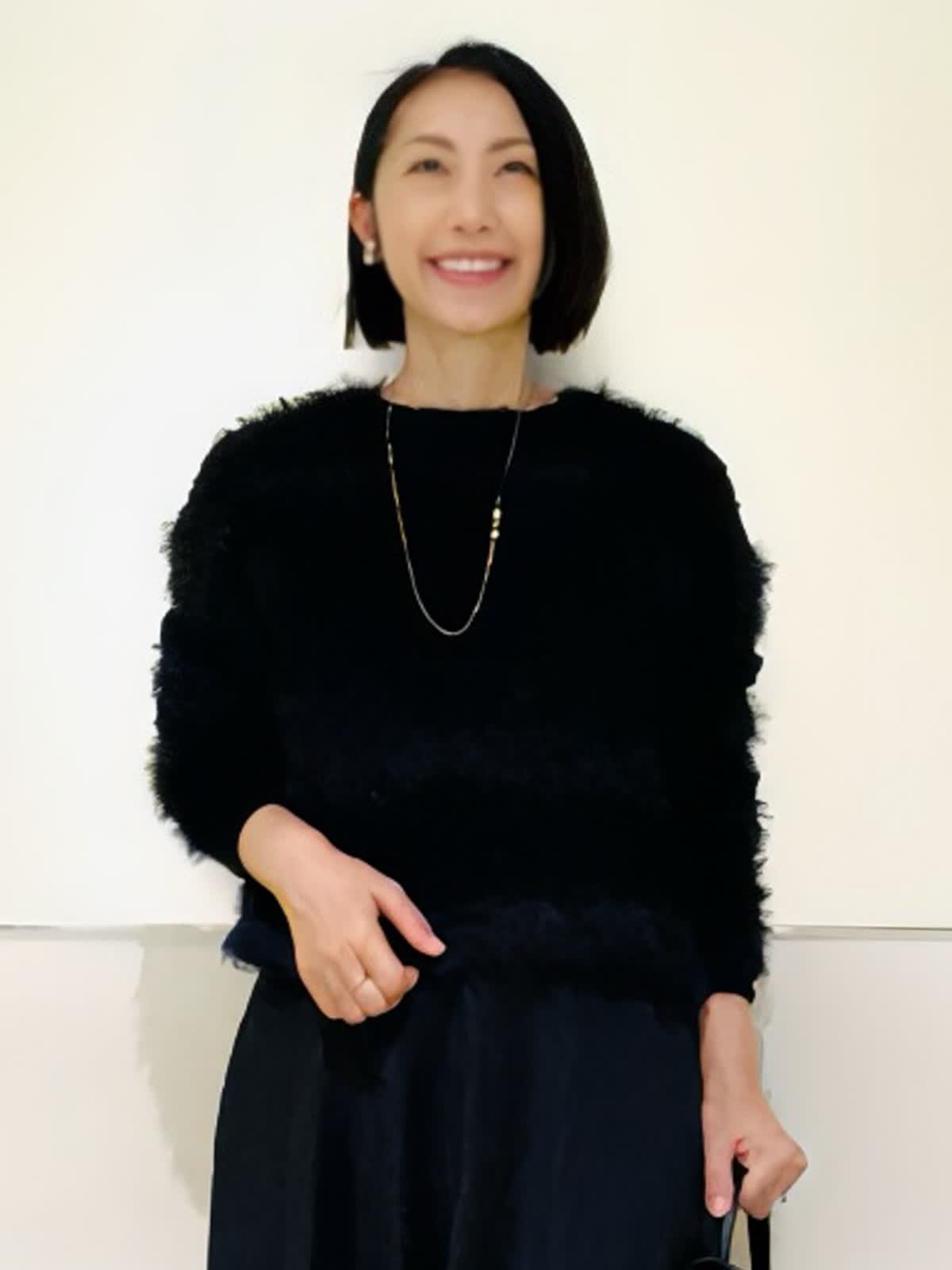 【着用アイテム/カラー】ニット、スカート:ブラック ブラックでまとめた大人の忘年会コーデ。ふわふわのフェザーニットにシアー感のあるスカートでシックだけれど華やかな組み合わせ。ニットは表情感があり、黒でものっぺりせず写真映えします。