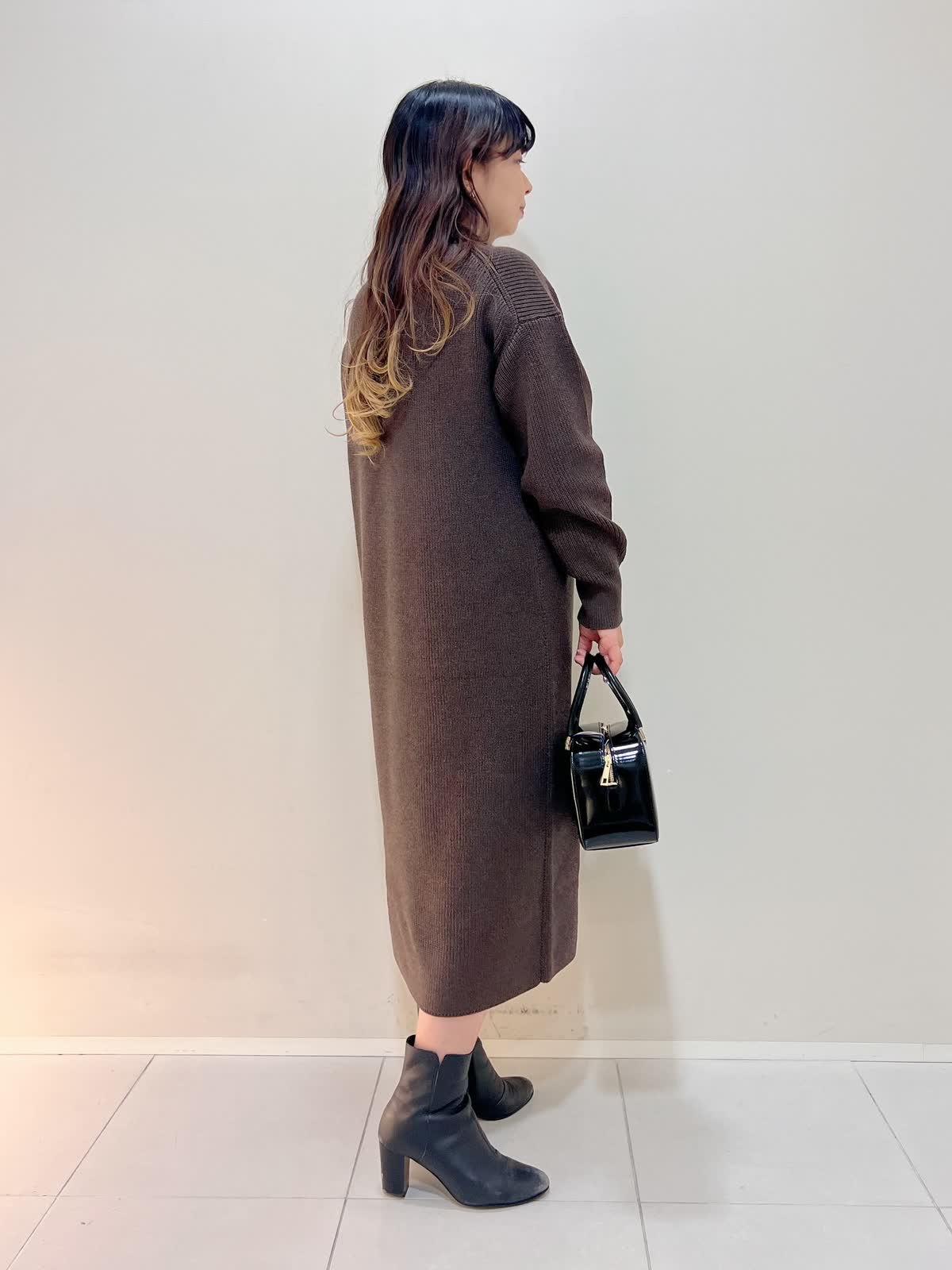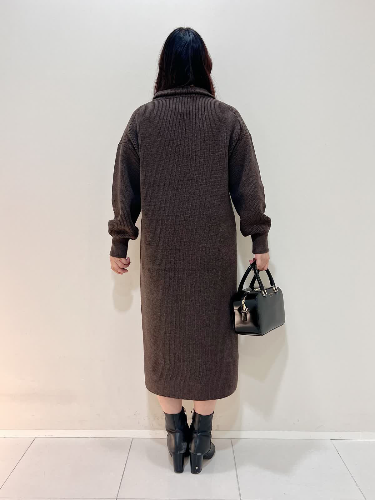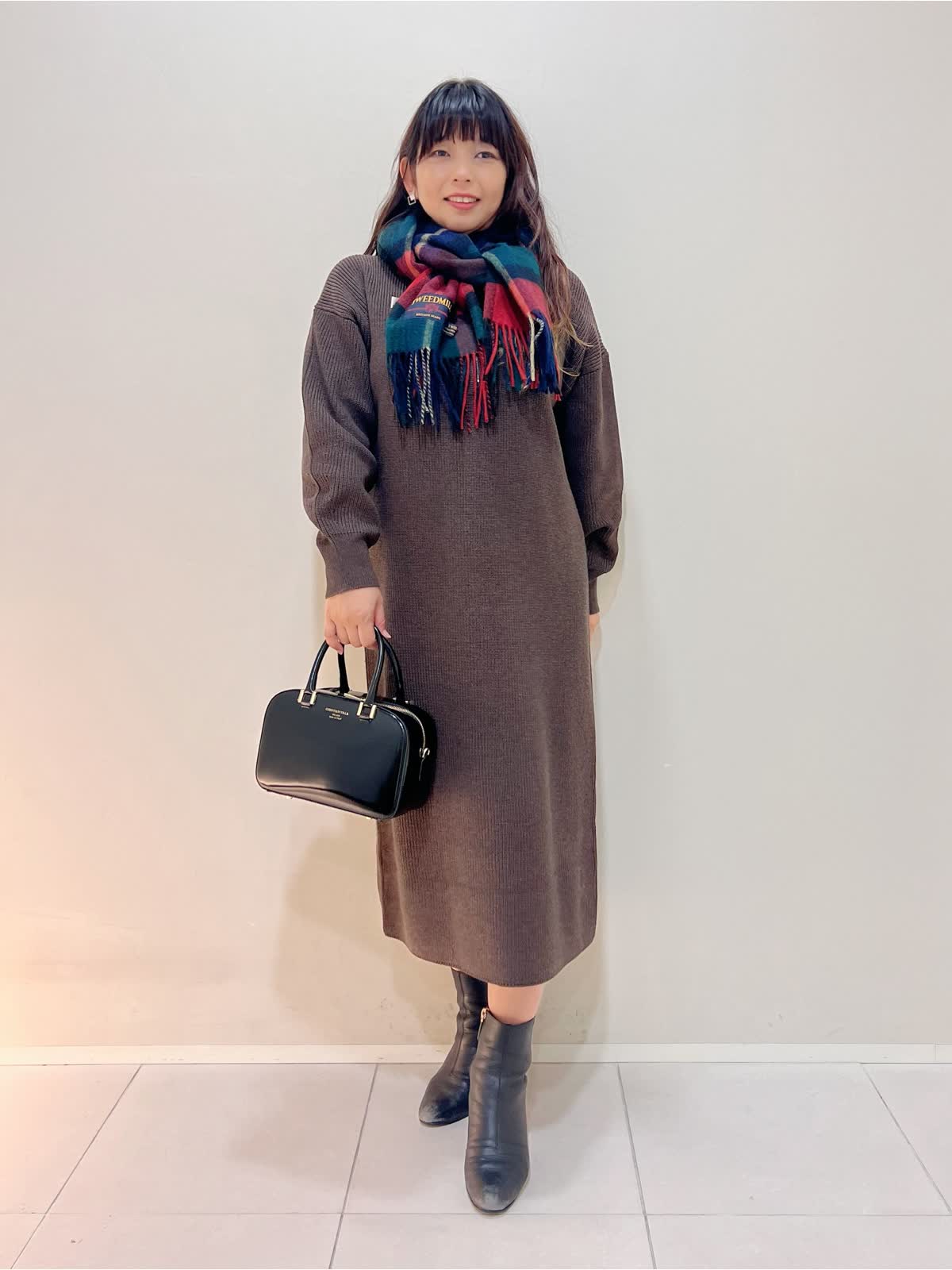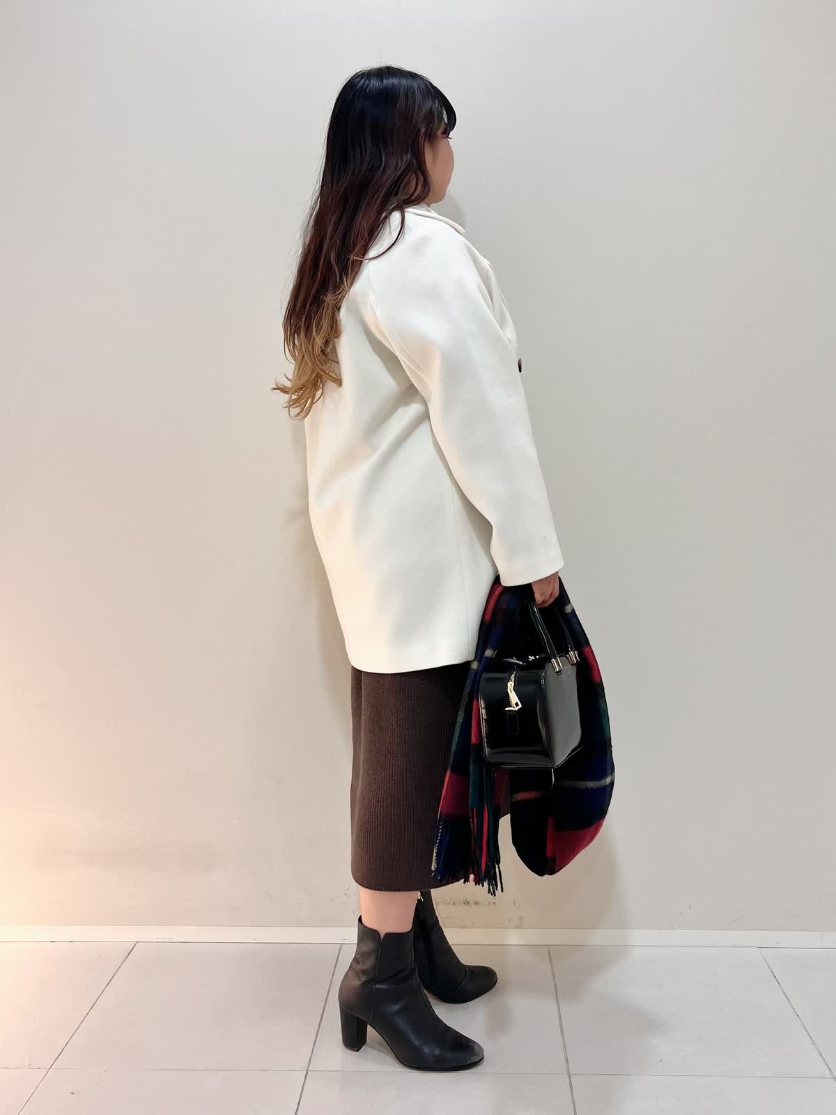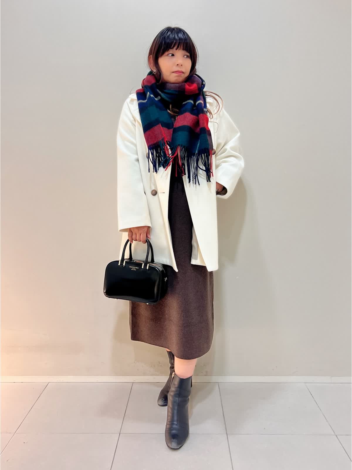 【着用サイズ】コート:フリー ワンピース:フリー 【着用カラー】コート:オフホワイト ワンピース:ブラウン マフラー:レッド バッグ:ブラック 冬のお出掛けコーディネート。 軽い着心地のスペリオルメルトンPコート。高めのポケットでスタイルアップ効果と、アームまわりが広く重ね着もしやすいアウターです。 襟を立ててボタンを留めるとスタンドカラーにもなります。 ハーフジップで着やすいニットワンピースに、カラーのマフラーを合わせて、クリスマスのお出掛けにもお勧めのコーディネートです。