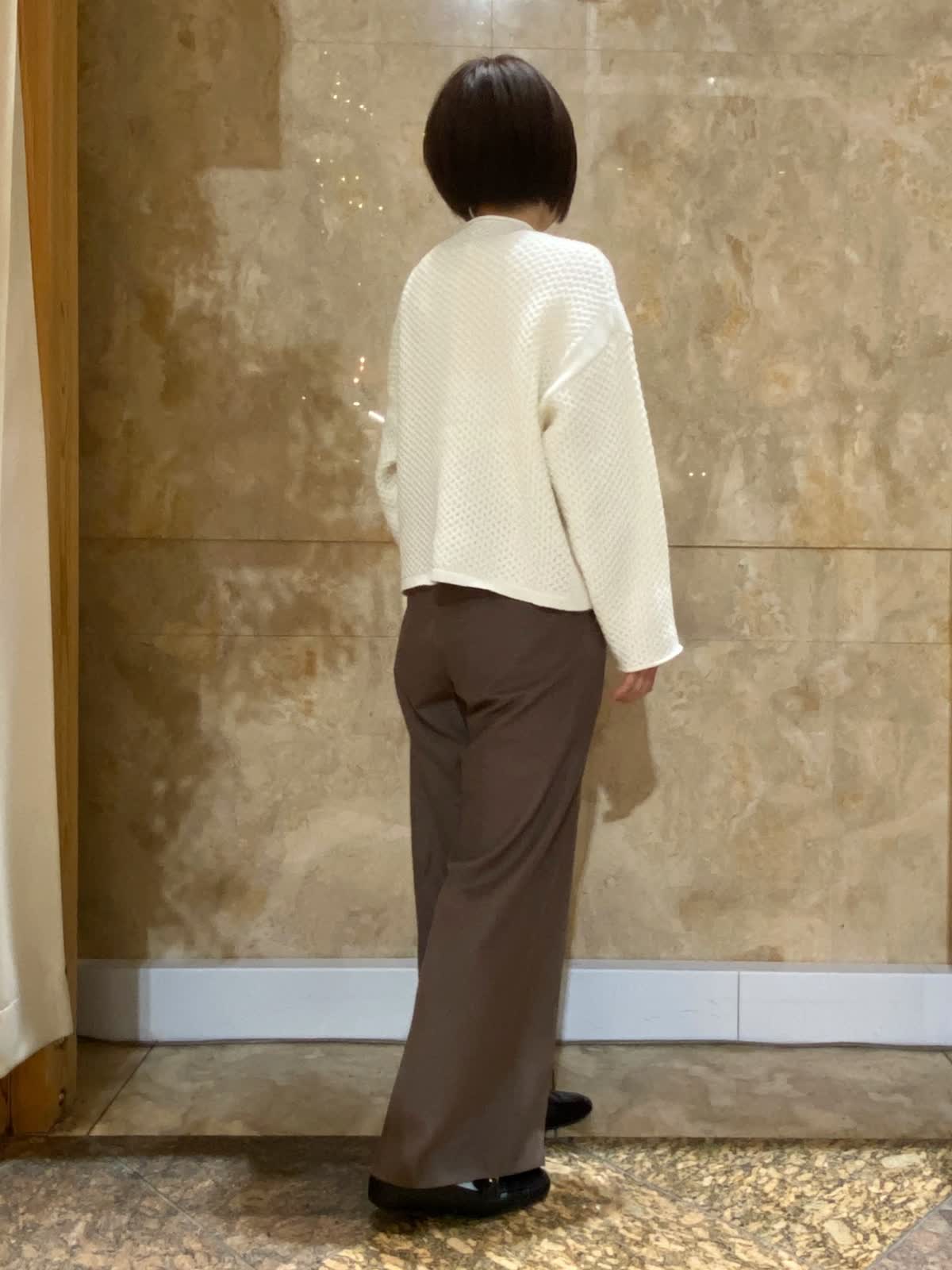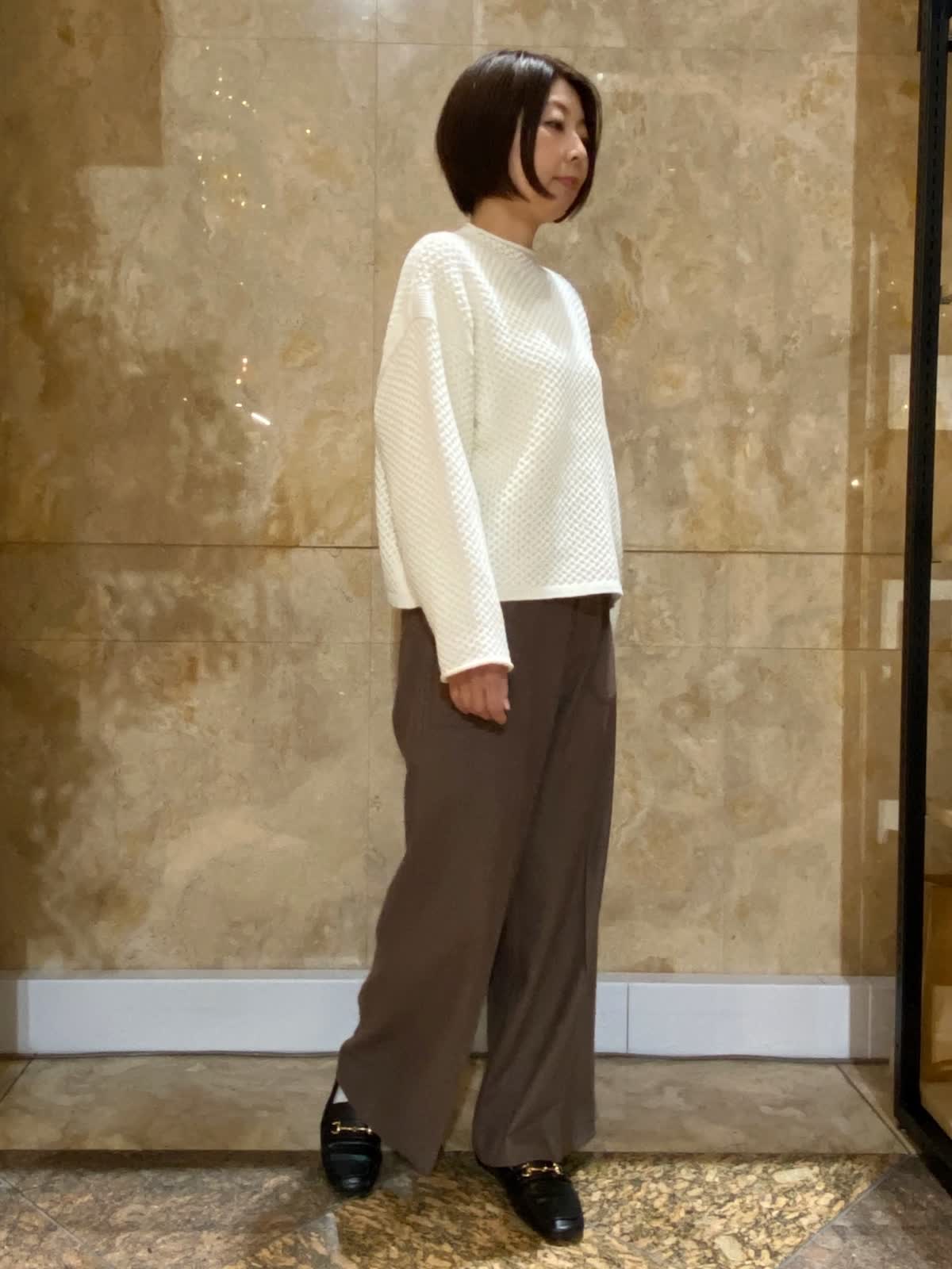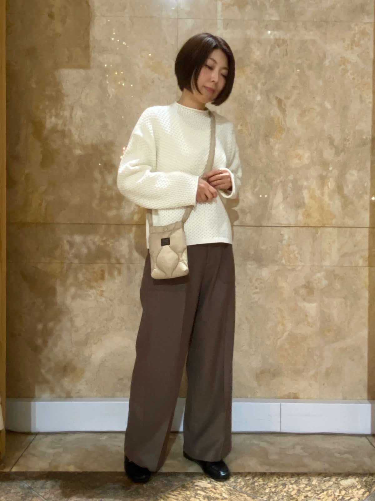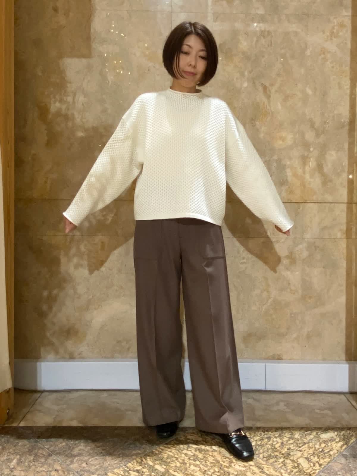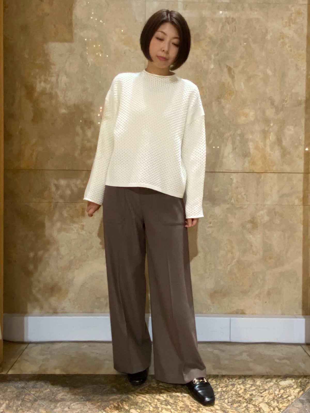 【着用サイズ/カラー】 ニット:フリーサイズ/オフホワイト パンツ : 9号 /ブラウン ブラウス : フリーサイズ/ベージュ ハニカム柄がかわいいニットは、もちもちな生地で肌触り抜群。長くも短くもないちょうどいい丈感で、スカートにもパンツにも合わせやすいです。パンツはストレッチが効いていて柔らかく、ウール混でしっかり暖かいです。女性らしい、少し淡めの柔らかい色合い。