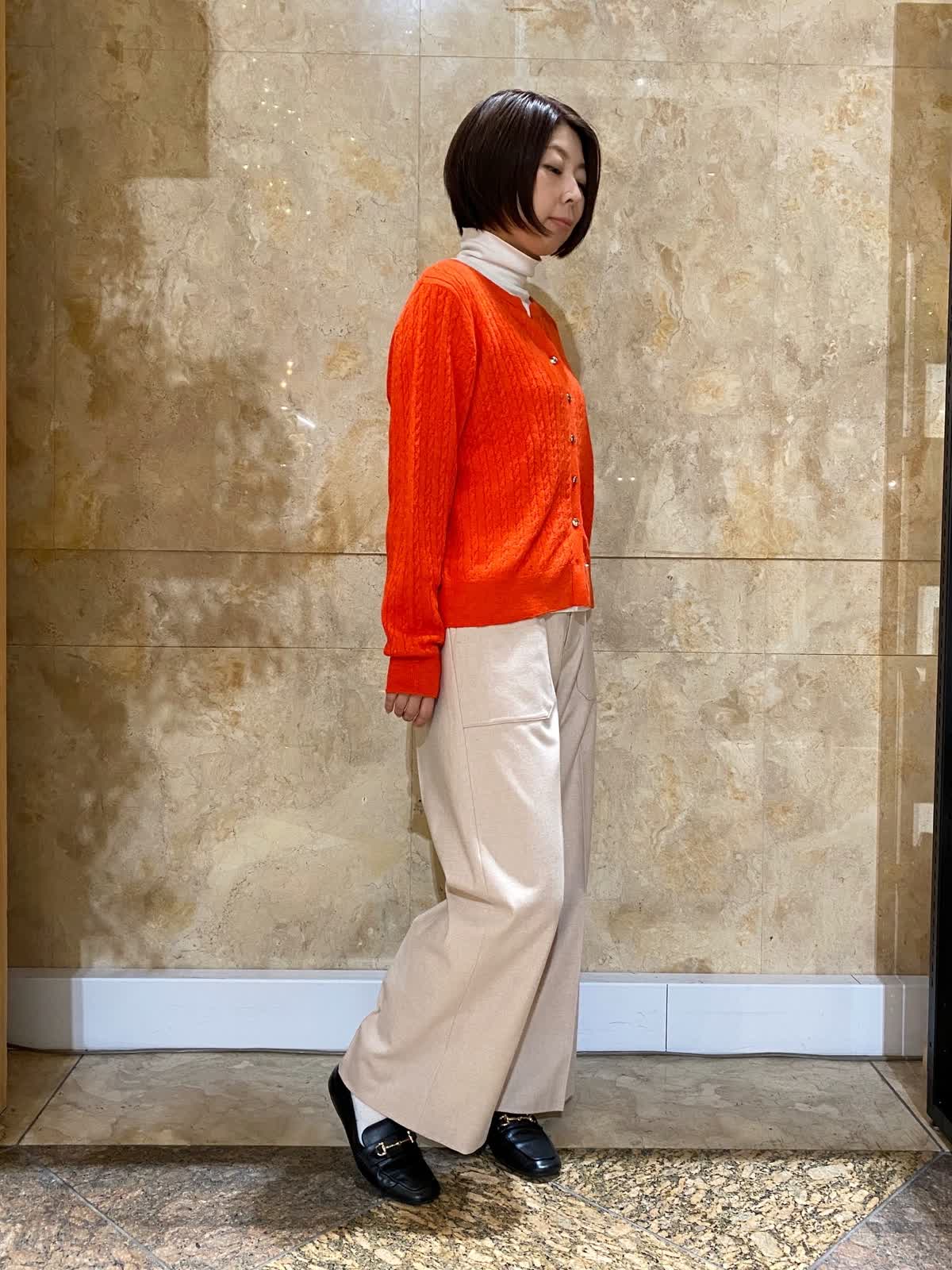 【着用サイズ/カラー】 カーディガン:フリーサイズ/シュイロ カットソー : 9号/グレー パンツ : 9号/ベージュ 発色がキレイなアルパカカーディガン。シュイロはオレンジに近い色味。しっとりした柔らかさで最高の肌触りです。カットソーとベイカーワイドパンツでカジュアルに。