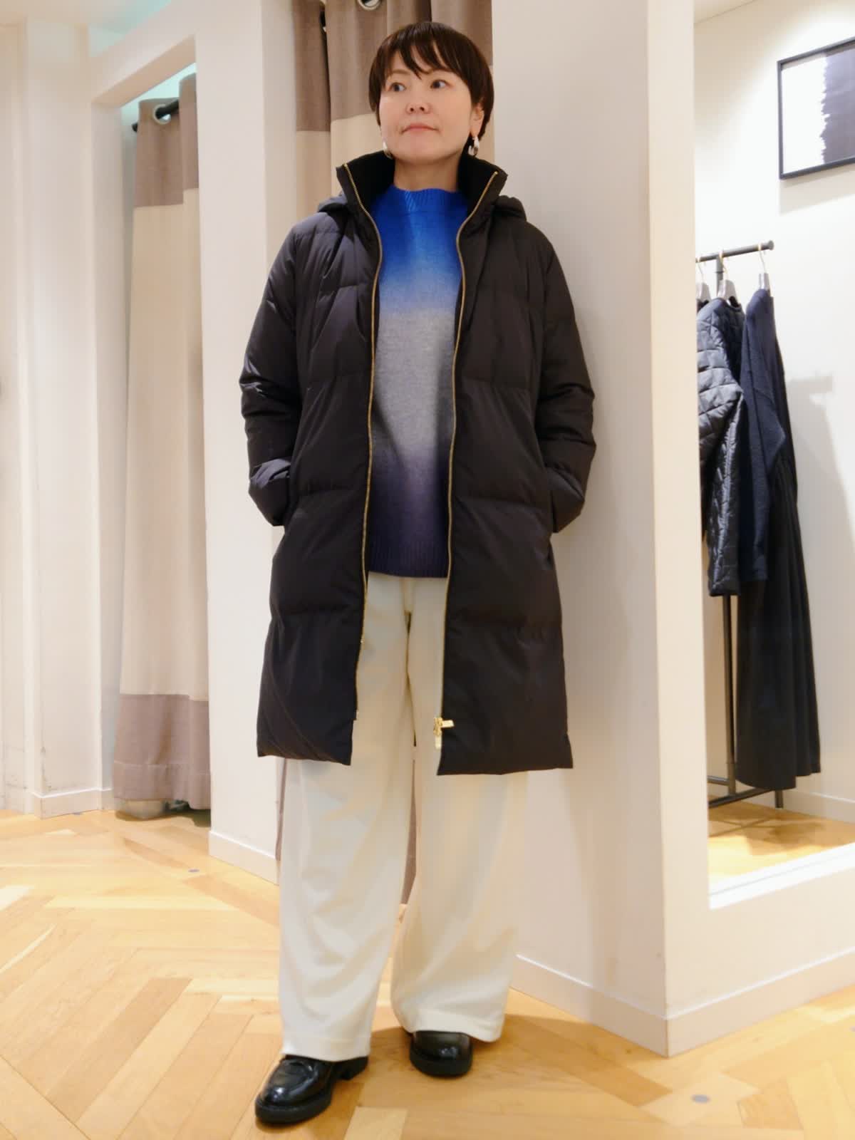 【着用サイズ】コート:9号 ニット:9号 パンツ:9号【着用カラー】コート:ブラック ニット:ブルー パンツ:アイボリー ダウンコートは首元のリブニットで首周りもあたたか。ボリュームが出すぎずスッキリと着られます。グラデーション柄が映えるウォーム感たっぷりなニットはゆったりした着心地で、ワイドパンツやデニムなどにおすすめ。パンツはウエストゴムで楽ちんな着心地ですがラインがきれいな大人カジュアルなパンツです。