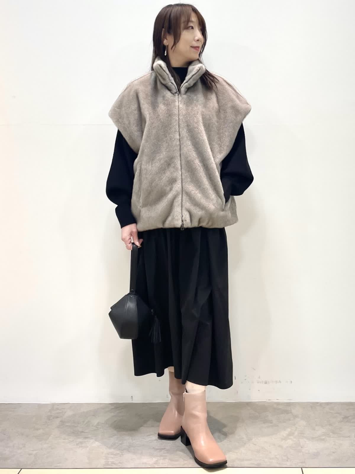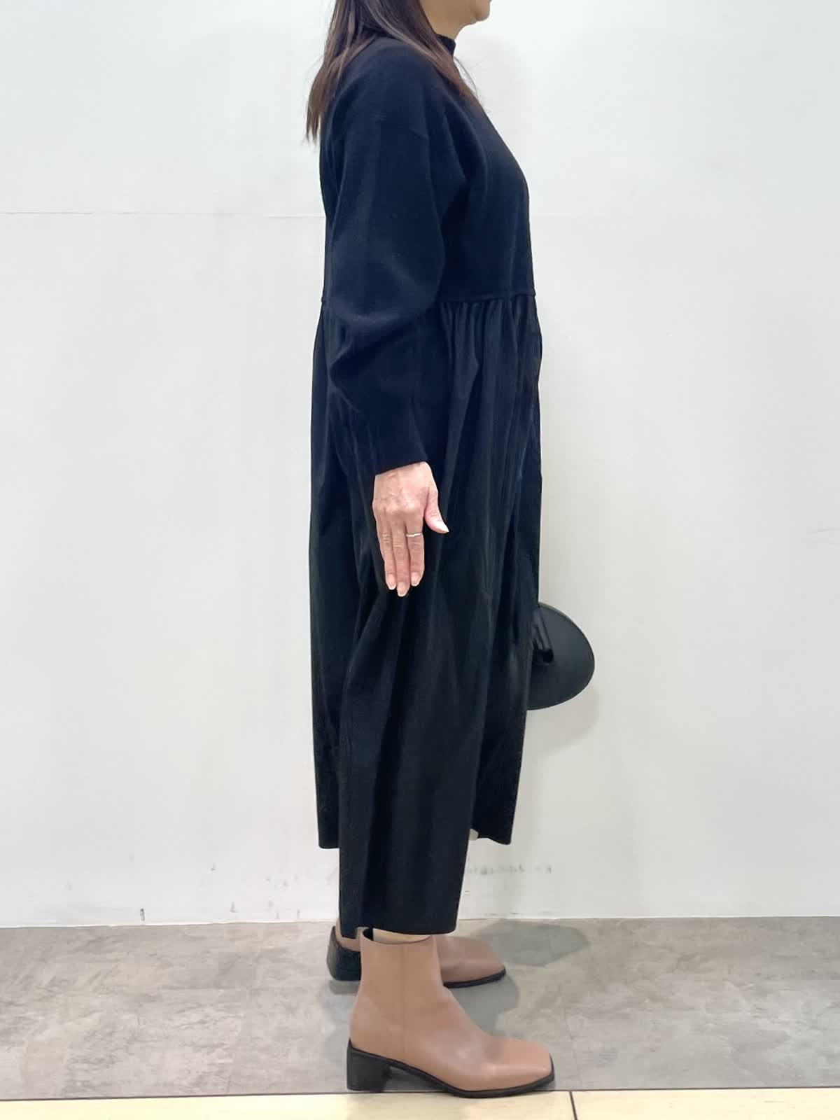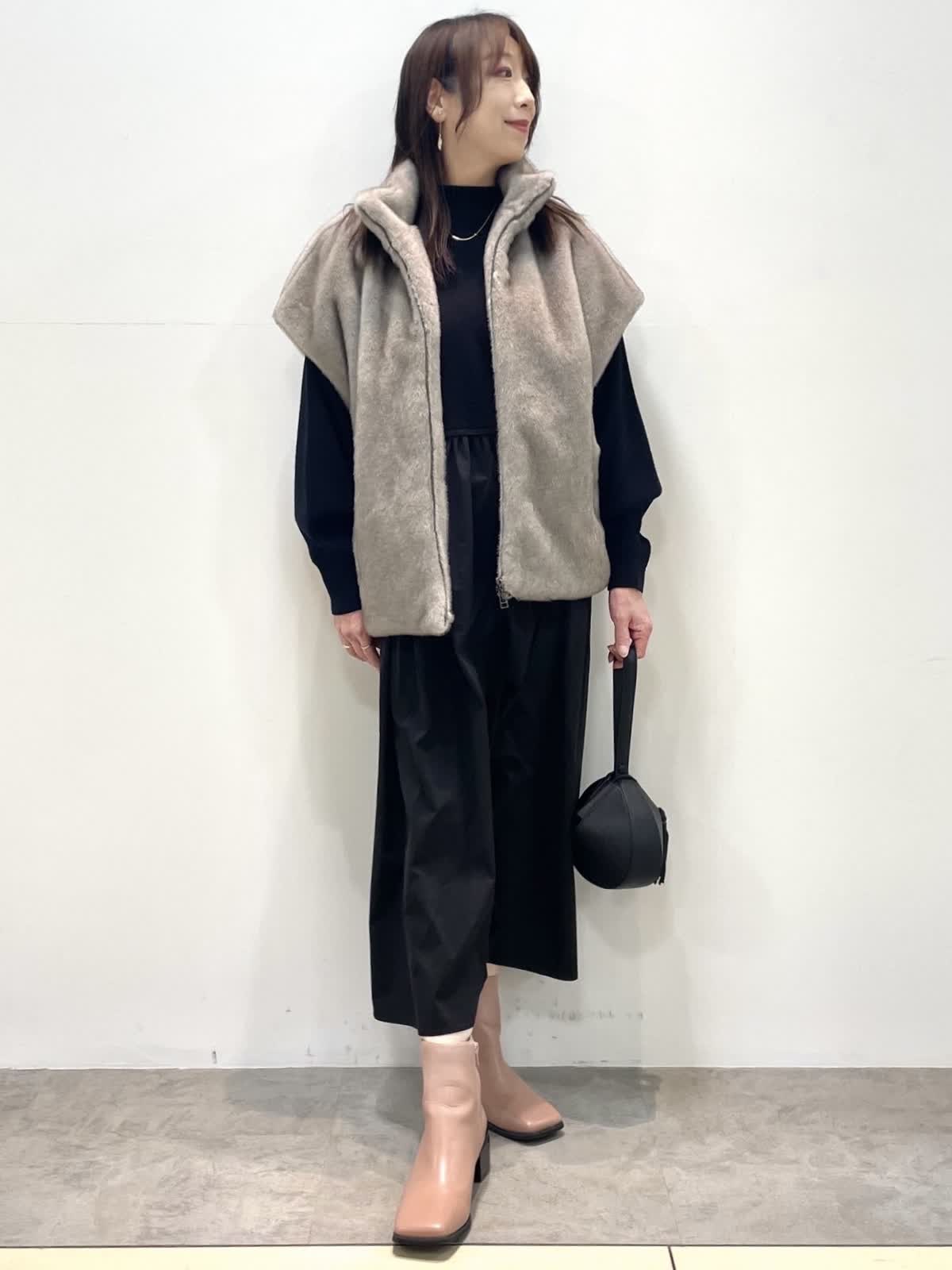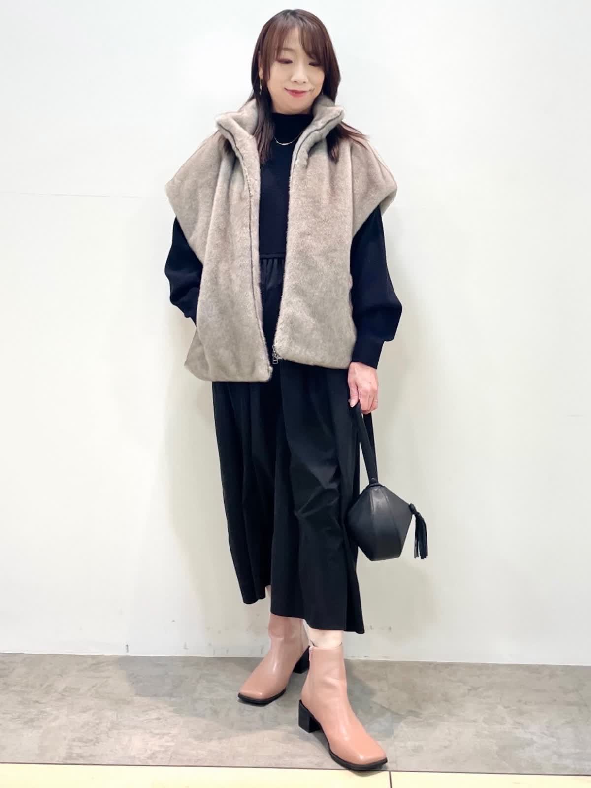 【着用サイズ】全て9号 【カラー】ファージレ:グレーベージュ ワンピース: ブラック 休日お出かけスタイル。ドッキングワンピースはニット部分の着丈が短めでスタイルアップして見えます。エコファージレは羽織るだけで今っぽく決まる優秀アイテム。軽くて暖かく肌触りも抜群。裾を絞ると丸いシルエットになり雰囲気を変えて着用いただけます。