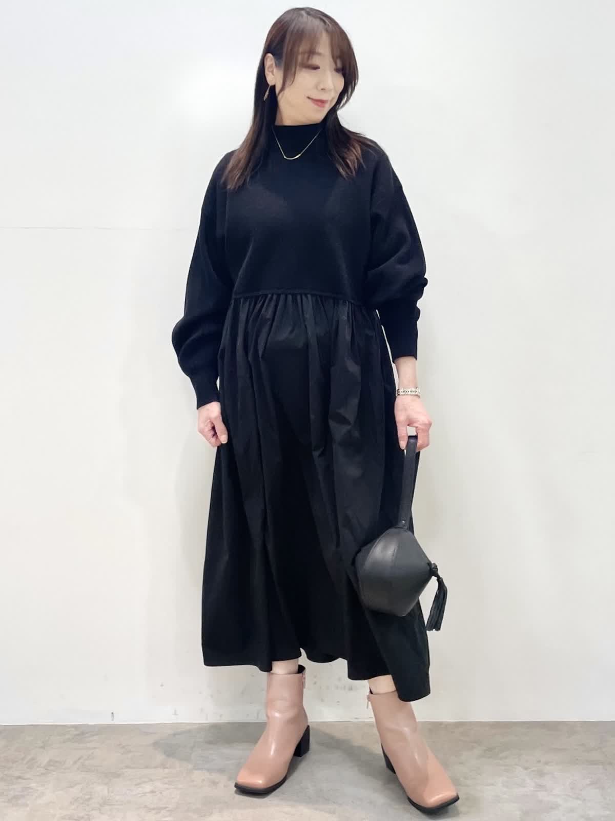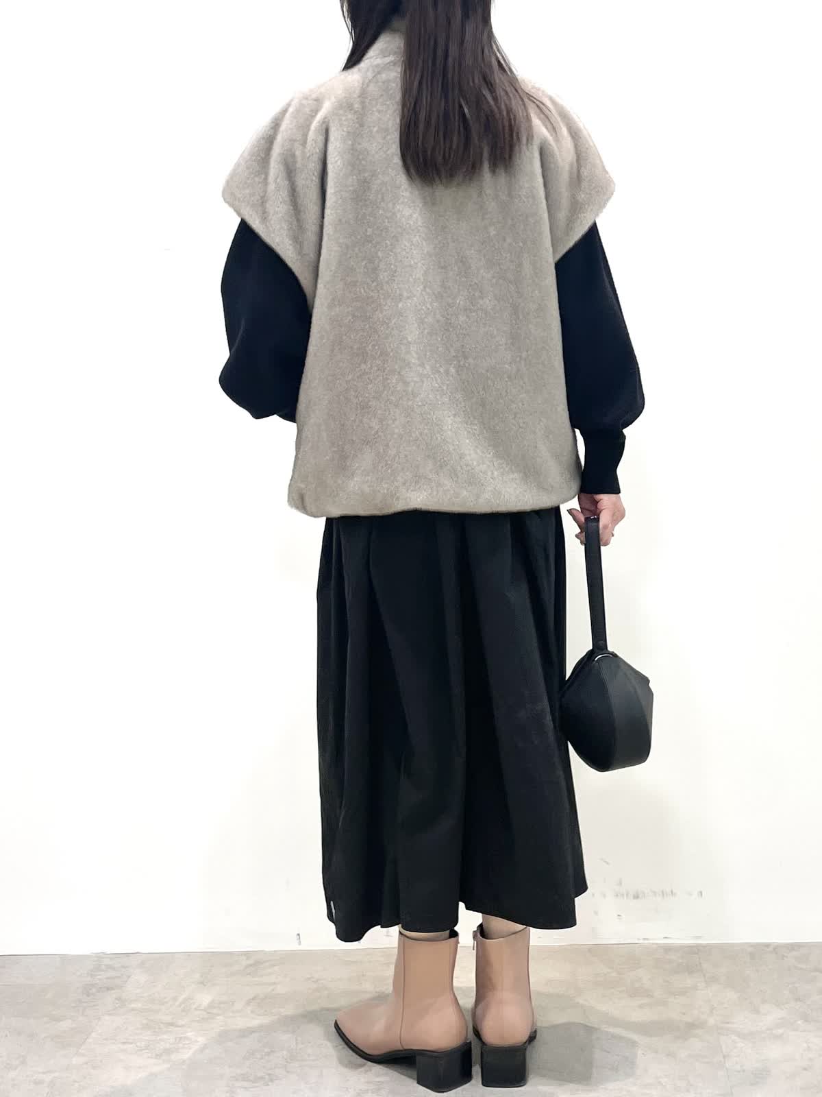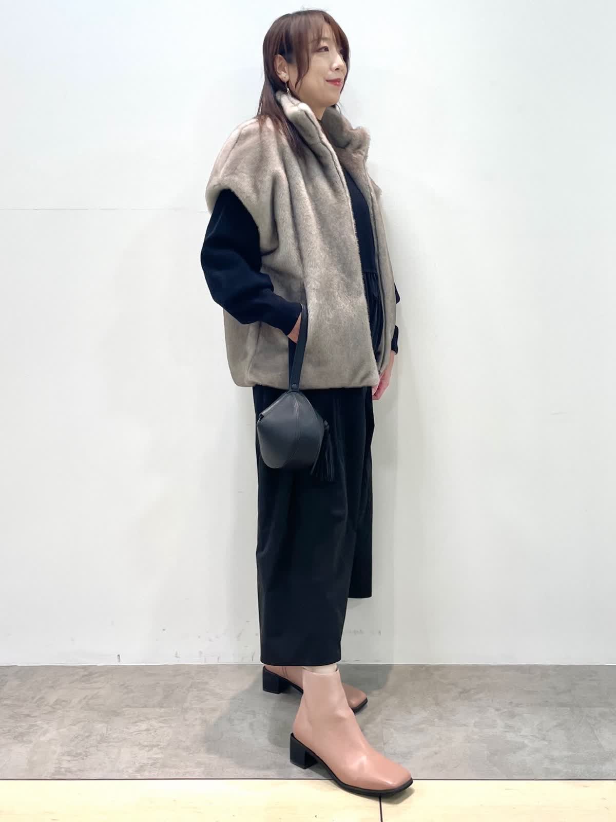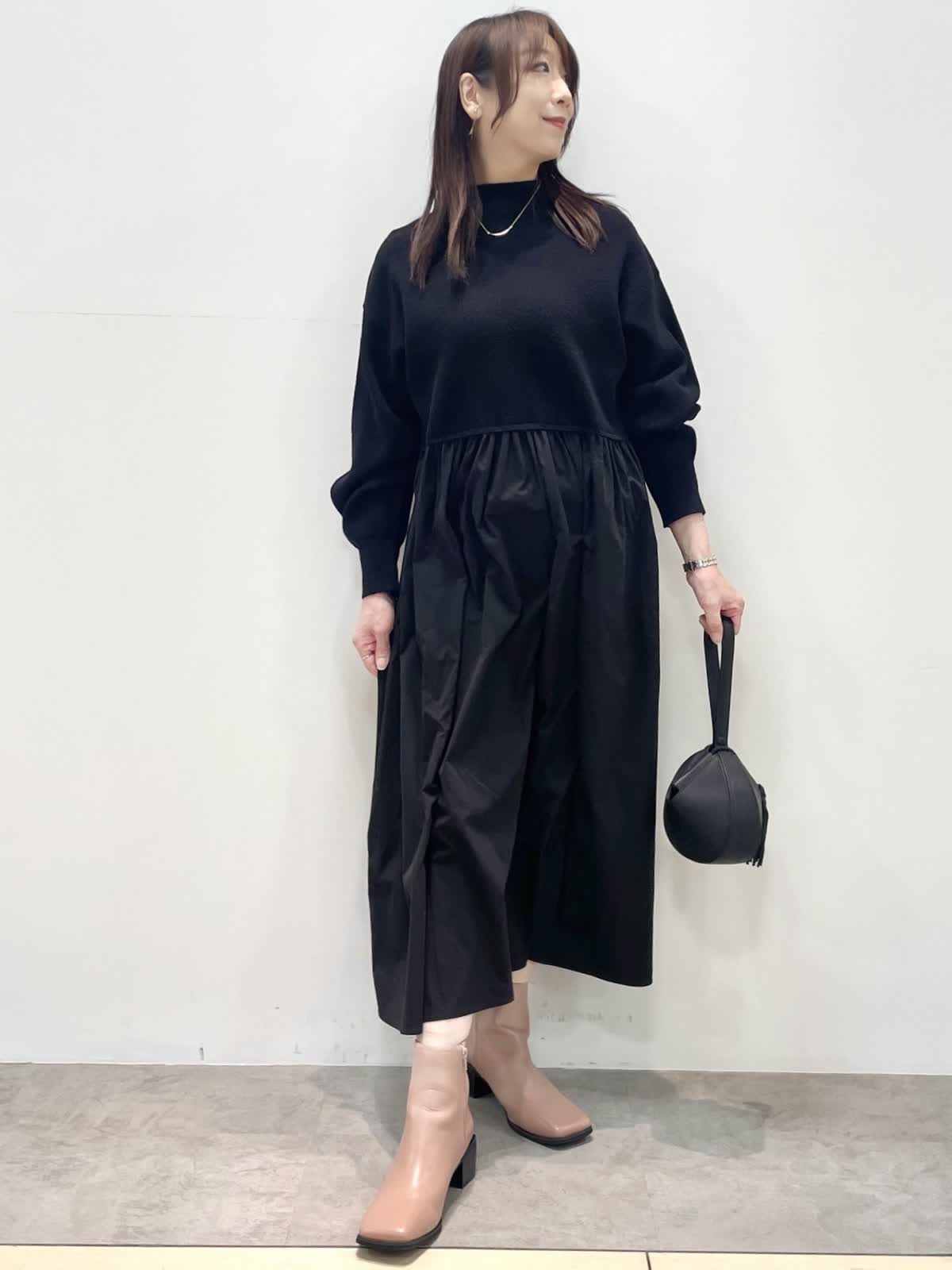 【着用サイズ】全て9号 【カラー】ファージレ:グレーベージュ ワンピース: ブラック 休日お出かけスタイル。ドッキングワンピースはニット部分の着丈が短めでスタイルアップして見えます。エコファージレは羽織るだけで今っぽく決まる優秀アイテム。軽くて暖かく肌触りも抜群。裾を絞ると丸いシルエットになり雰囲気を変えて着用いただけます。