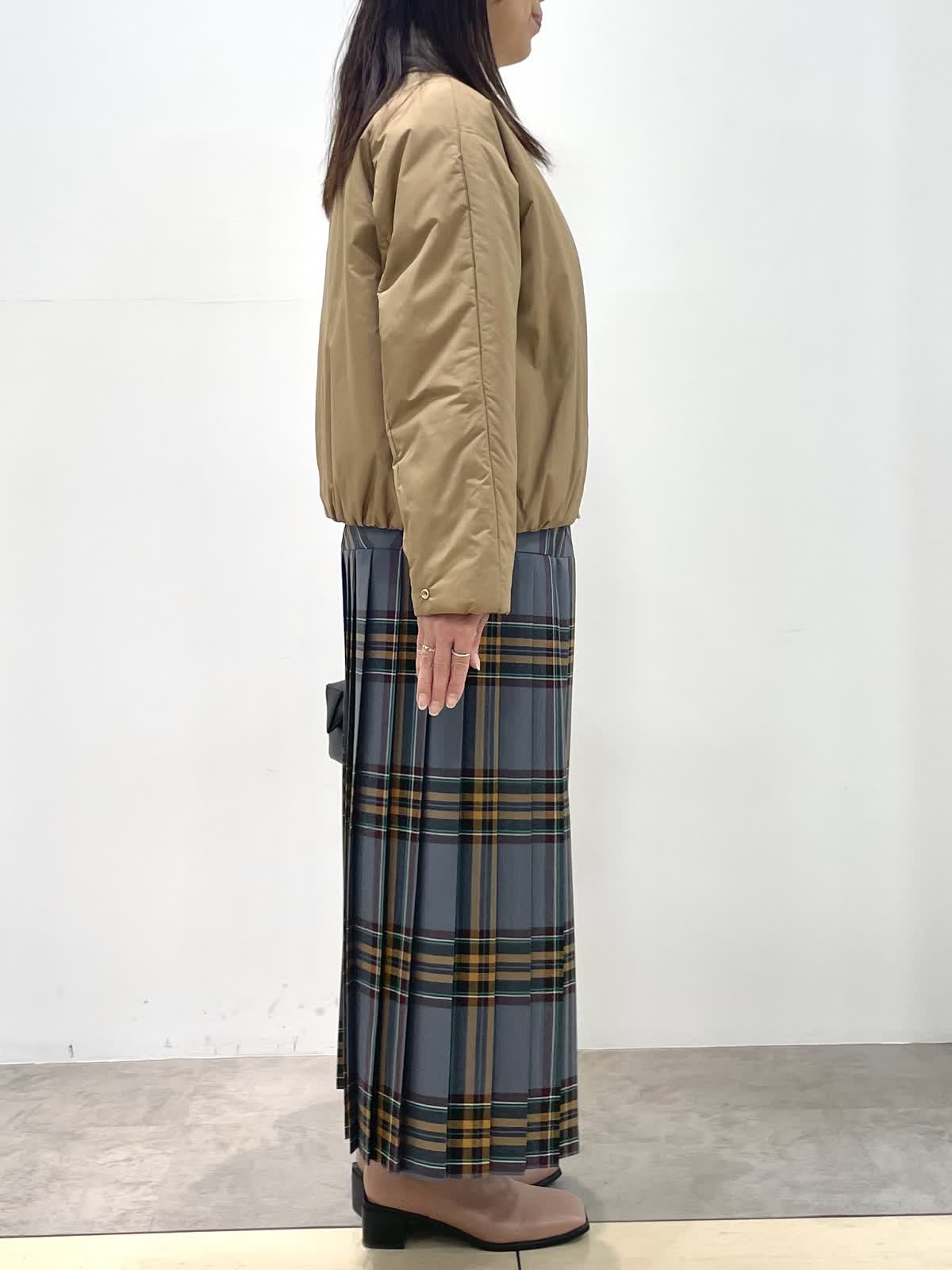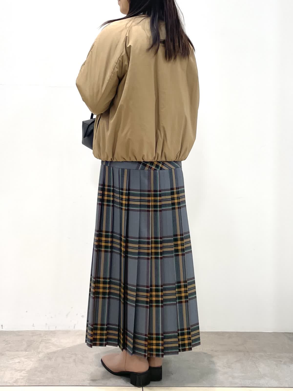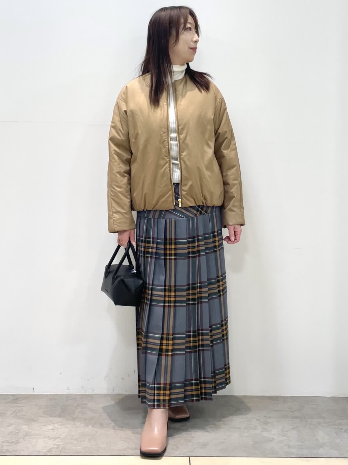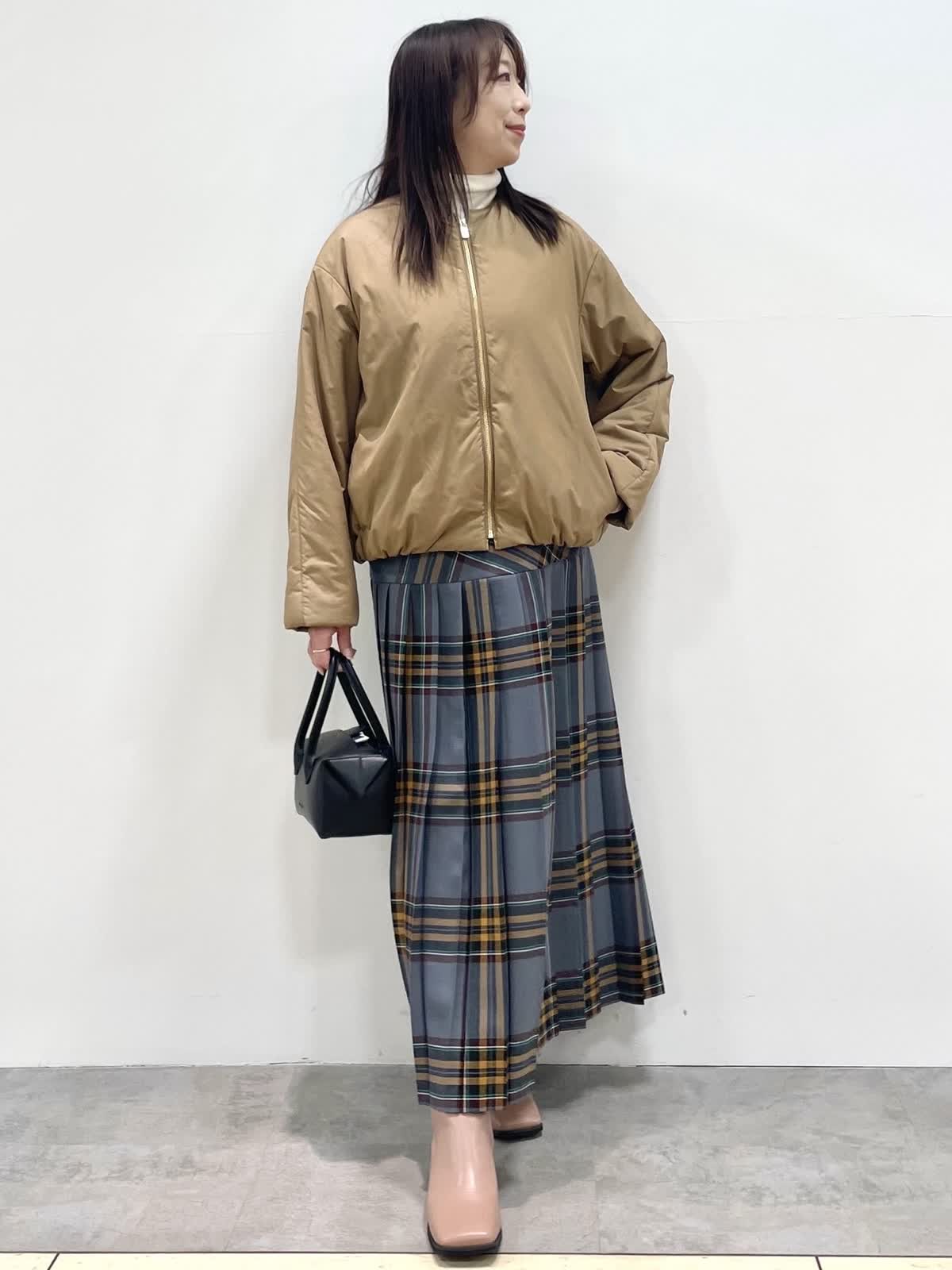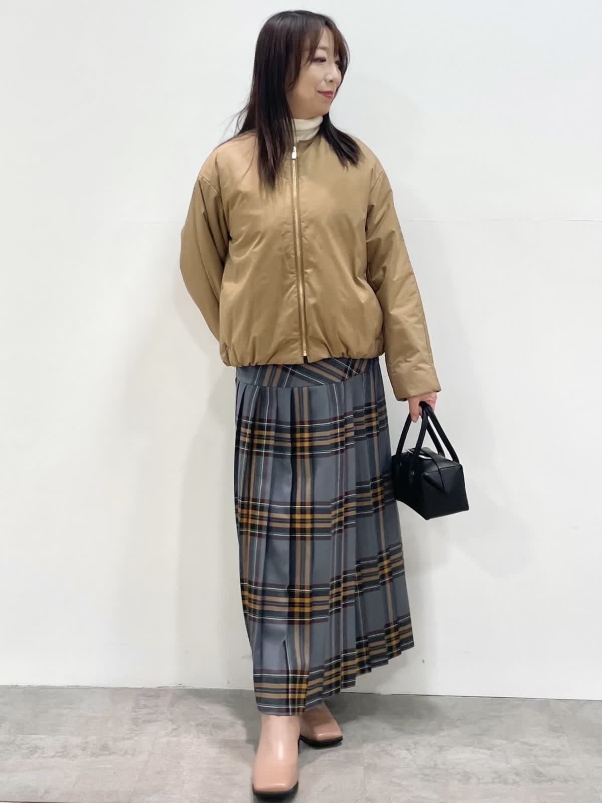 【着用サイズ】全て9号 【カラー】ブルゾン: キャメル ニット: オフホワイト スカート: ブルーグレー 冬のお出かけスタイル。とても軽くて暖かい中綿ブルゾン。コンパクトな着丈でスカート、ワイドパンツにバランス良く決まります。目を惹くチェック柄スカートはヒップにかけて切り替えが入ったデザイン。プリーツが広がらずスッキリ見えます。