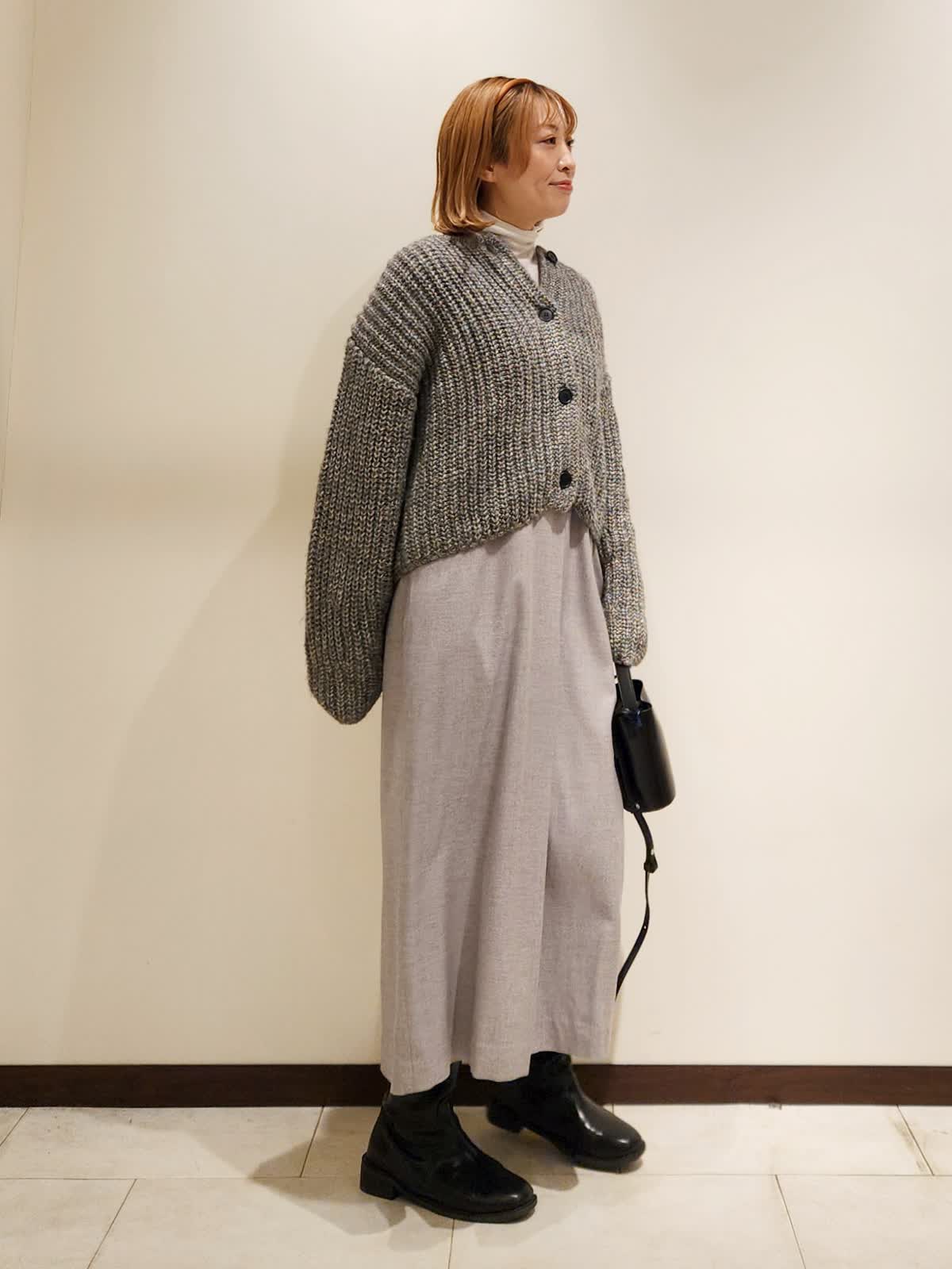 【着用サイズ】すべて9号 【着用カラー】カーディガン:グレー カットソー:オフホワイト ワンピース:グレー キラキラカーディガンが主役!!ワントーンコーデ。 カーディガンは見れば見るほど魅力的なカラー。カラーやキラキラ糸が織り成すデザインは他にないアイテム。ワンピースの上にプラスしてグレーでまとめました。リラックスしながらきちんと見えする印象。 小ぶりなバックで華やぐ女子コーディネートに。