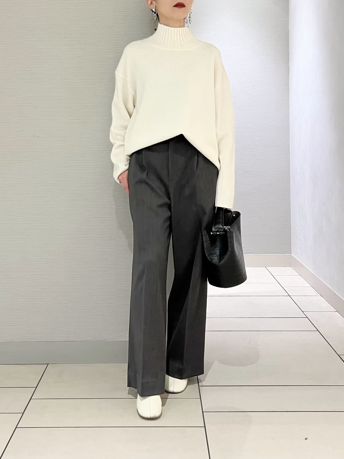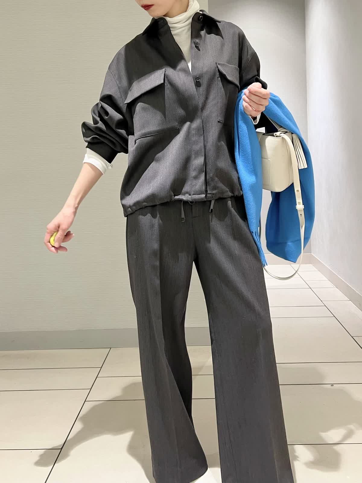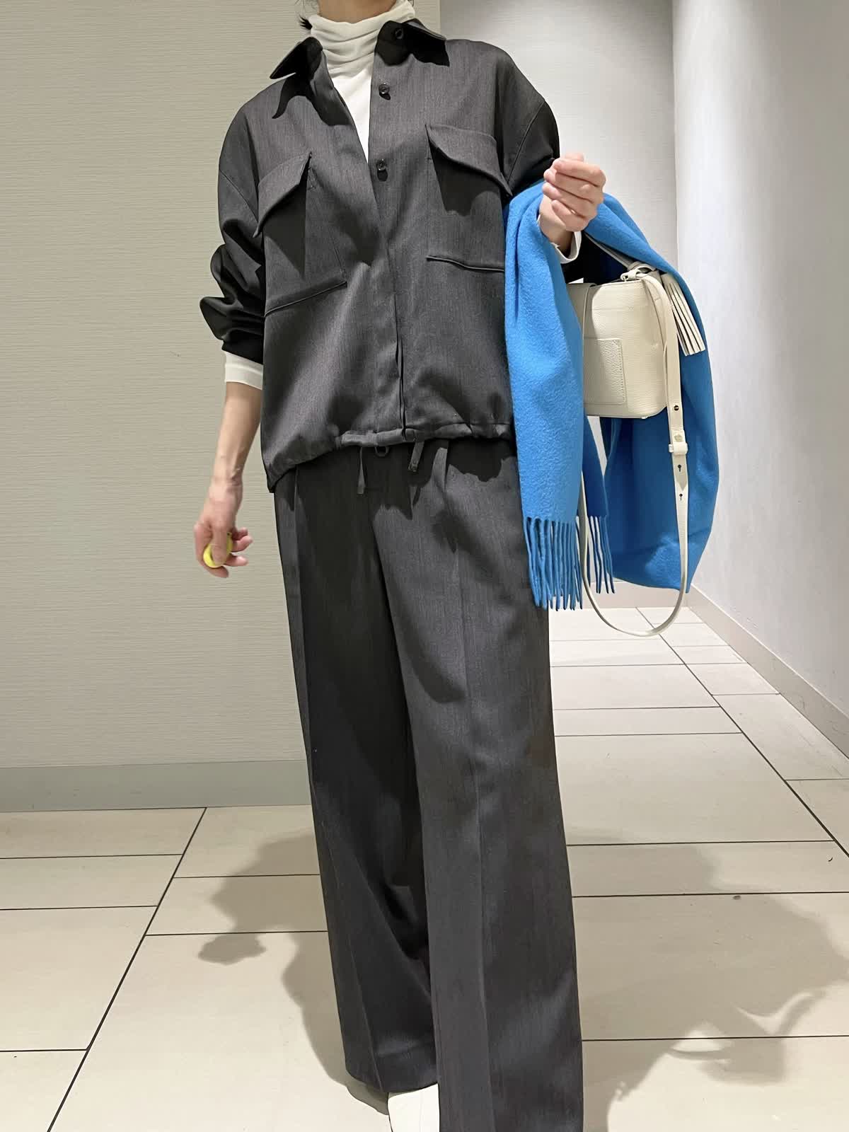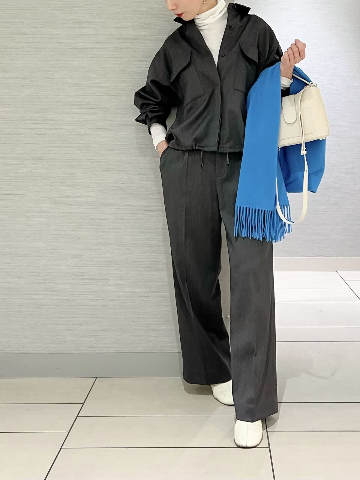 【カラー・サイズ】ブラウス:チャコールグレー・9号 カットソー:オフホワイト・9号 パンツ:チャコールグレー・5号 モダンな印象のセットアップに白のタートルネックを重ねた、上品なレイヤードスタイル。差し色の鮮やかなブルーのストールが、落ち着いたモノトーンコーデに華やかさをプラスします。