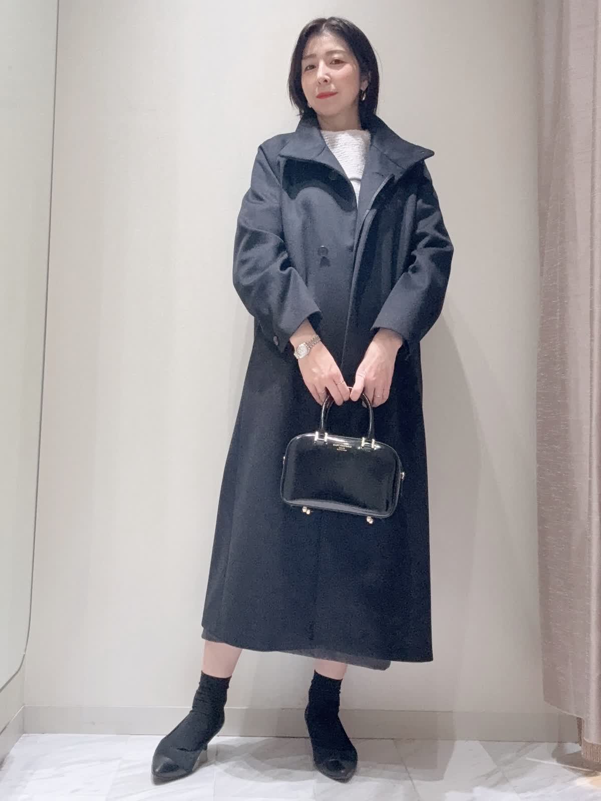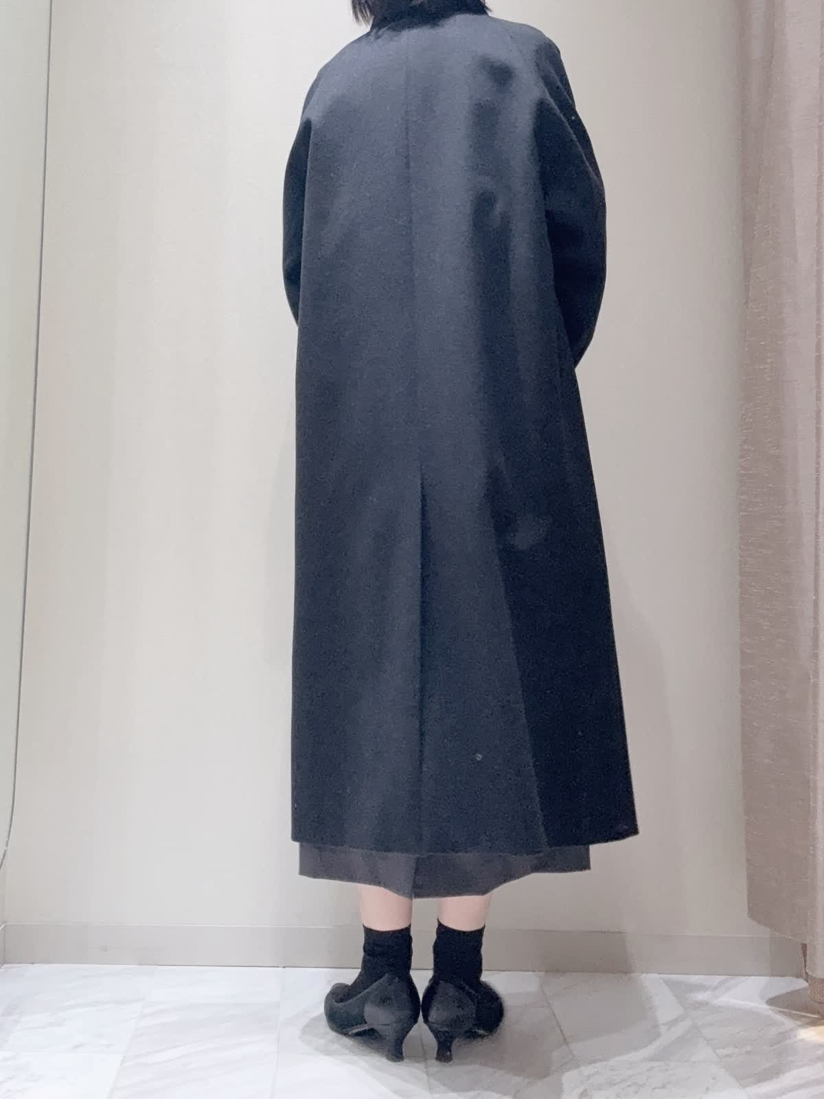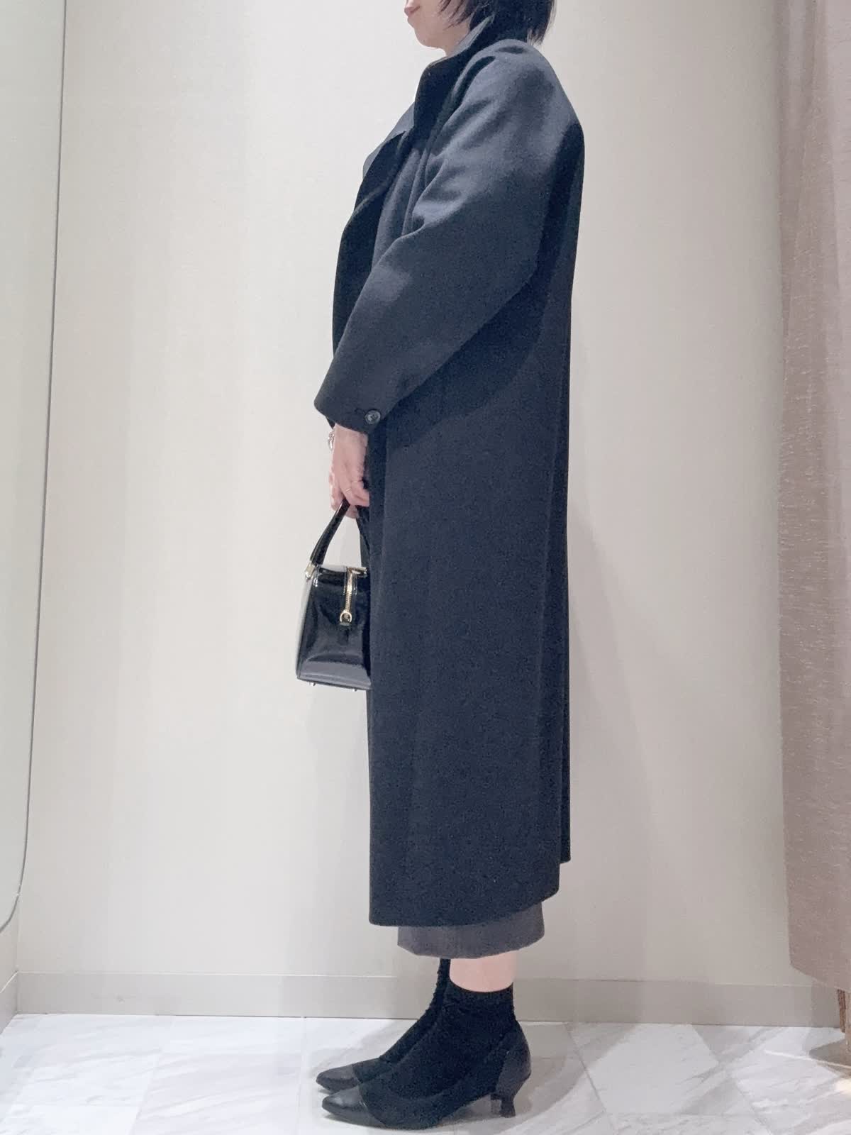 【着用サイズ】全て:9号 【着用カラー】コート:チャコールグレー ニット: オフホワイト スカート: グレー バッグ: ブラック クラシックなロングラインコート。上質なウール素材を使用し、裾にさりげなくボリュームを持たせたトラペーズ型にカットされています。柔らかくカーブしたファンネルネックと控え目なバットウィングスリーブが特徴です。