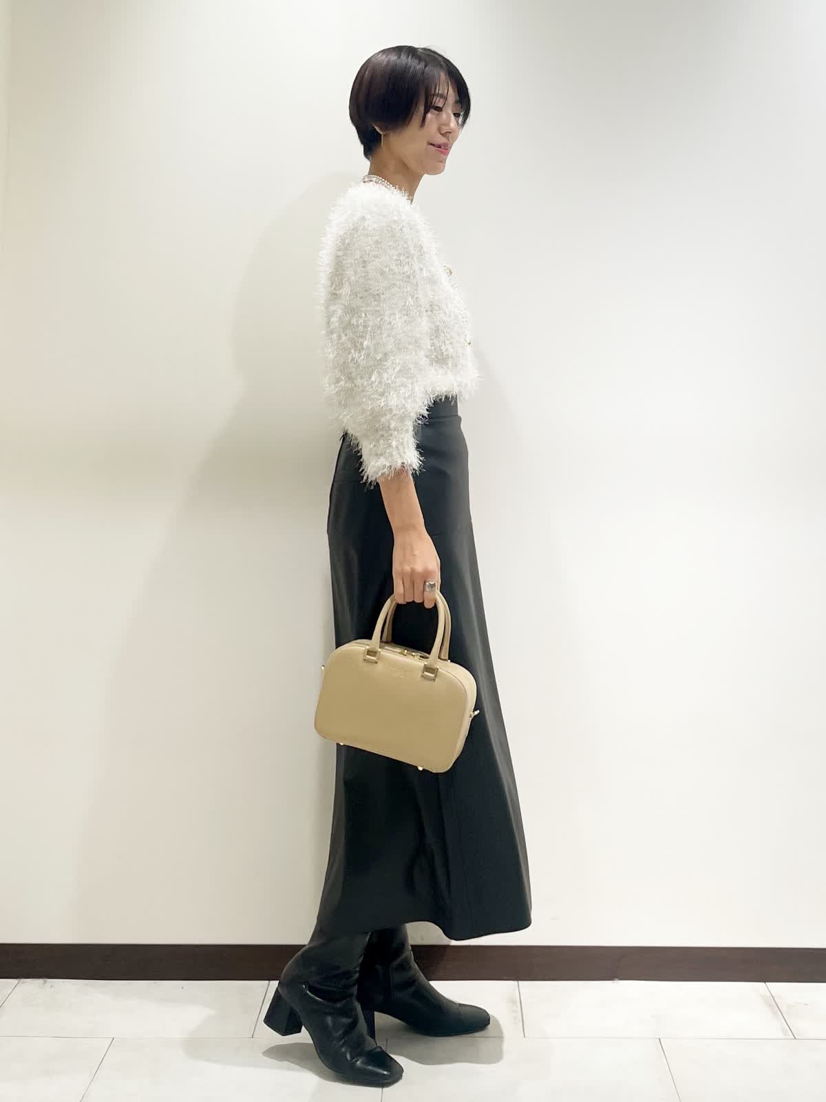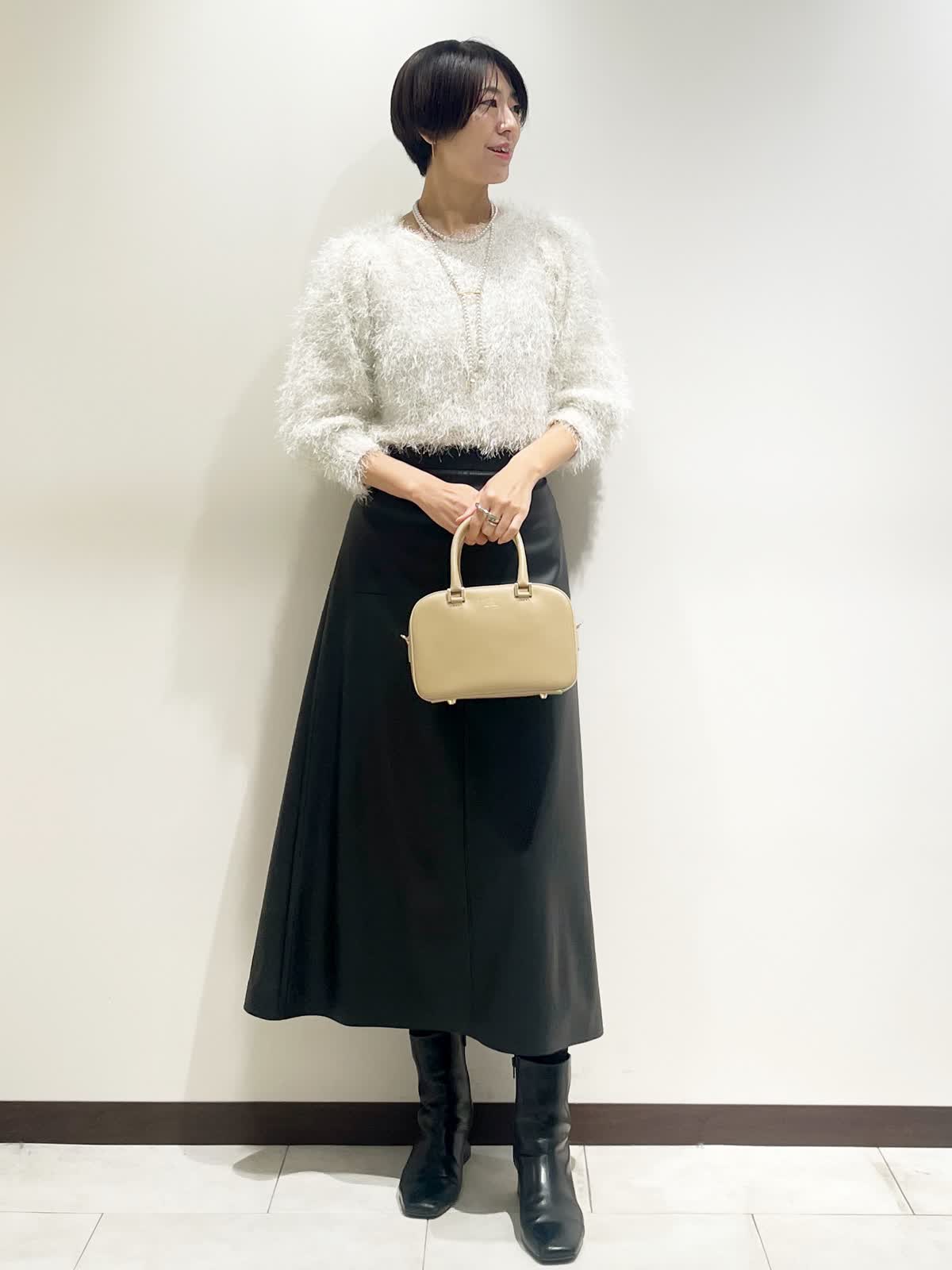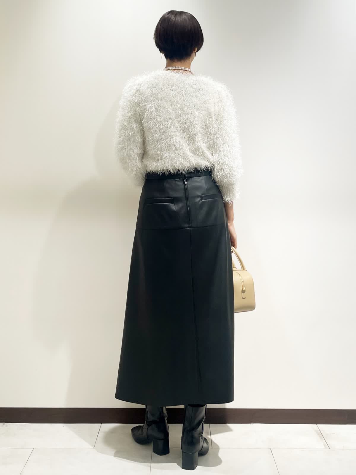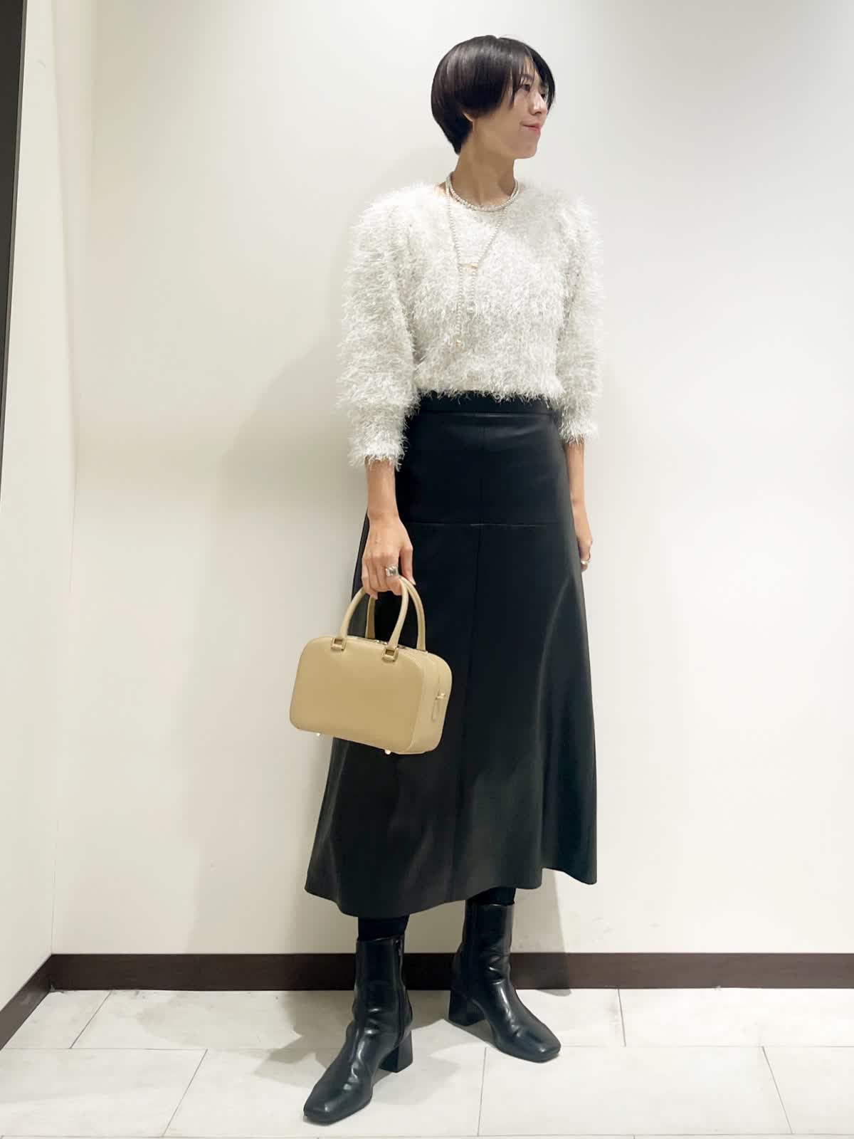 【着用サイズ】全て9号 【カラー】ニット:オフホワイト スカート:ブラック バック:ベージュ ネックレス:ゴールド 【コーディネートテーマ】 クリスマスやお呼ばれにピッタリの華やかコーデ シャギーニットはノンウールなので毛とびもなく着やすさ抜群です! レザースカートで甘辛ミックスに 【サイズ感】 163p 普段9号サイズ 骨格ウェーブで上半身に比べてヒップがやや大きい