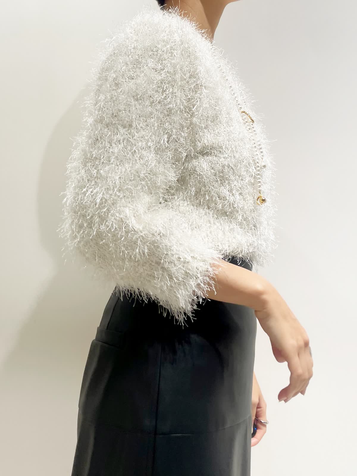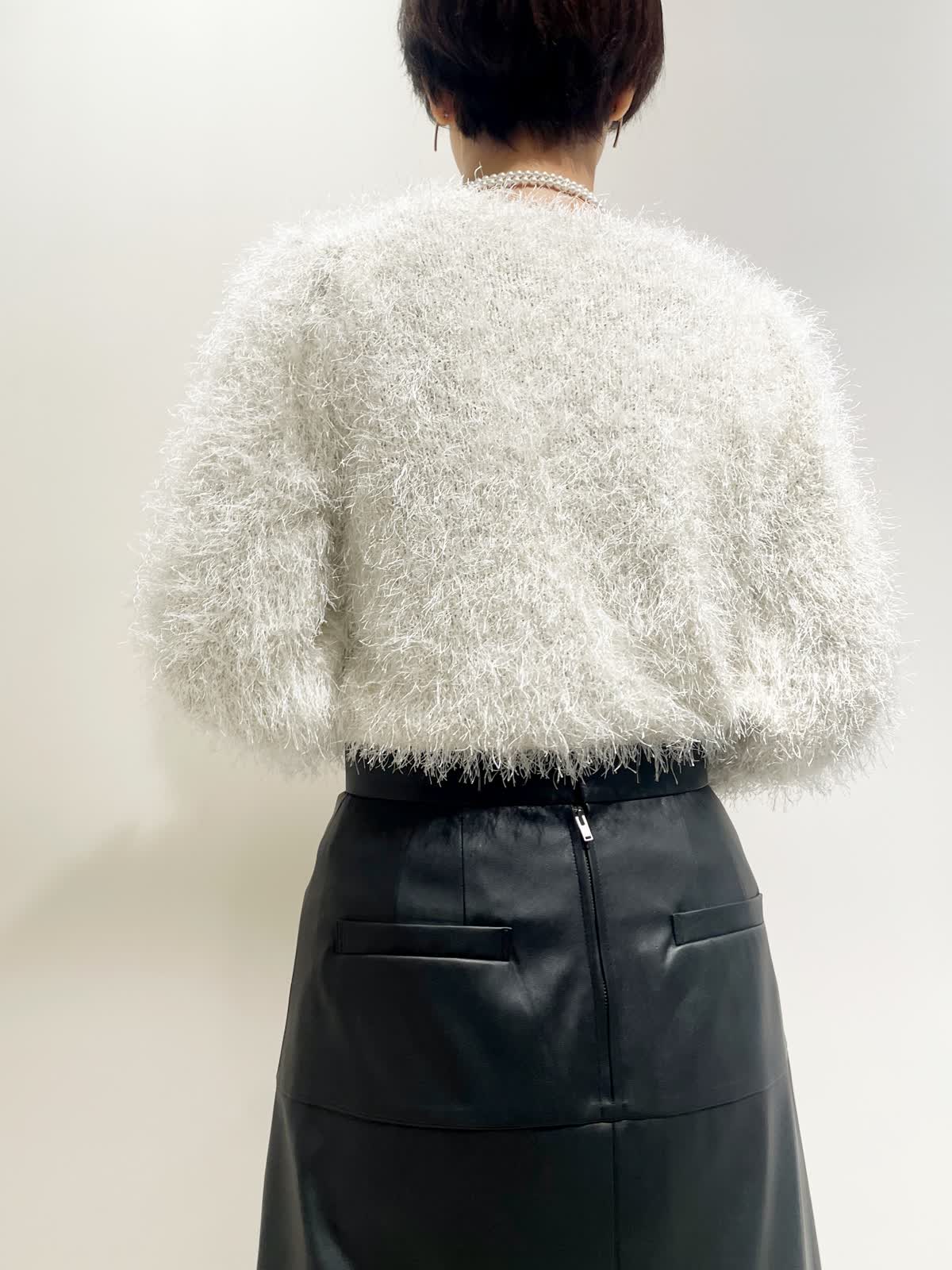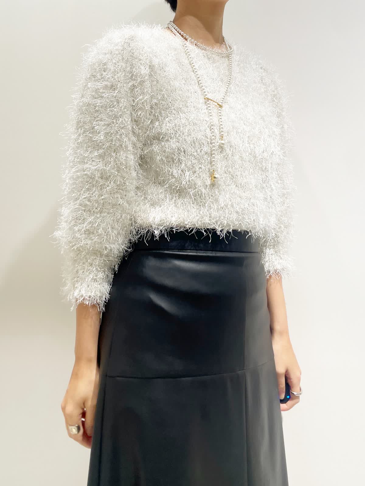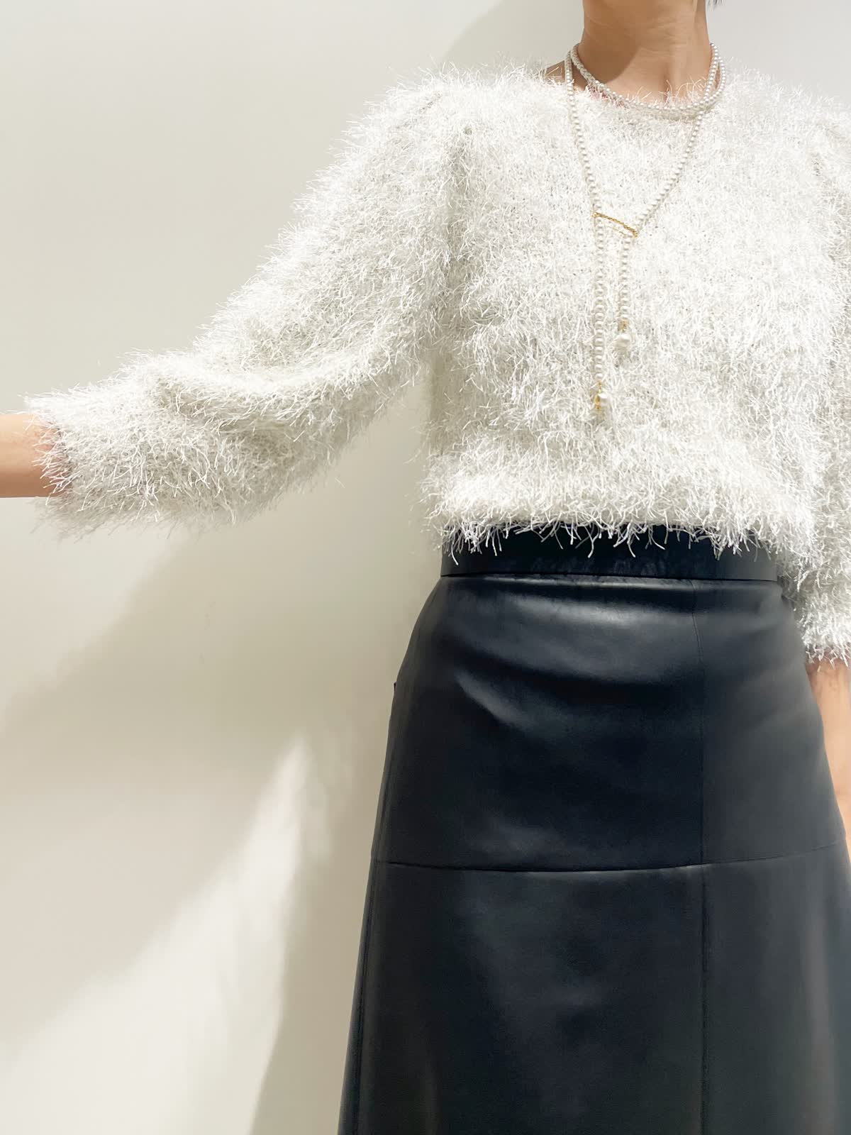 【着用サイズ】全て9号 【カラー】ニット:オフホワイト スカート:ブラック バック:ベージュ ネックレス:ゴールド 【コーディネートテーマ】 クリスマスやお呼ばれにピッタリの華やかコーデ シャギーニットはノンウールなので毛とびもなく着やすさ抜群です! レザースカートで甘辛ミックスに 【サイズ感】 163p 普段9号サイズ 骨格ウェーブで上半身に比べてヒップがやや大きい