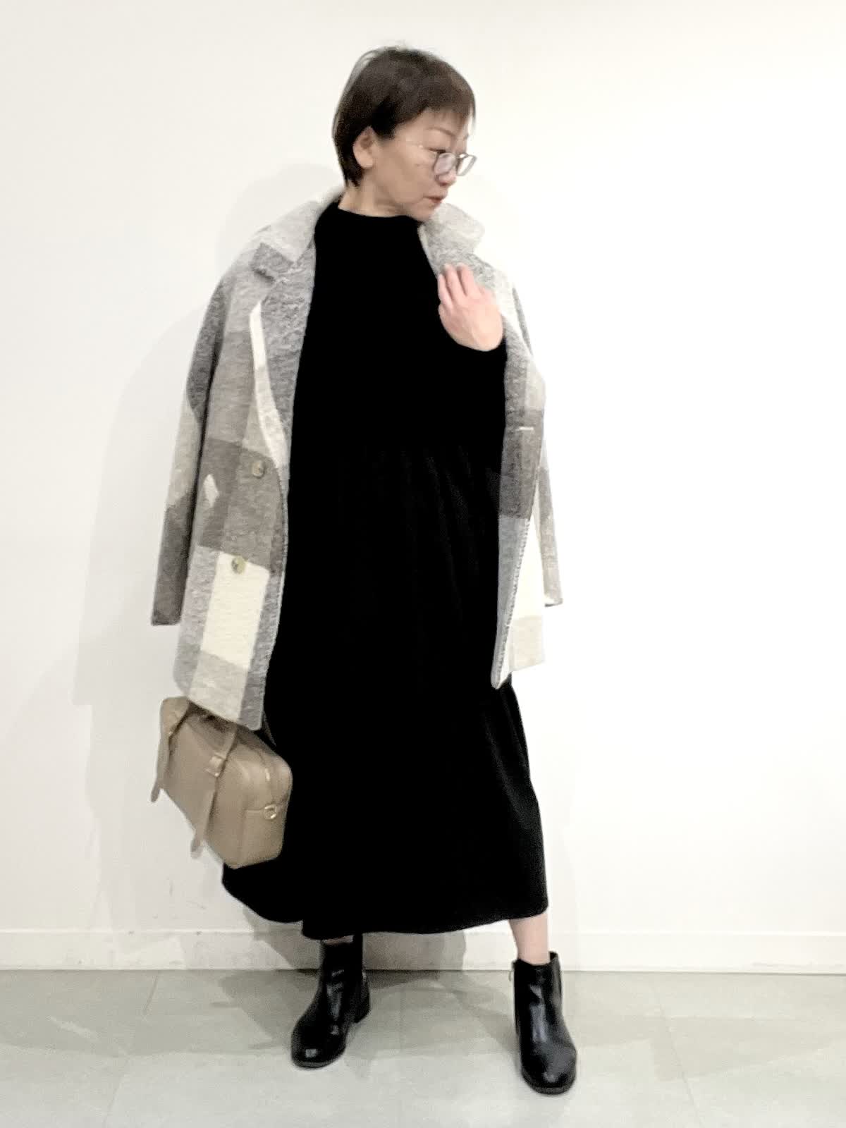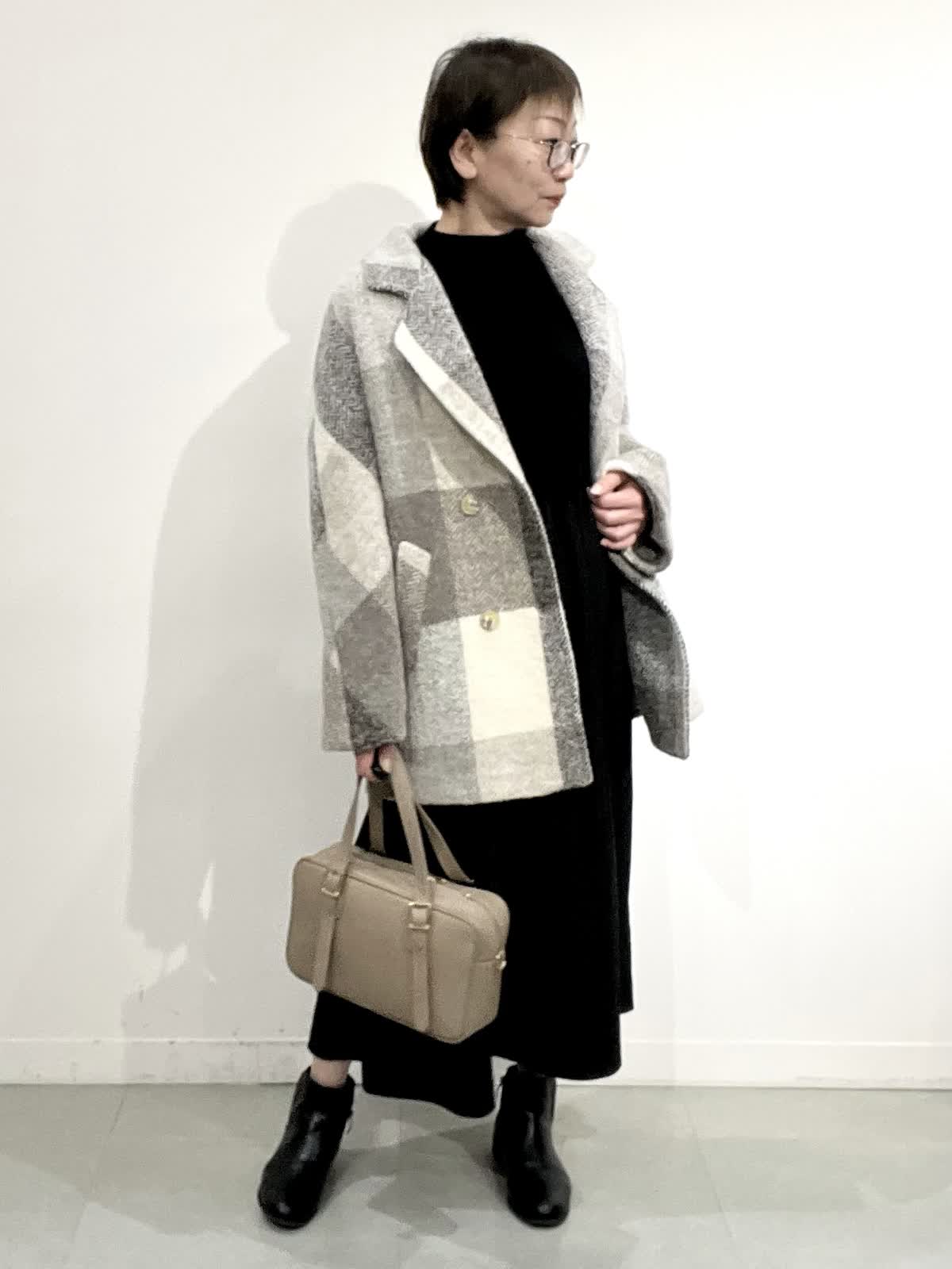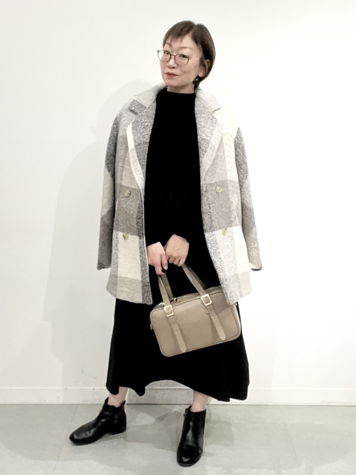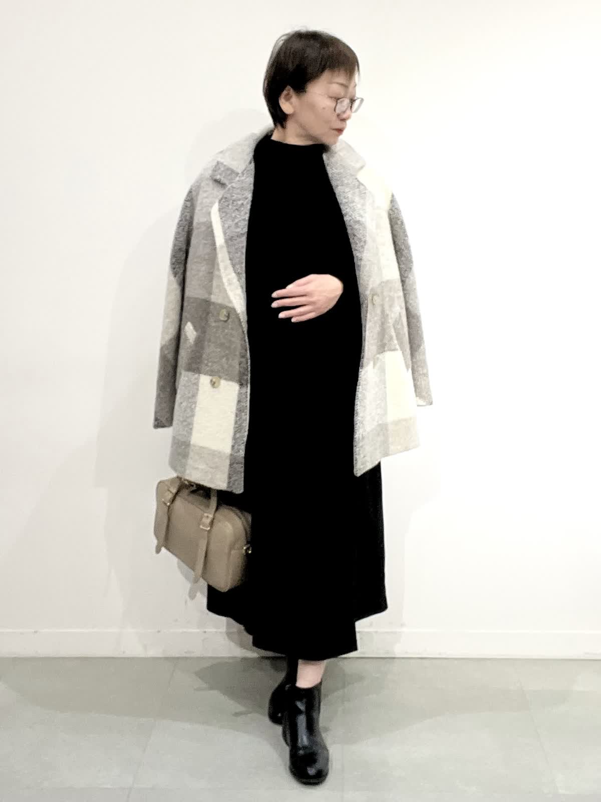 【着用サイズ】コート:09 ワンピース:フリー 【着用カラー】コート:オフホワイト ワンピース:ブラック バック:グレーベージュ イタリア製のコートは立体感のある素材で、ざっくりとした風合いがとで素敵です。ゆったりしたサイズ感なのですが、もたつきがありません。 合わせたワンピースは、胸元で切り替えのあり、シンプルで着心地の良い素材です。ご自宅でお洗濯できます。