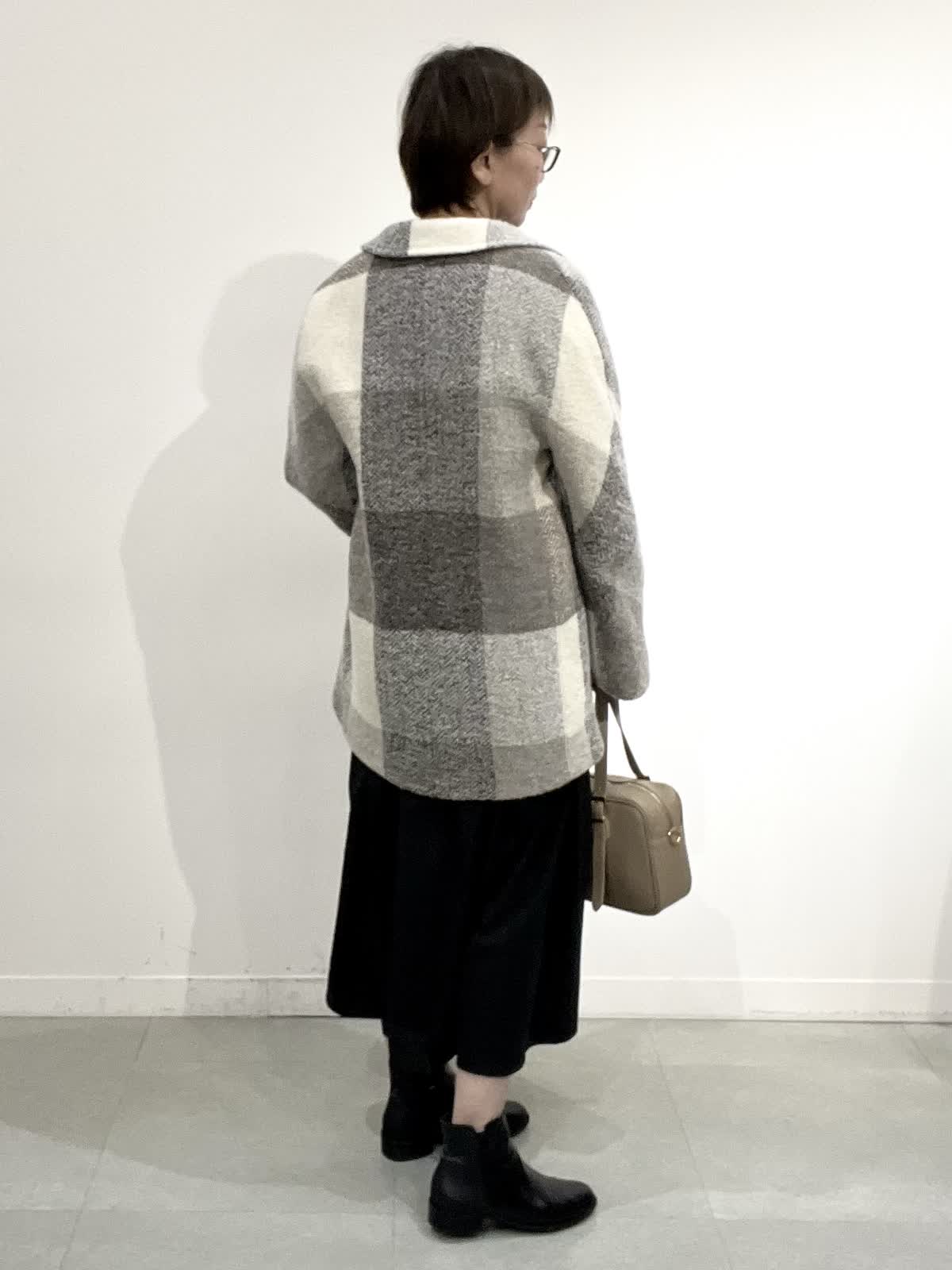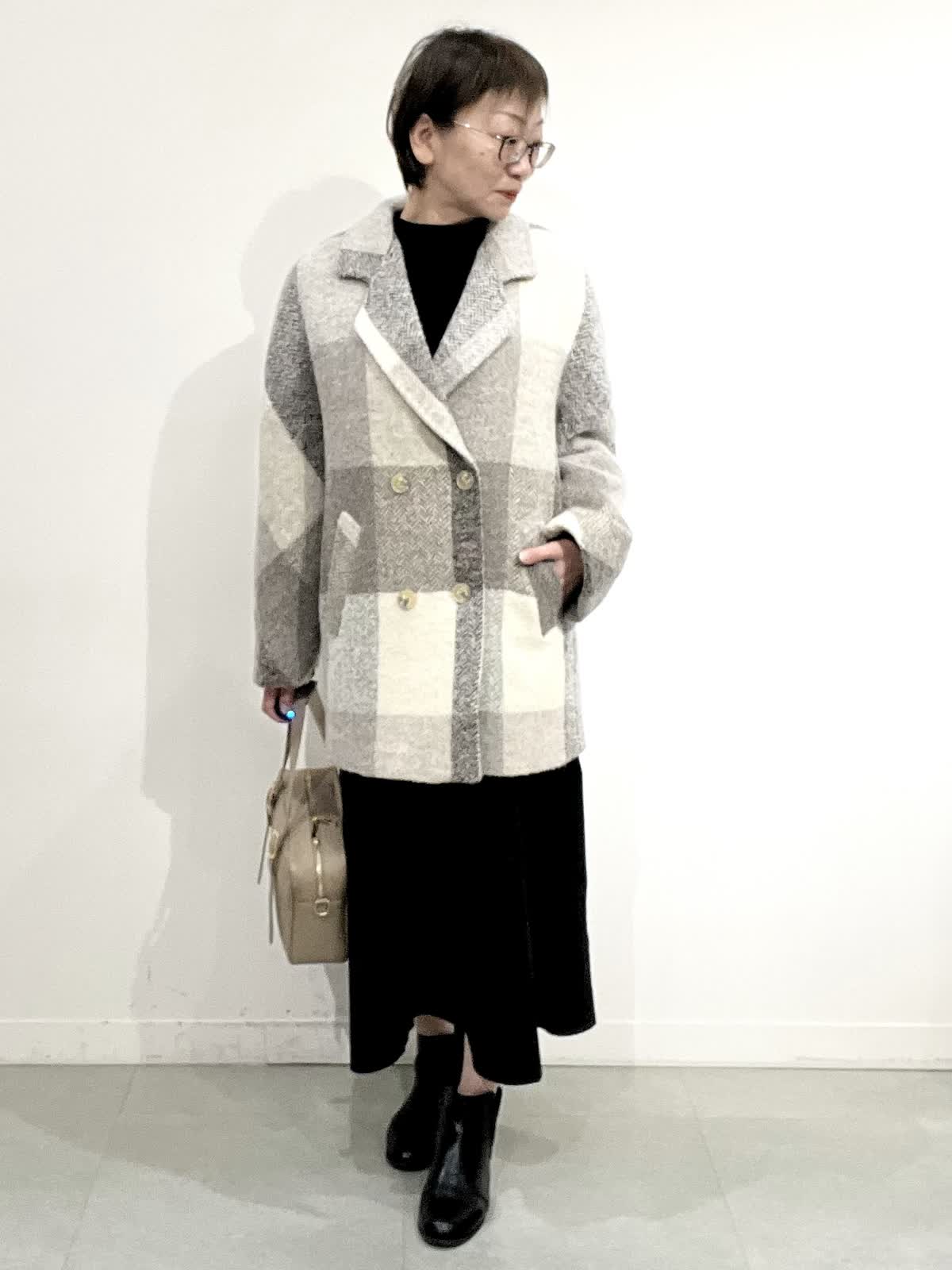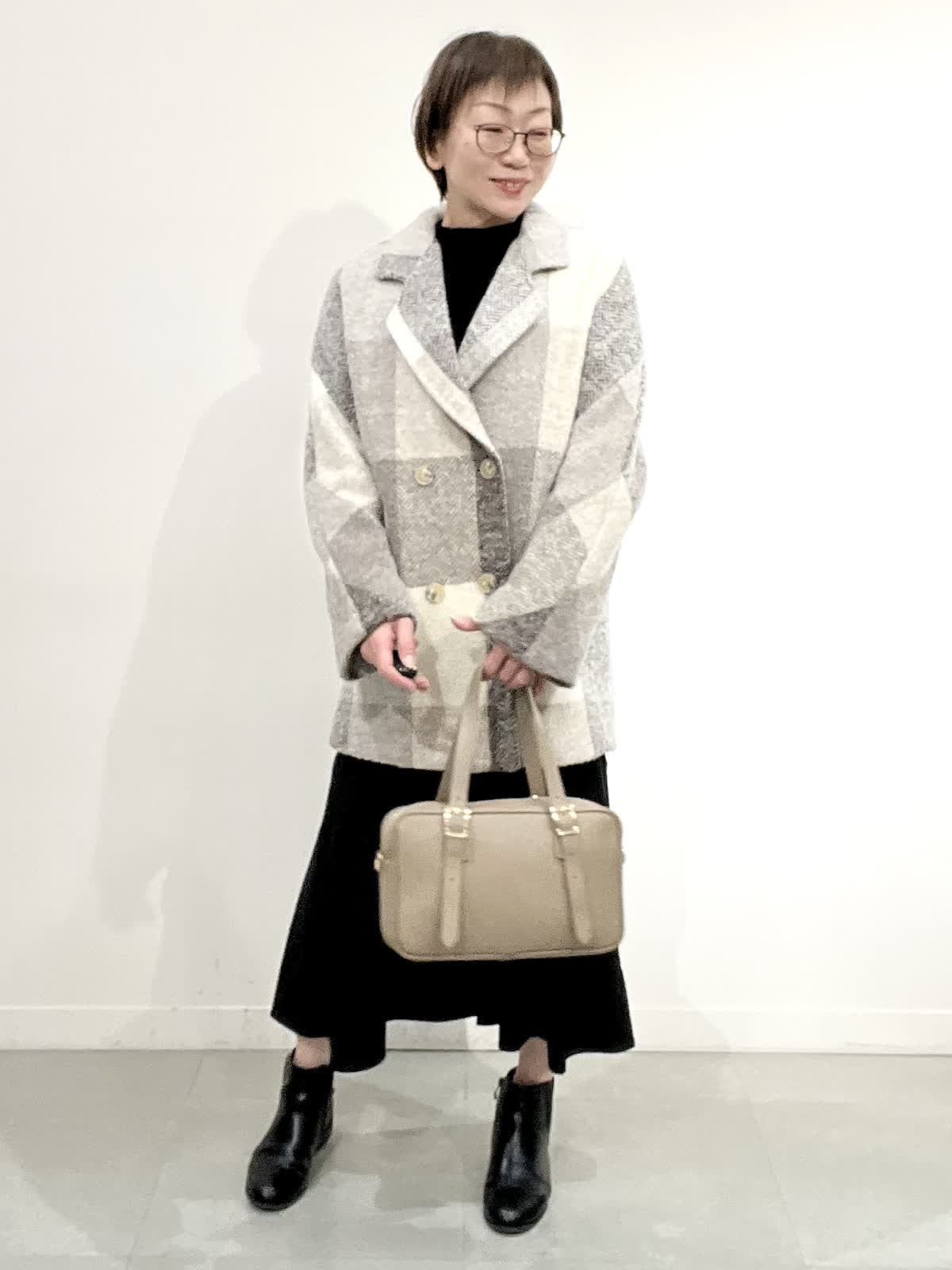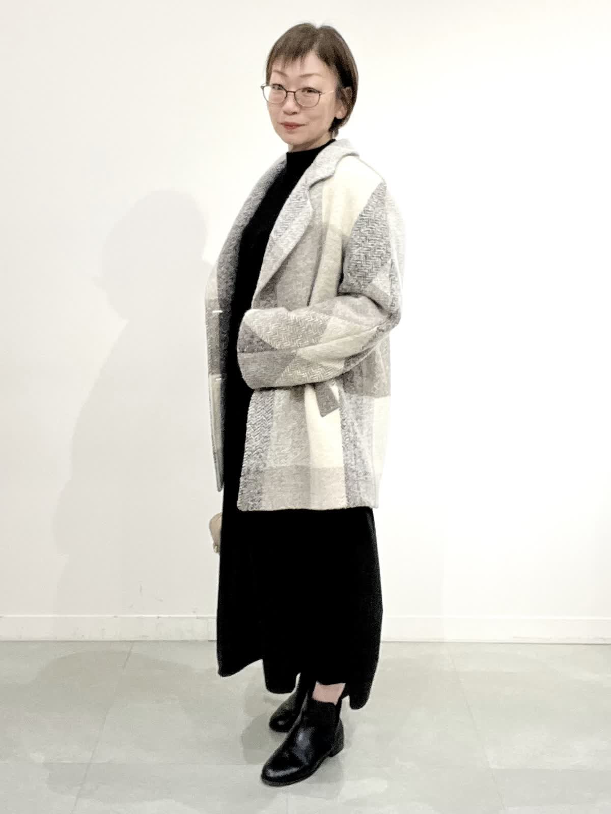 【着用サイズ】コート:09 ワンピース:フリー 【着用カラー】コート:オフホワイト ワンピース:ブラック バック:グレーベージュ イタリア製のコートは立体感のある素材で、ざっくりとした風合いがとで素敵です。ゆったりしたサイズ感なのですが、もたつきがありません。 合わせたワンピースは、胸元で切り替えのあり、シンプルで着心地の良い素材です。ご自宅でお洗濯できます。