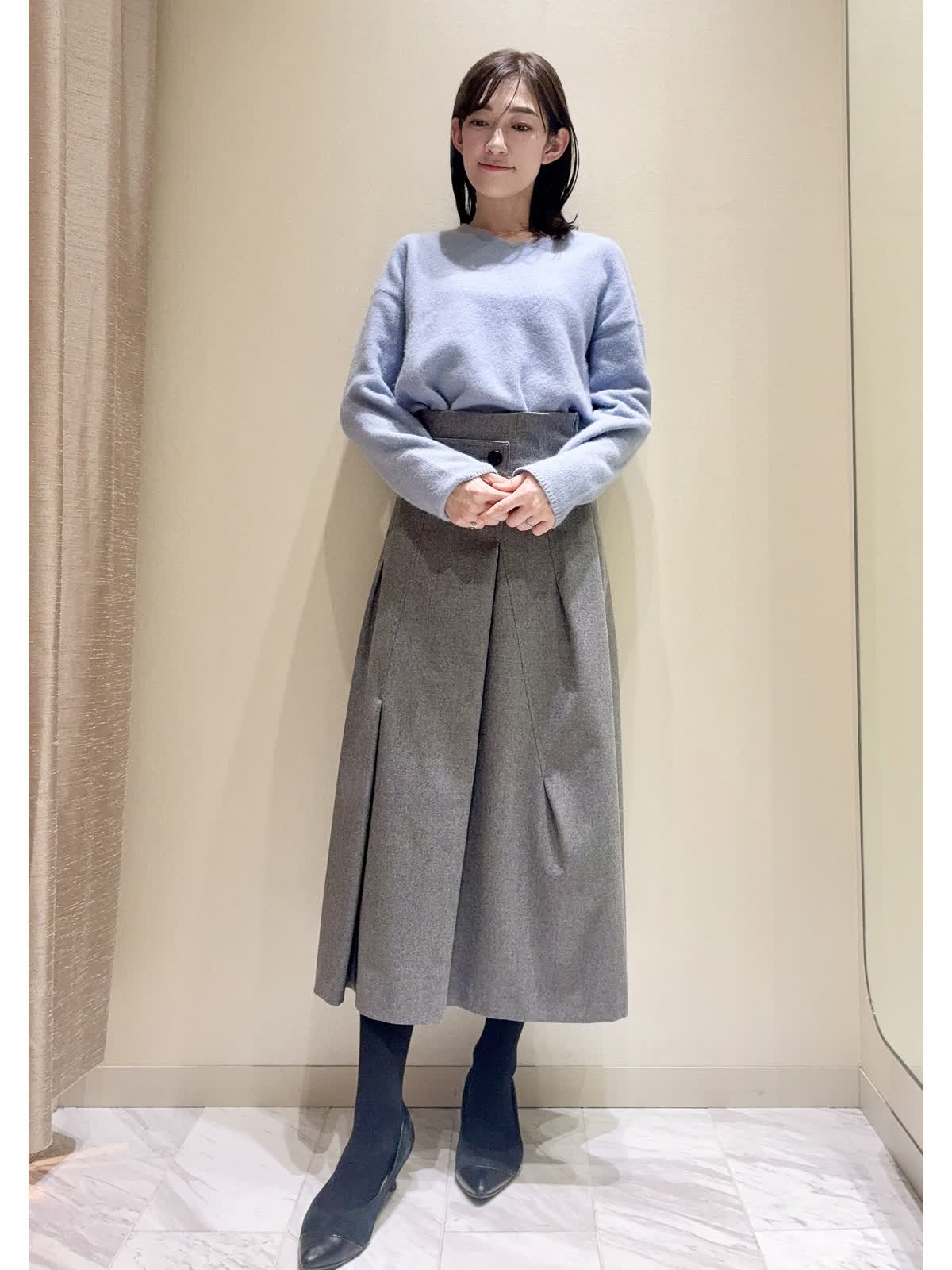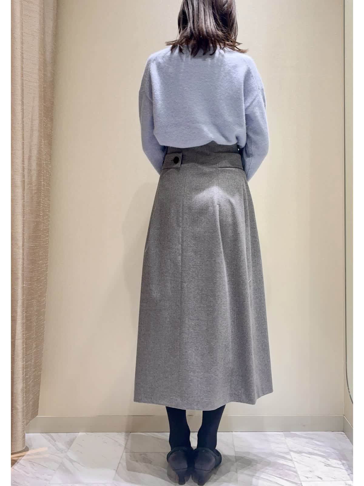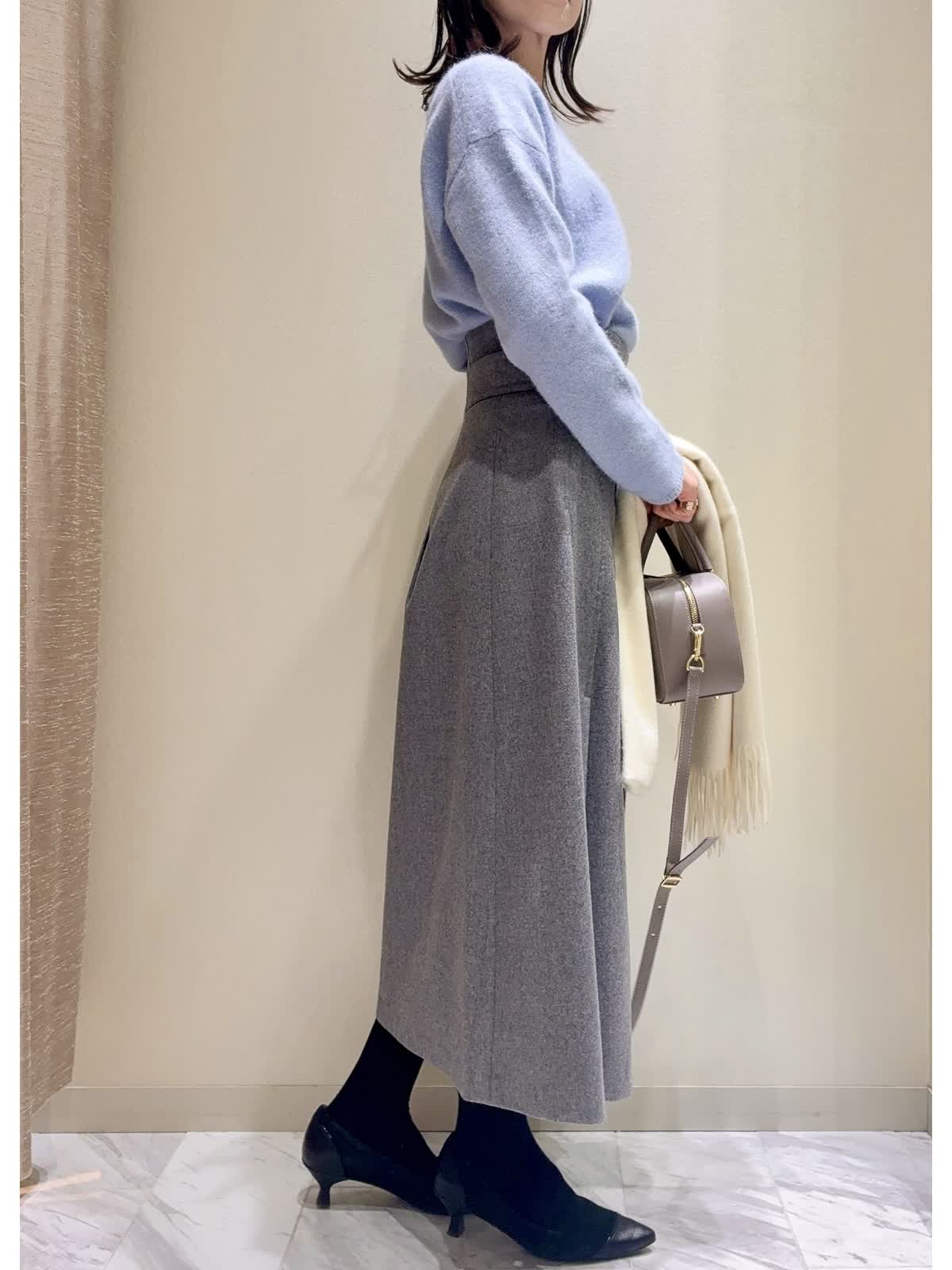 【着用サイズ】全て:9号 【着用カラー】Vニット:サックス スカート:グレー/オフホワイト タートルネックニット:ブラック バッグ:グレーベージュ 冬の通勤にもおすすめのスカートをご紹介いたします。 スカートは、冬らしい柔らかいフラノ素材です。前はアシンメトリーなタックが入っているので、ボリュームが出過ぎず広がりがきれいです。後ろはすっきりラインです。ハイウエストなので、トップスインにすると、さらにウエスト位置が高く見えます。 トップスにはパステルカラーのふんわりニットや、シンプルなタートルネックのニットを合わせ、お仕事用にも着回し万能アイテムです。