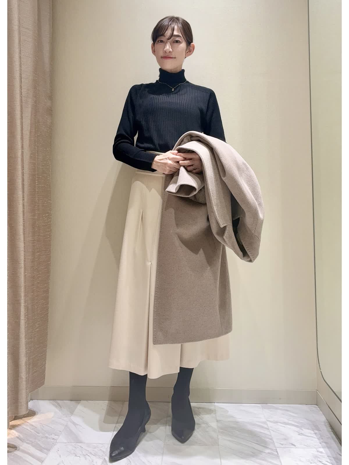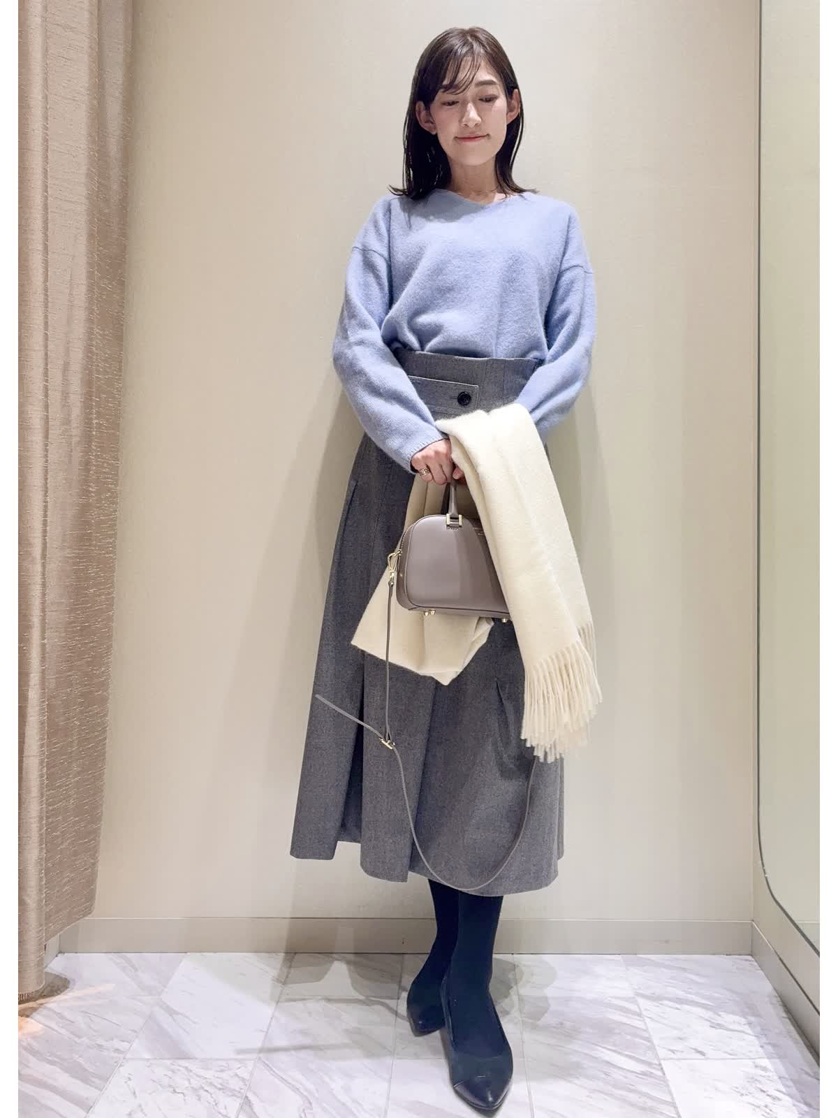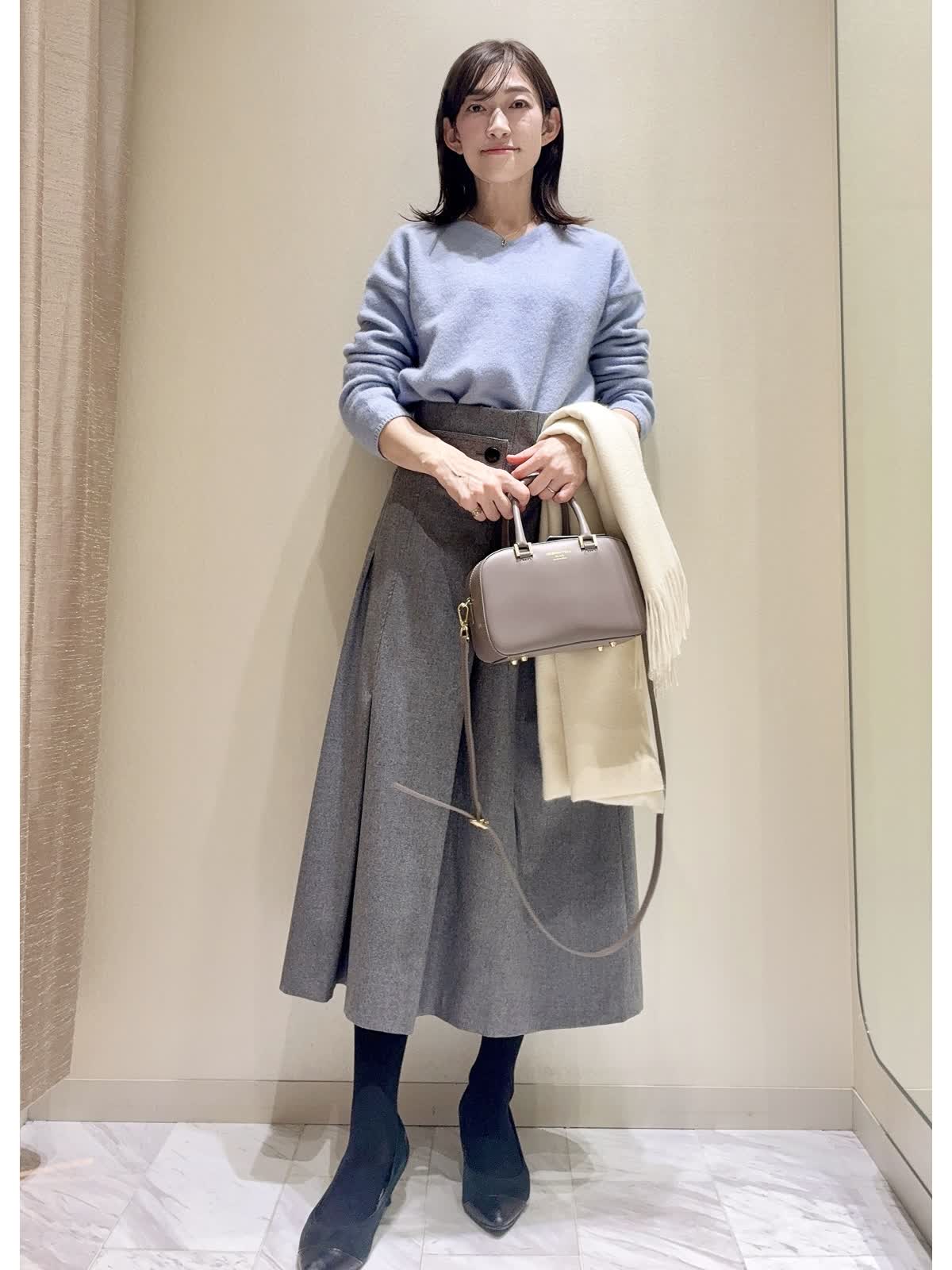 【着用サイズ】全て:9号 【着用カラー】Vニット:サックス スカート:グレー/オフホワイト タートルネックニット:ブラック バッグ:グレーベージュ 冬の通勤にもおすすめのスカートをご紹介いたします。 スカートは、冬らしい柔らかいフラノ素材です。前はアシンメトリーなタックが入っているので、ボリュームが出過ぎず広がりがきれいです。後ろはすっきりラインです。ハイウエストなので、トップスインにすると、さらにウエスト位置が高く見えます。 トップスにはパステルカラーのふんわりニットや、シンプルなタートルネックのニットを合わせ、お仕事用にも着回し万能アイテムです。