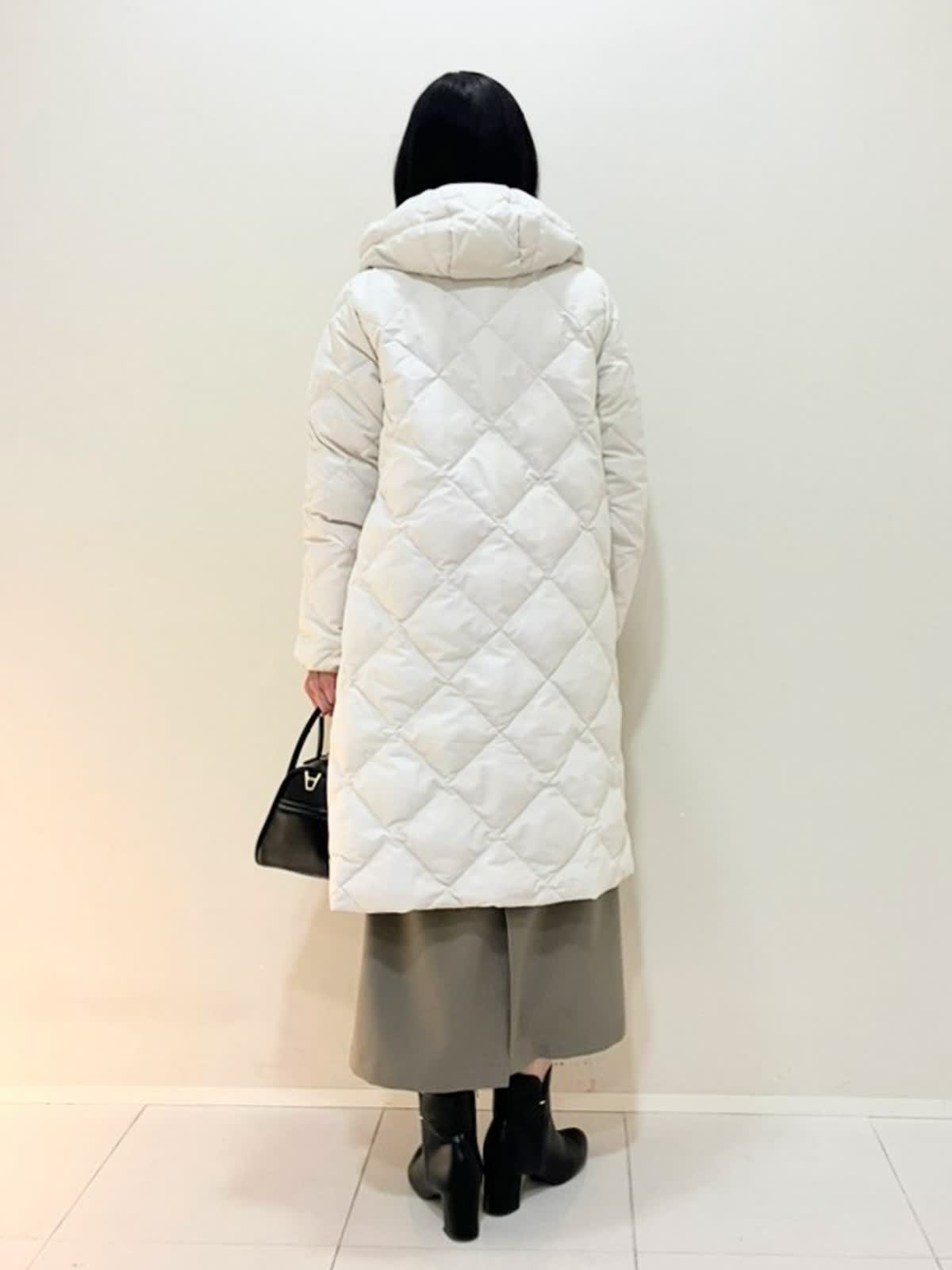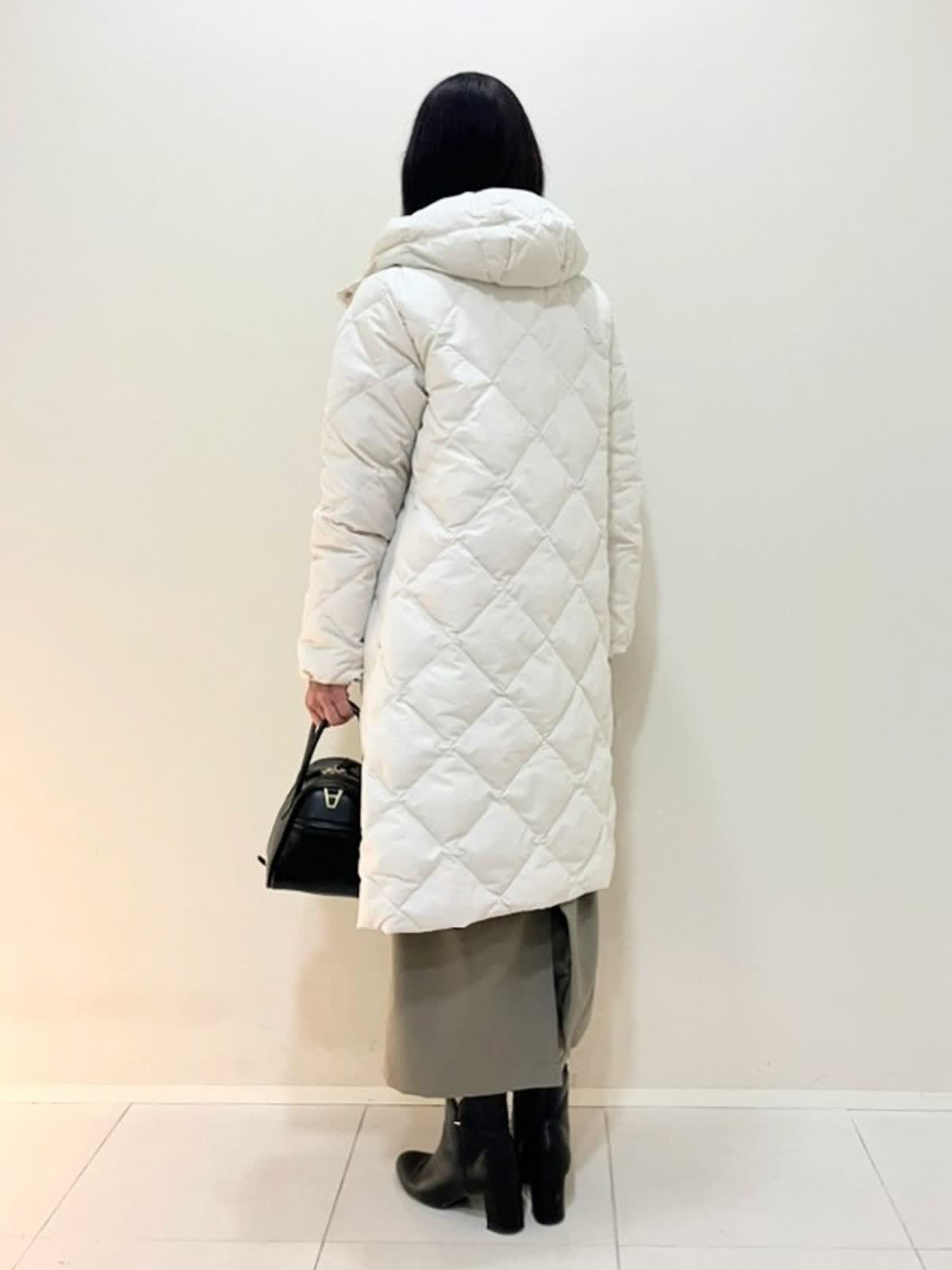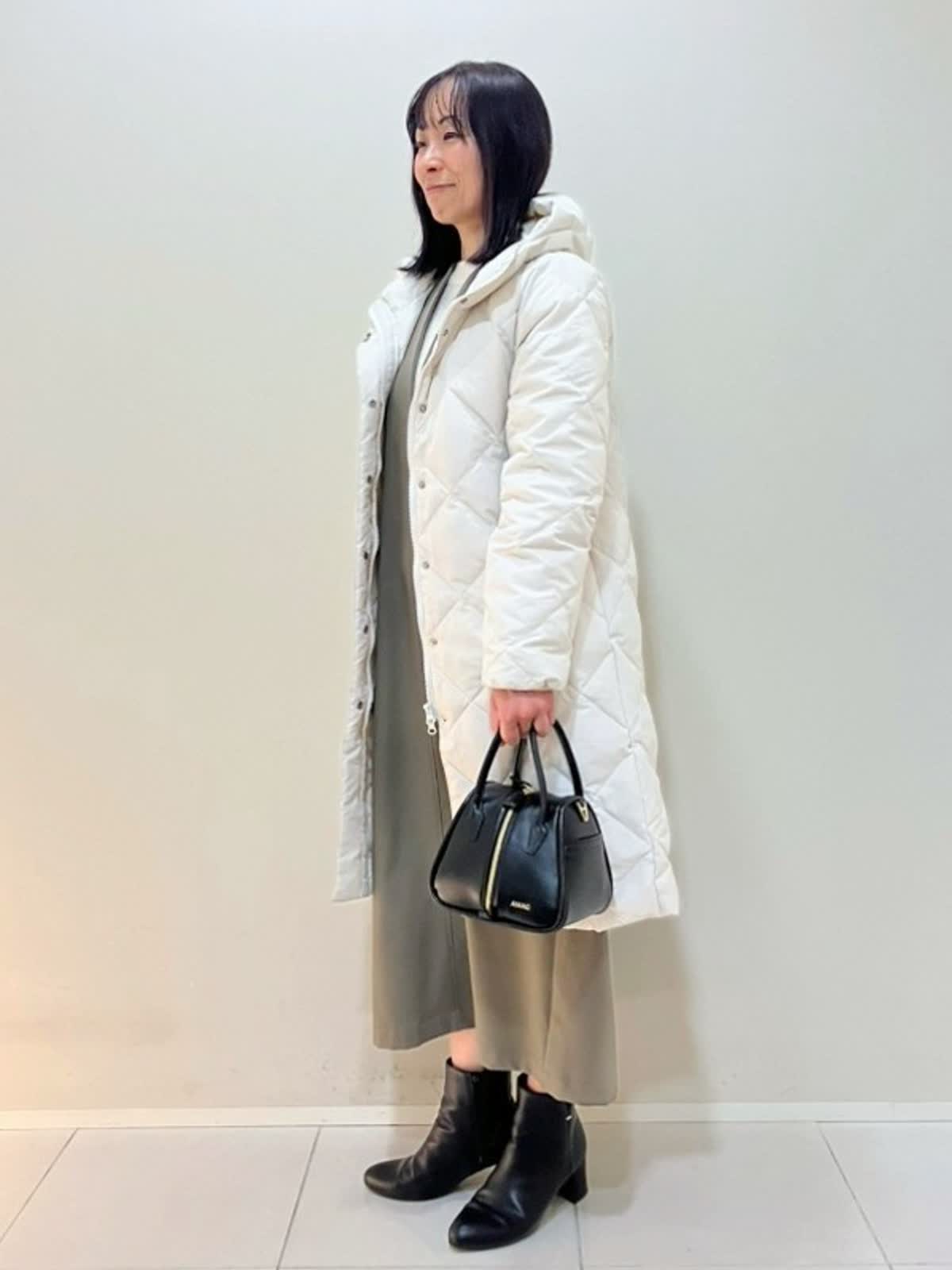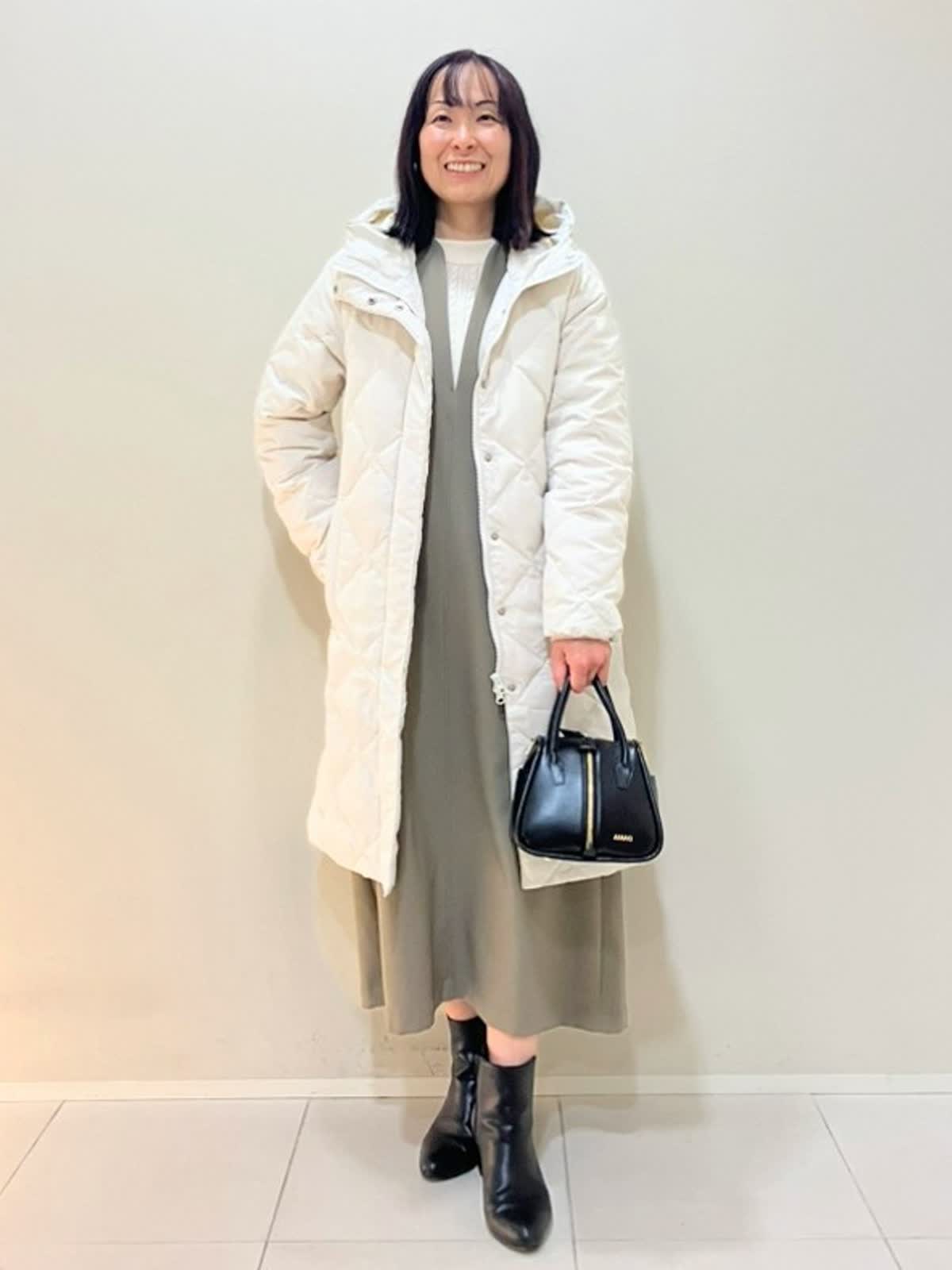 【着用サイズ】ダウン:9号 ニット:フリー ワンピース:フリー 【着用カラー】 ダウン:グレーベージュ ニット:アイボリー ワンピース:モカチャ 年末年始のおでかけスタイル 軽くて暖かいダウンは外のおでかけに最適なアイテム。モコモコしすぎずスッキリ見えます。ニットはアルパカ100%のケーブル柄ニットで首元が少し隠れて上品です。ワンピースはポリエステル素材で軽い着心地です。