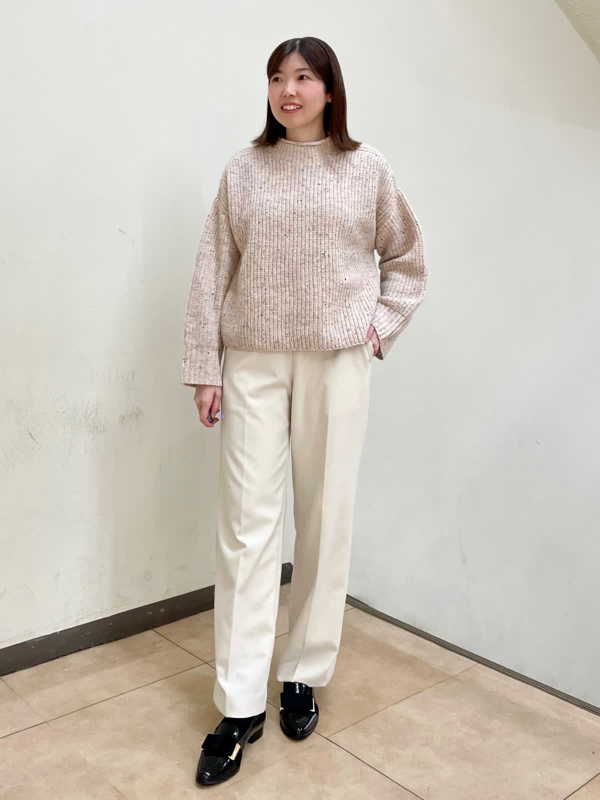 【着用サイズ】ニット:フリー パンツ:9号 カラーネップが特徴的なニットは柔らかい素材で、太めのお袖とボクシーなサイジングになっています。パンツはウエスト総ゴムになっているので楽な履き心地です。