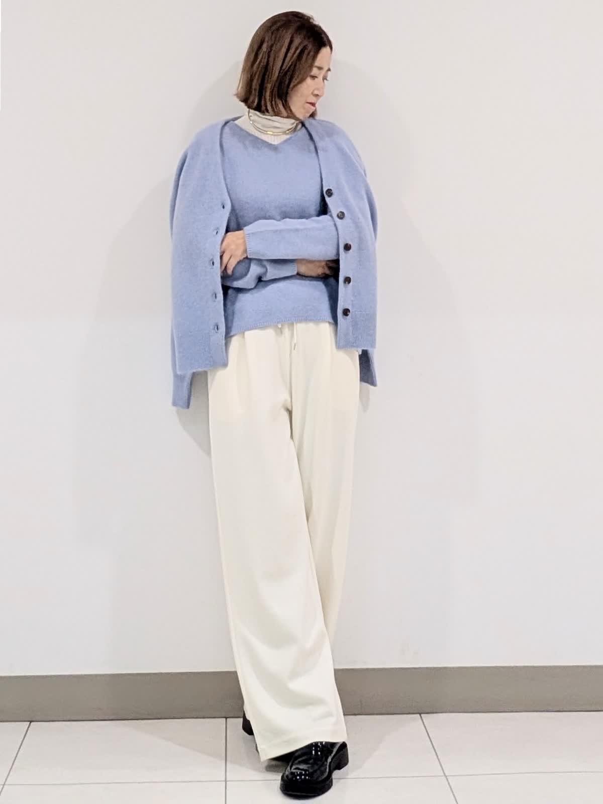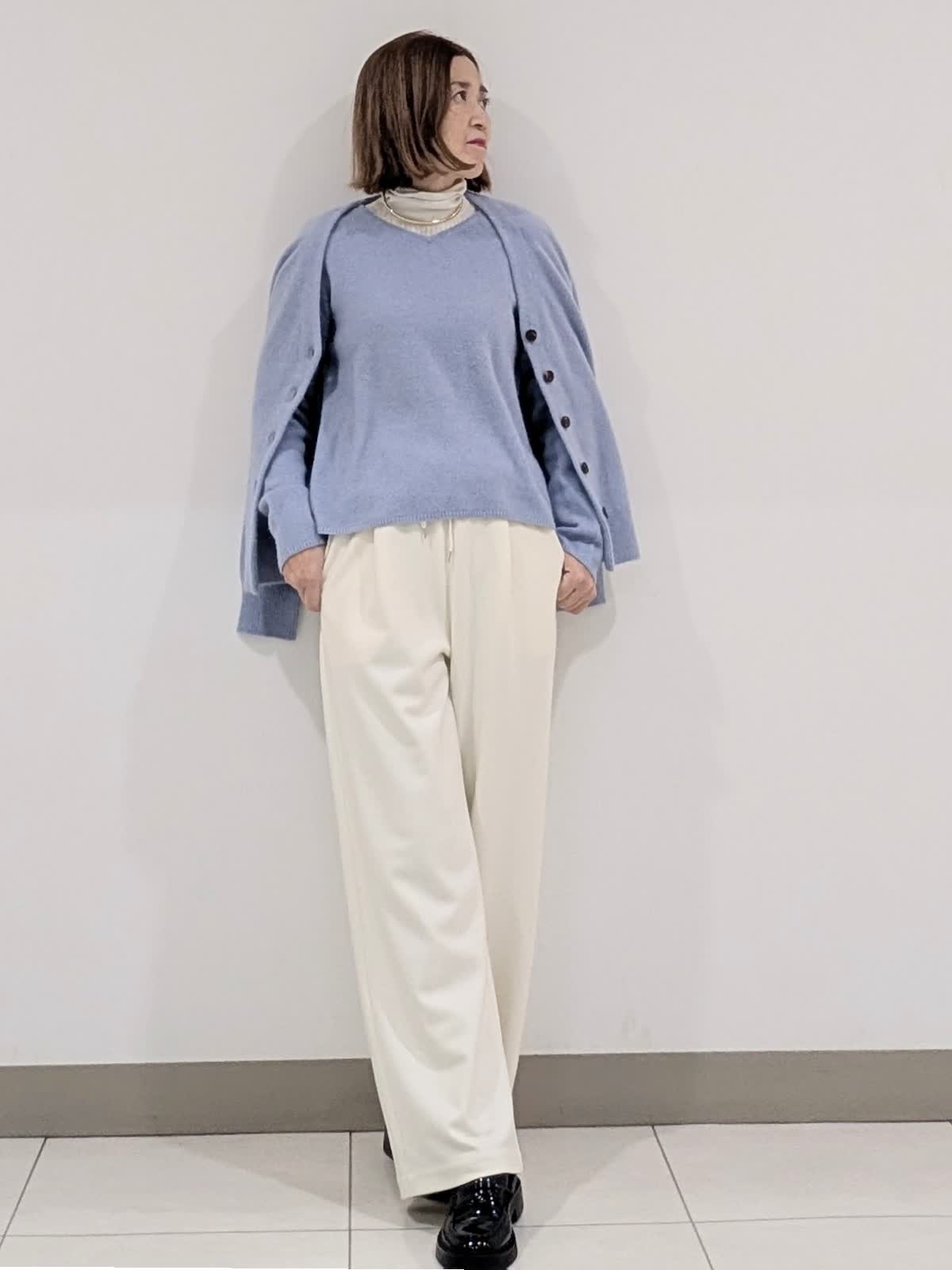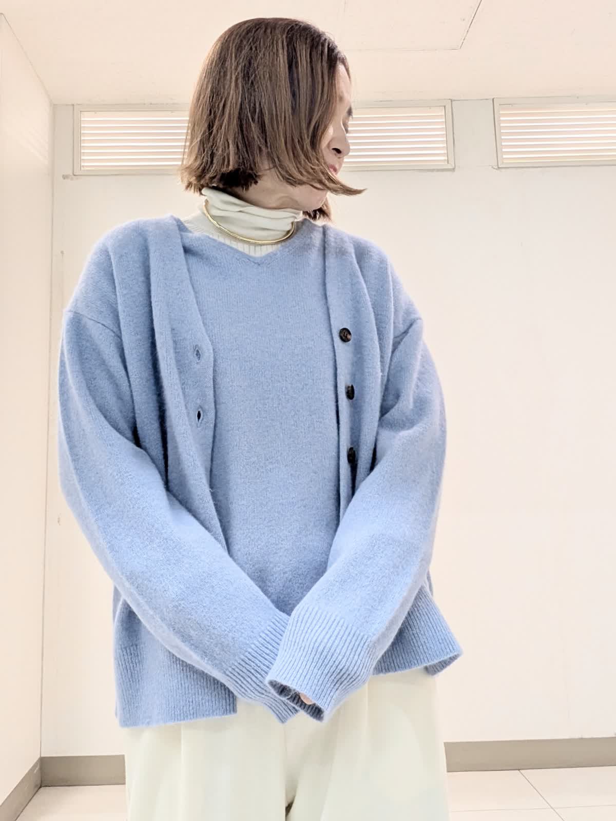 【着用サイズ 9号】 今の季節におすすめの非常に柔らかでフワフワとした質感の高級原料ラクーンを贅沢にブレンドしたファーニット素材のVネックカーディガンとプルオーバー。 軽くて、包まれる感じの着心地です。 インナーには、リブタートルを合わせてレイヤードスタイルに。 合わせたパンツは、圧縮スムーズイージーパンツ。ウエストはゴムとドロスト紐入り仕様で、リラックス感があり脚を長くきれいにみせてくれるシルエットが魅力です。