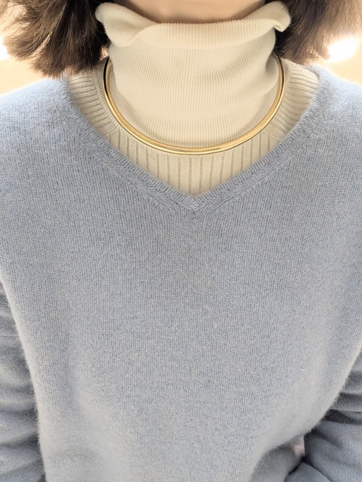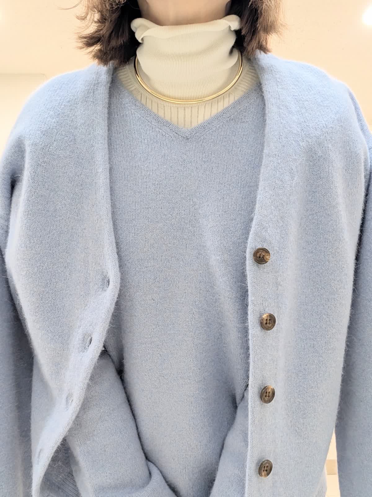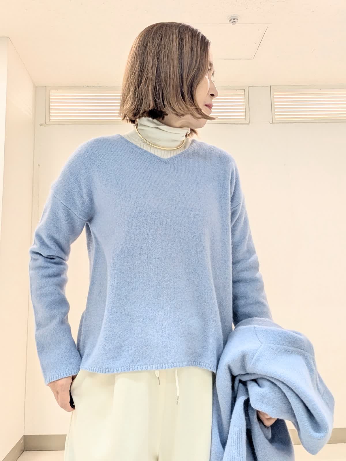 【着用サイズ 9号】 今の季節におすすめの非常に柔らかでフワフワとした質感の高級原料ラクーンを贅沢にブレンドしたファーニット素材のVネックカーディガンとプルオーバー。 軽くて、包まれる感じの着心地です。 インナーには、リブタートルを合わせてレイヤードスタイルに。 合わせたパンツは、圧縮スムーズイージーパンツ。ウエストはゴムとドロスト紐入り仕様で、リラックス感があり脚を長くきれいにみせてくれるシルエットが魅力です。