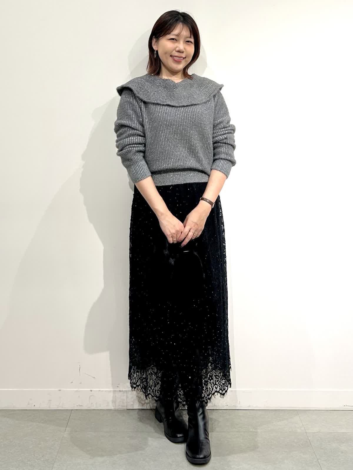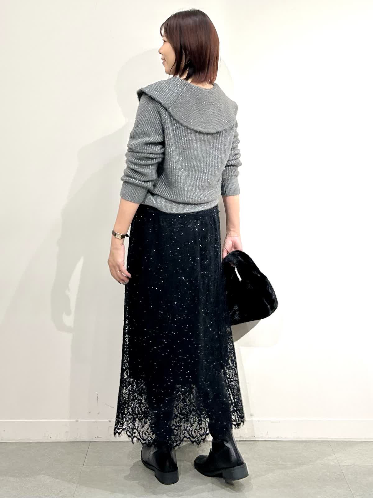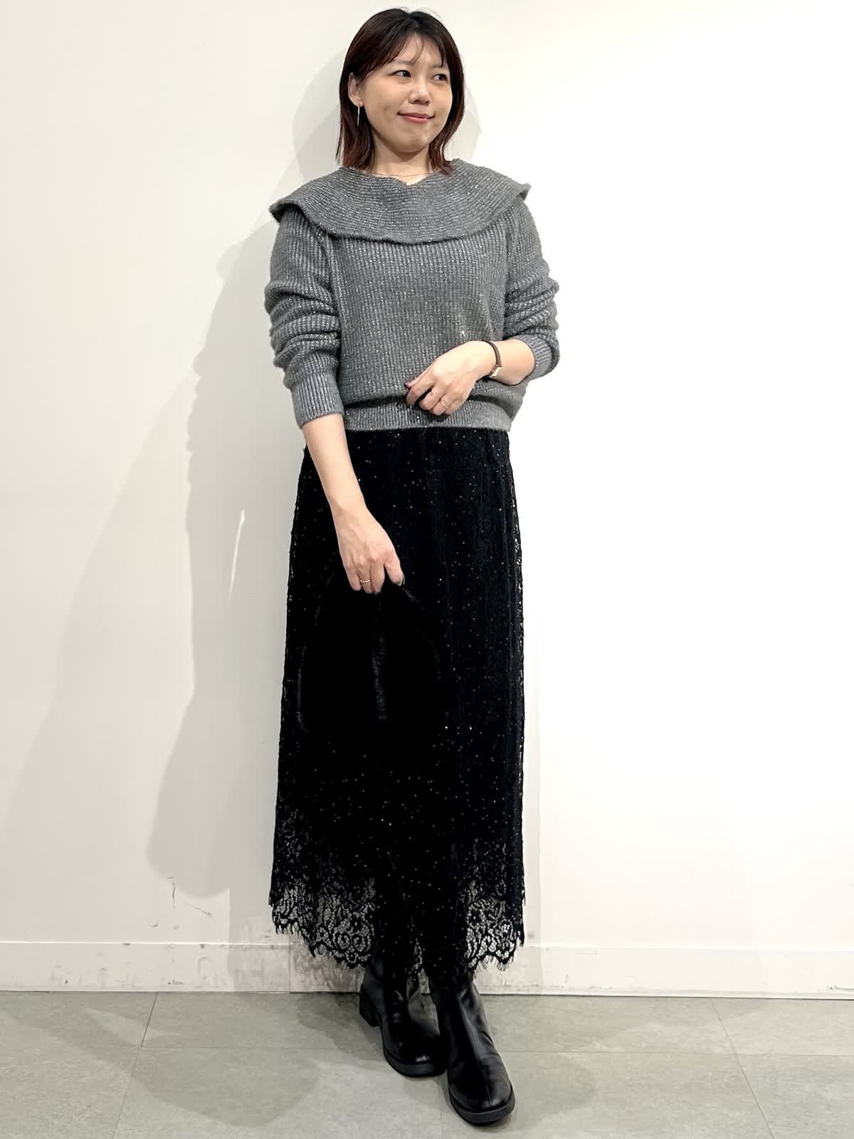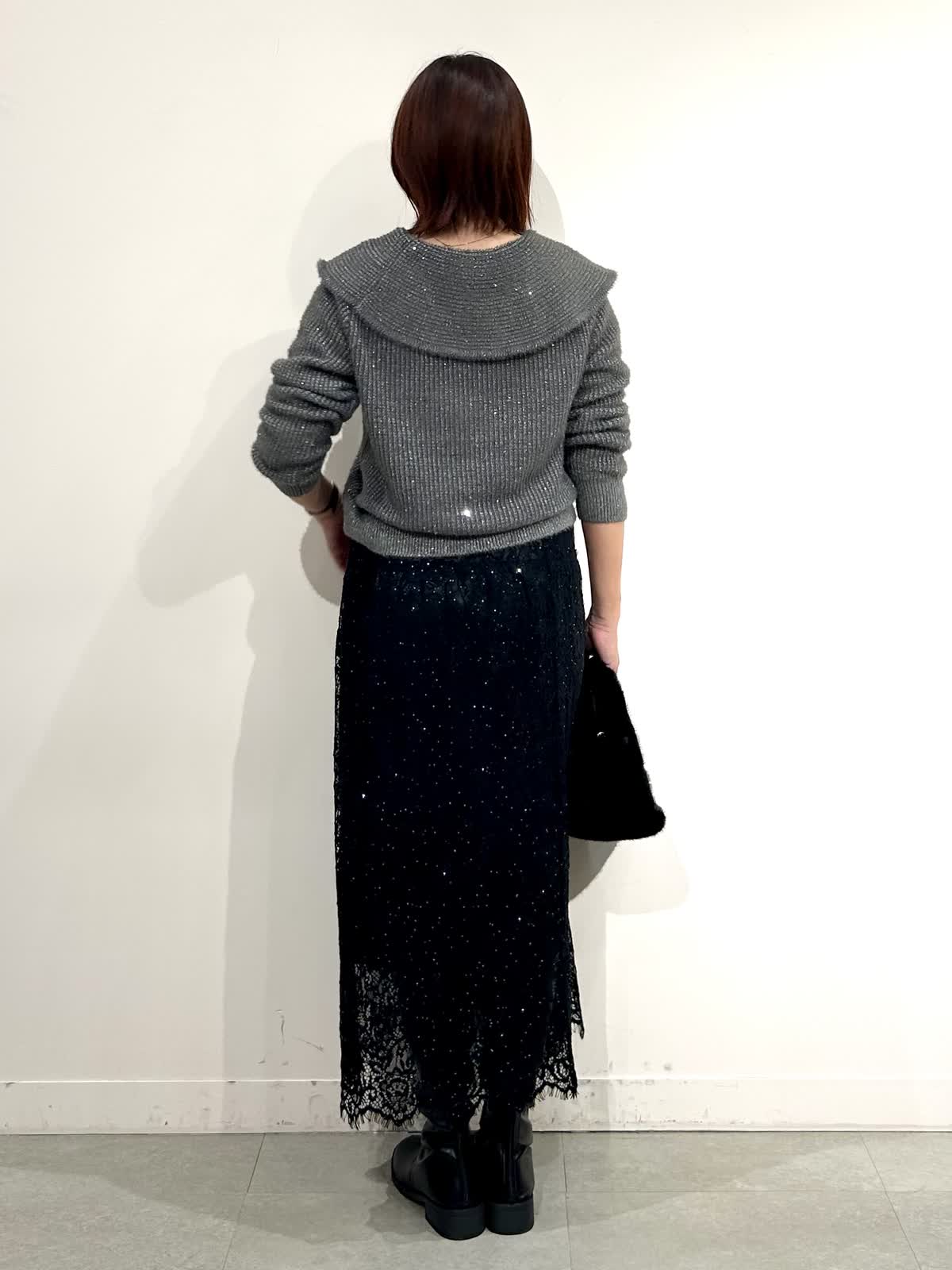 【着用サイズ】全て9号 【着用カラー】ニット:グレー スカート:ブラック 小さななスパンコールが散りばめられたニットとスカートの組み合わせは年末年始のお出かけコーデにピッタリです。 ニットはオフショル風な衿が顔まわりを華やかに見せてくれて、レーススカートは広がらずにすっきりと見せてくれます。