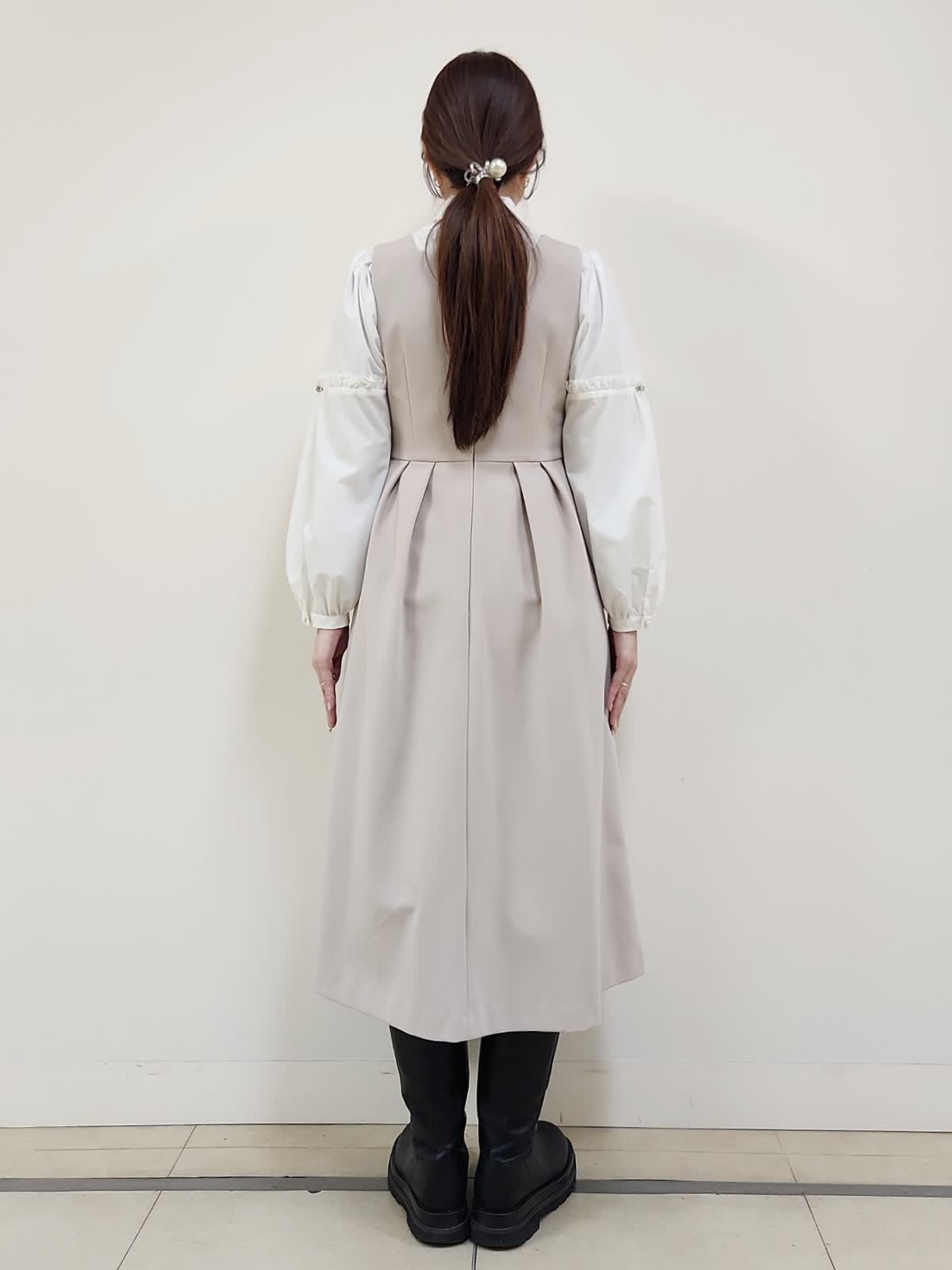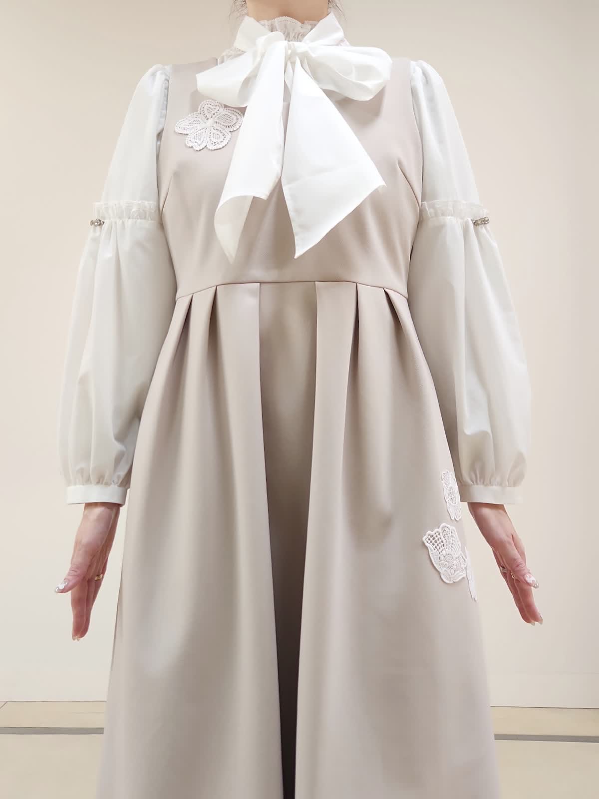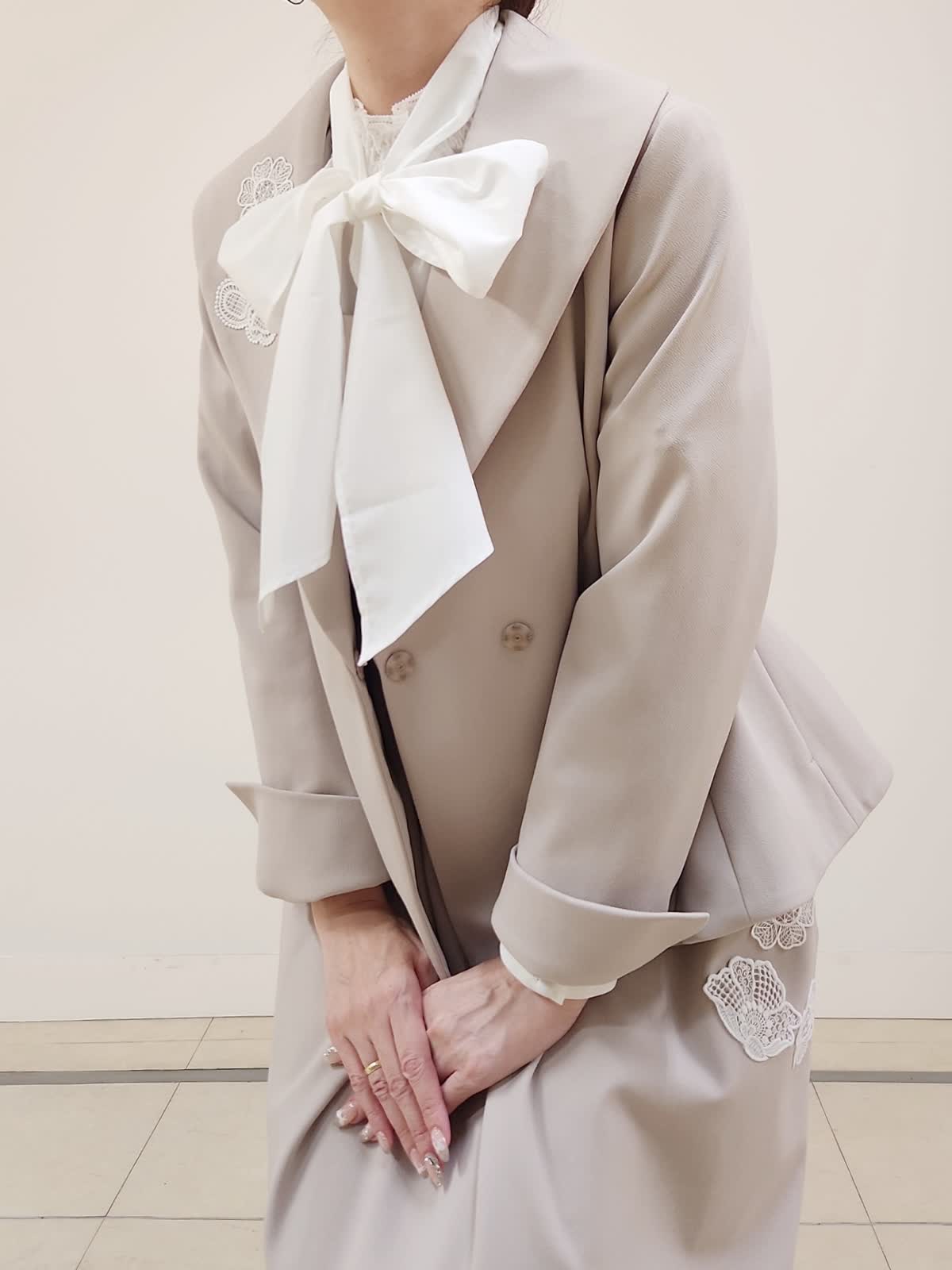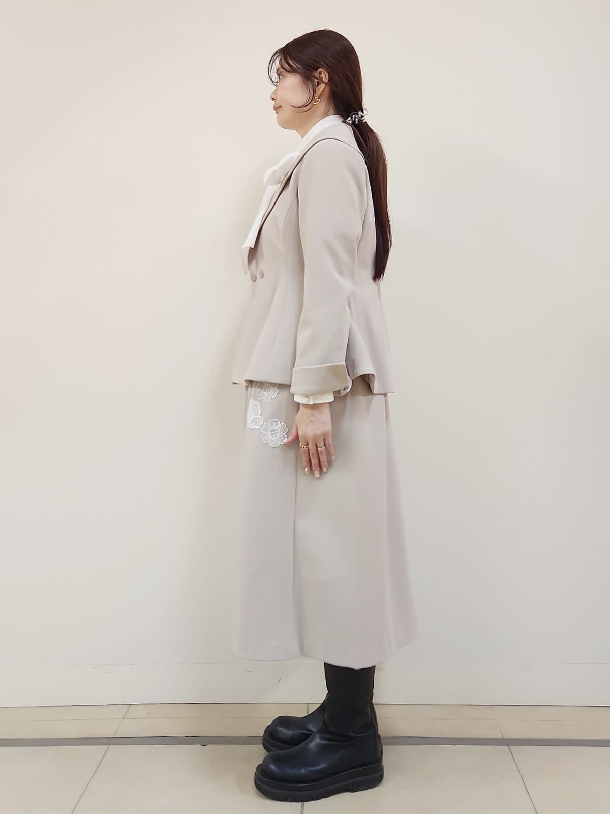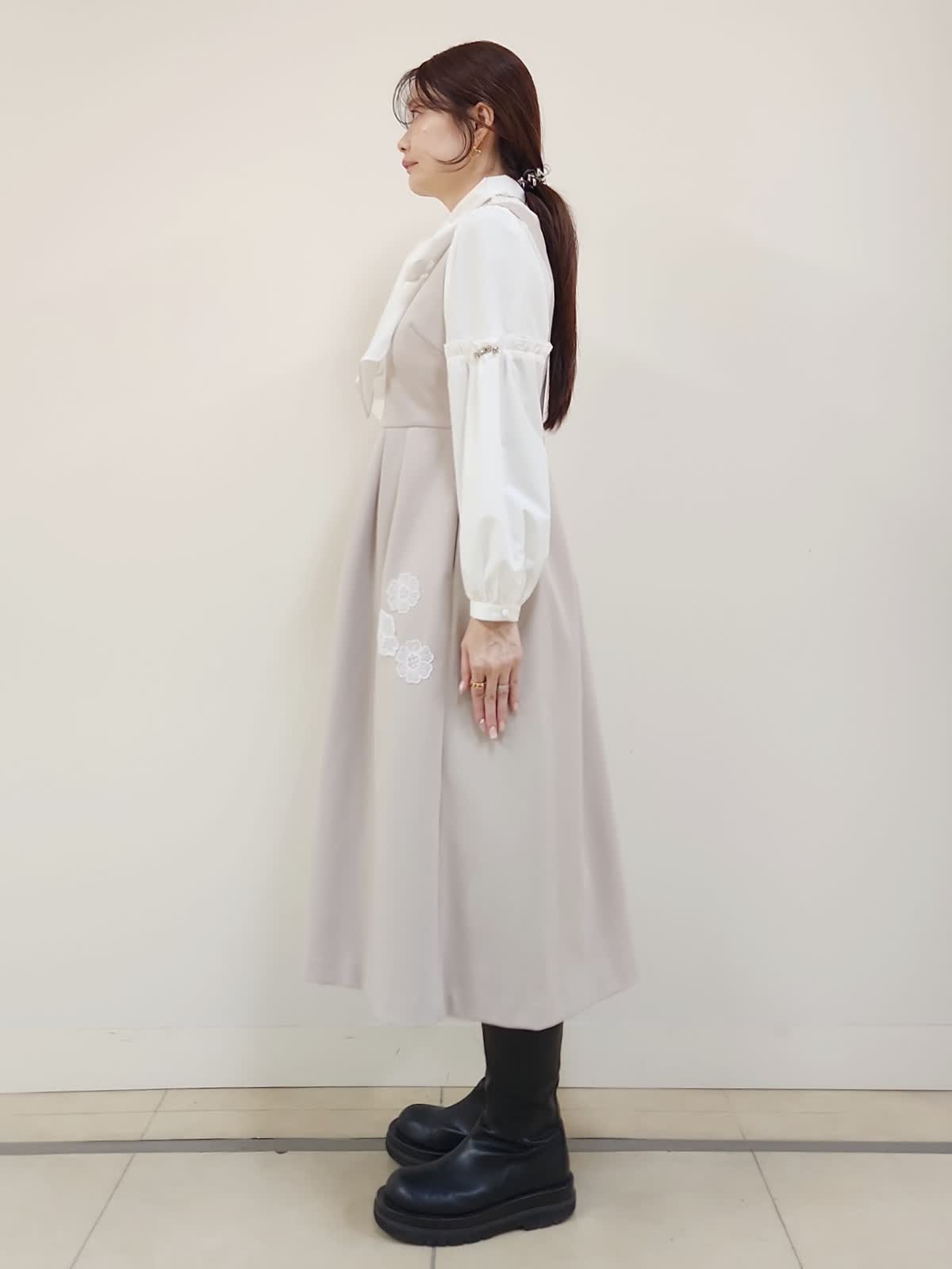 【着用サイズ】ジャケット:9号/ベージュ ワンピース:9号/ベージュ ブラウス:9号/オフホワイト Maglieオリジナルの刺繍レースがポイントのセットアップコーデ。ジャンスカはカジュアル過ぎないのでジャケットとセットで着る事できちんと感有り。ジャケットはセットインのお作りなのでゆったりせず、ジャストサイズでした。ベルト付きですが、写真はベルト無しで着用しております。