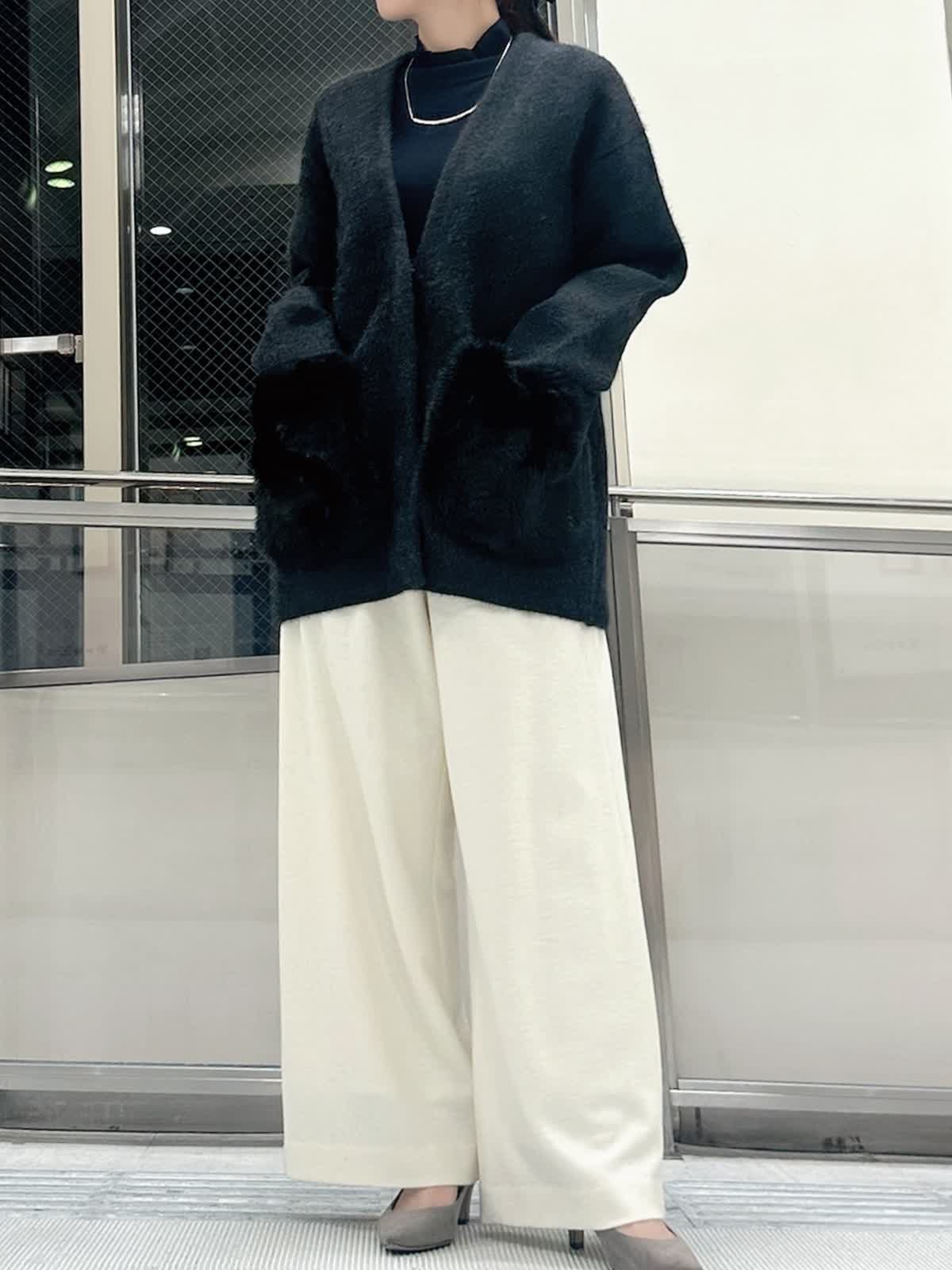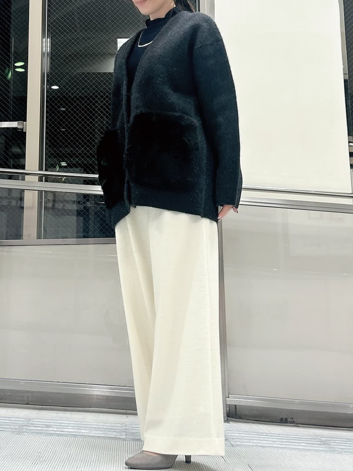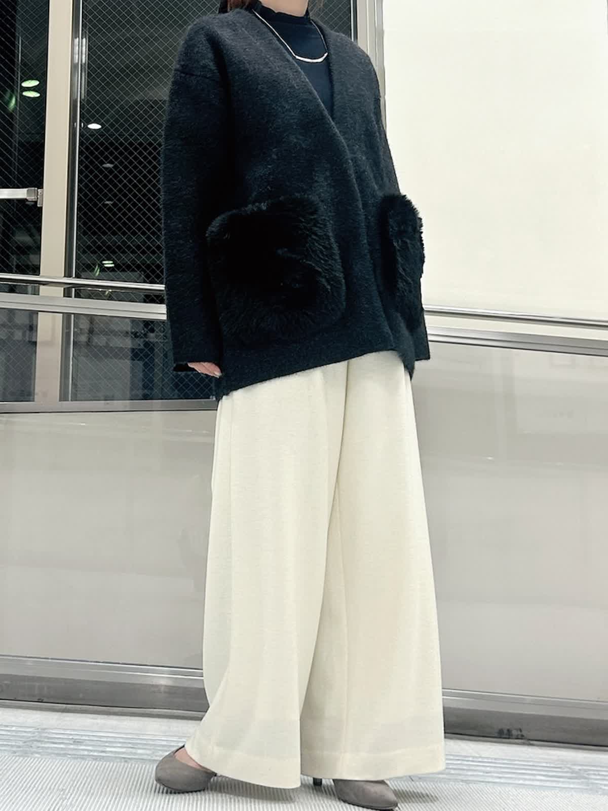 【着用サイズ/カラー】 ニットジャケット:フリー/チャコールグレー ニット:フリー/ネイビー パンツ:9号/オフホワイト 着回し力の高いチャコールグレーのニットジャケットは、ミドル丈でパンツと合わせてもヒップまで隠してくれる安心の1枚。コートよりも気負わず着られるのでデイリー使いに重宝します。 定番シルエットもふわふわのファーポケットで、羽織るだけで大人かわいいコーデが完成します。